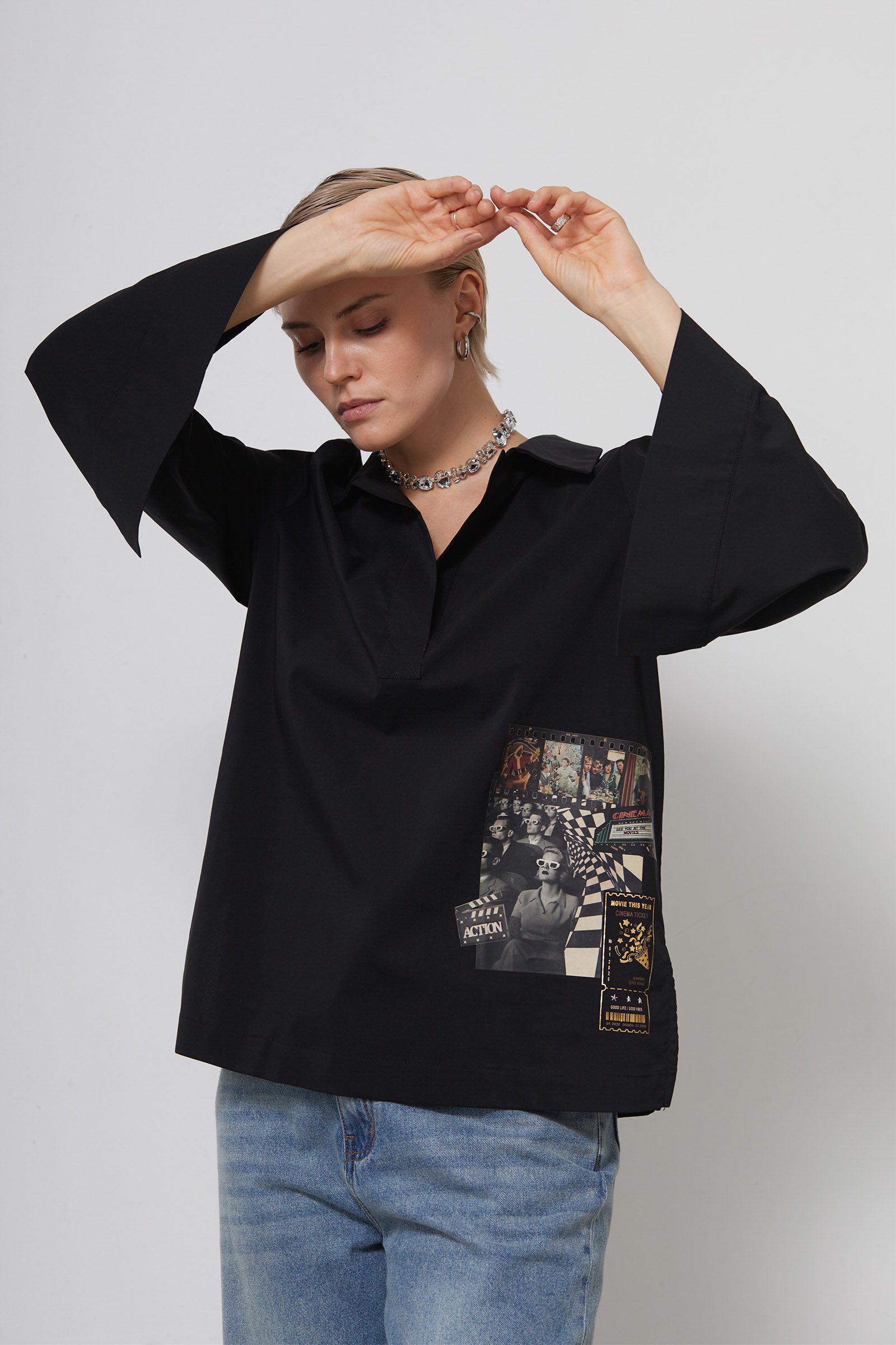 Рубашка oversize из гладкого хлопка с печатным принтом и разрезами на рукавах.