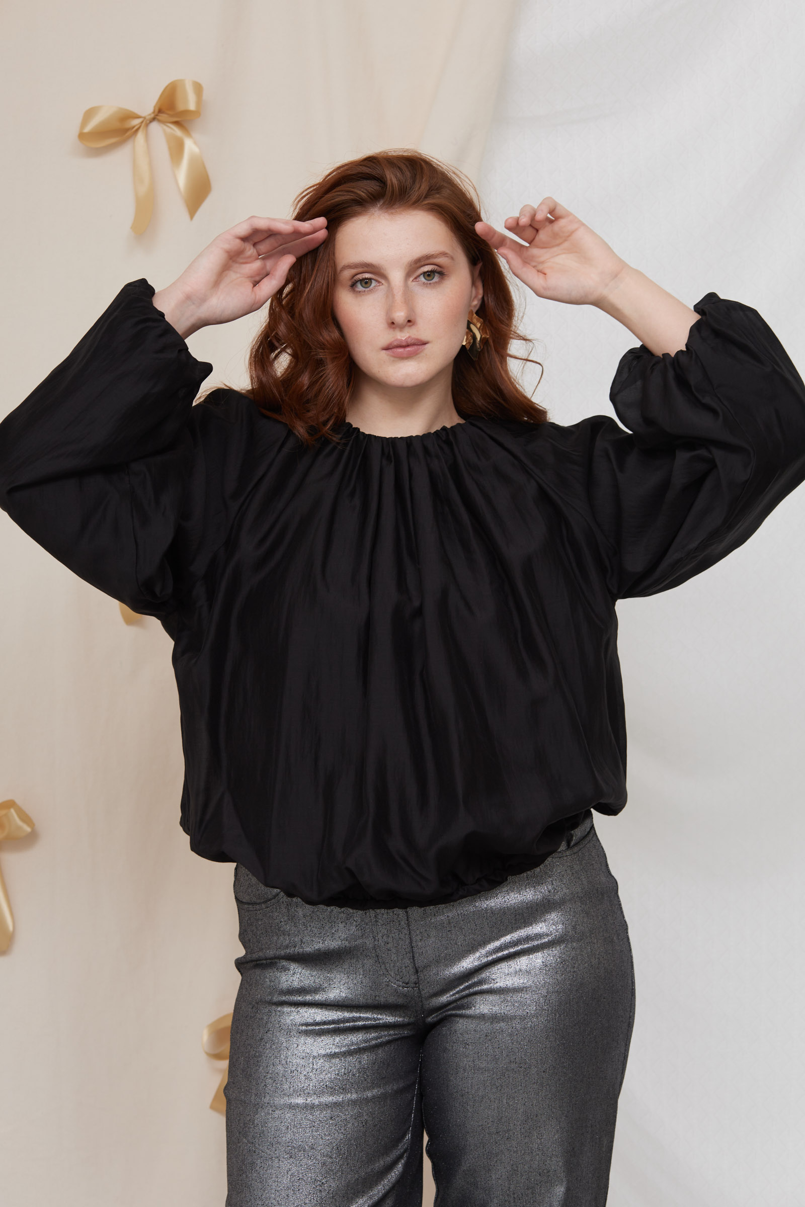 - Сборка на резинке по горловине, нижнему краю и низу рукавов