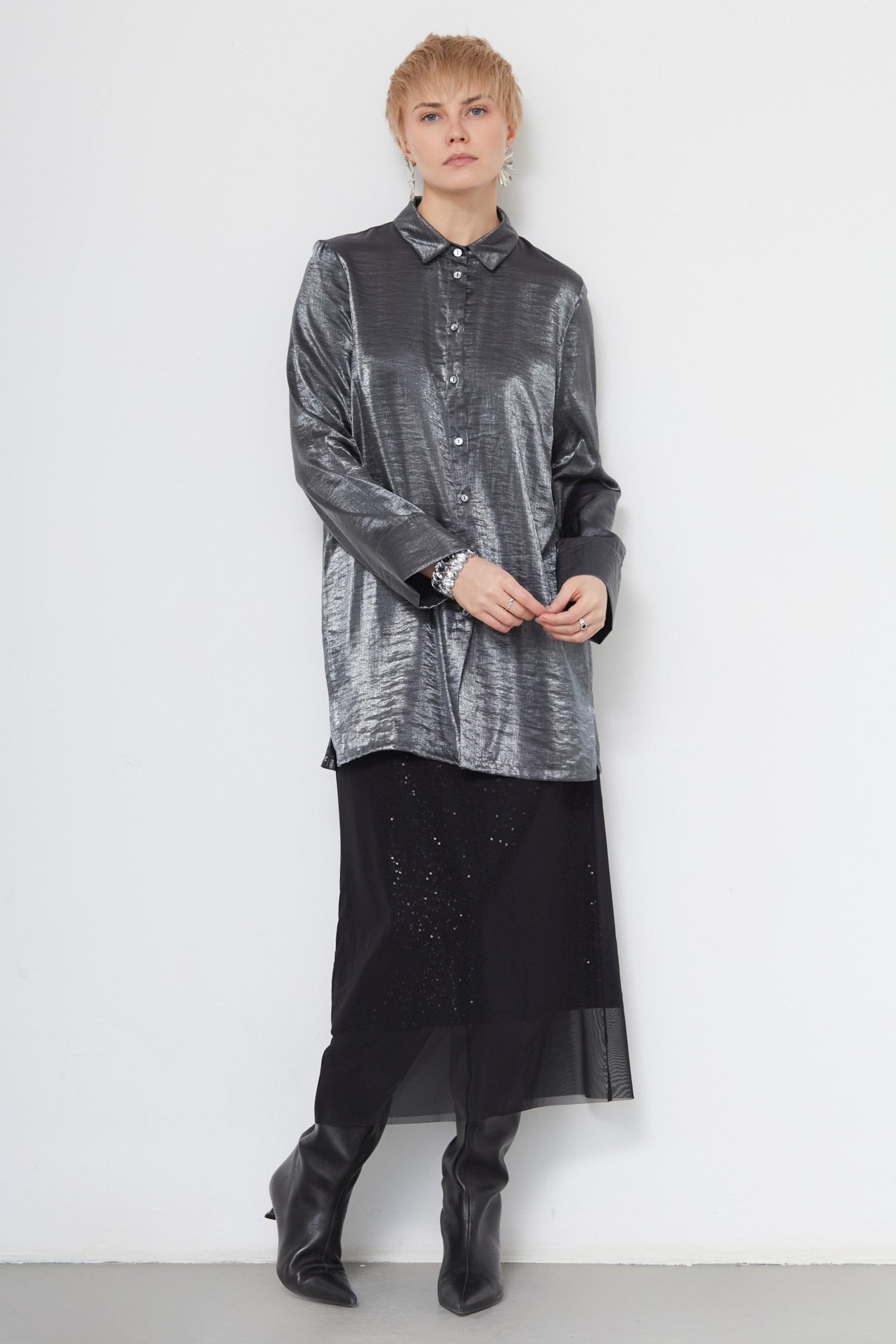 Удлиненная блузка oversize из смесовой вискозы с эффектом металлик.