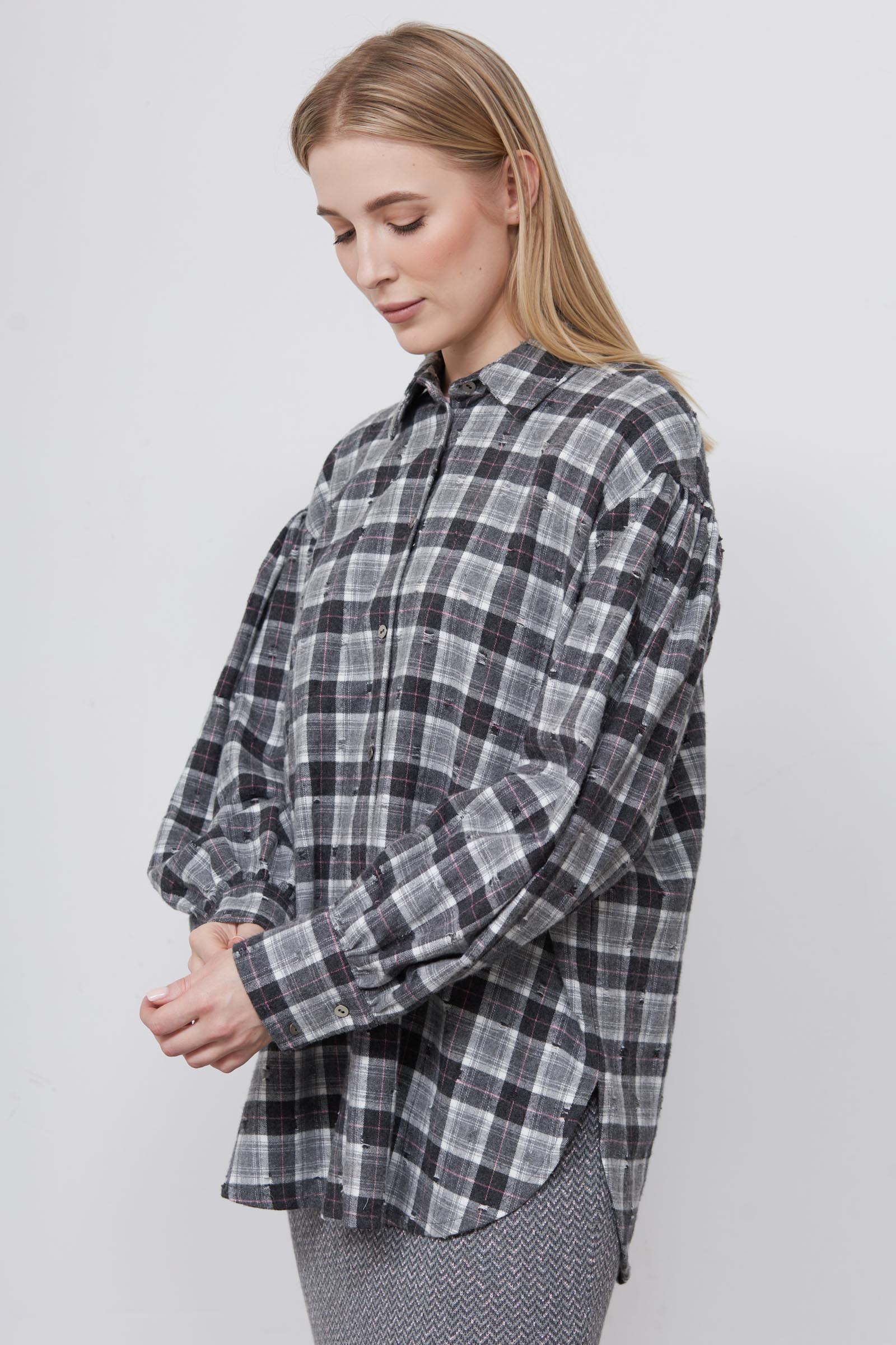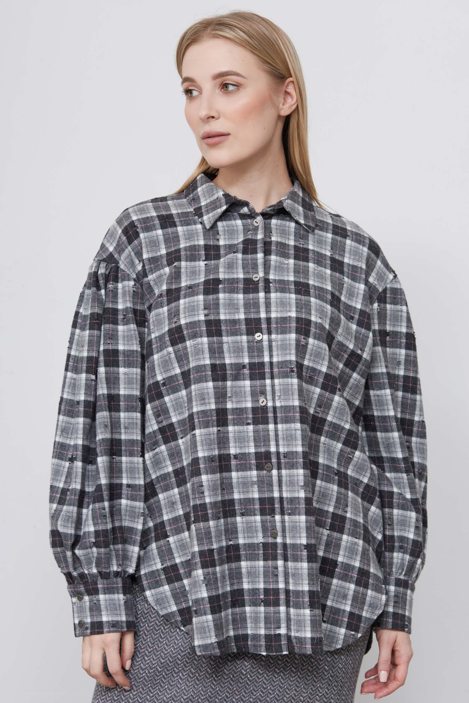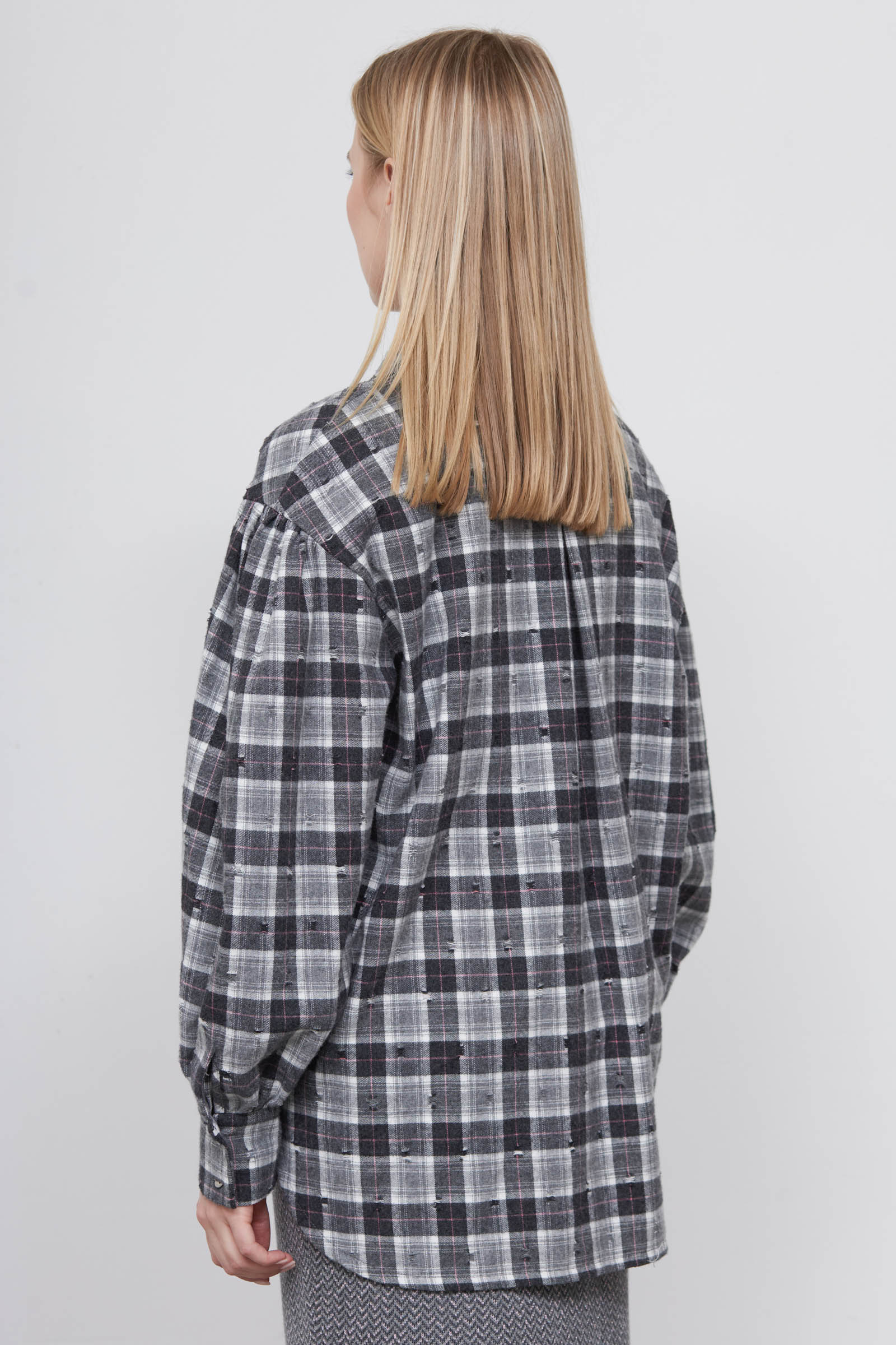 Фланелевая рубашка oversize в клетку с декоративными потертостями и рукавами буфами.