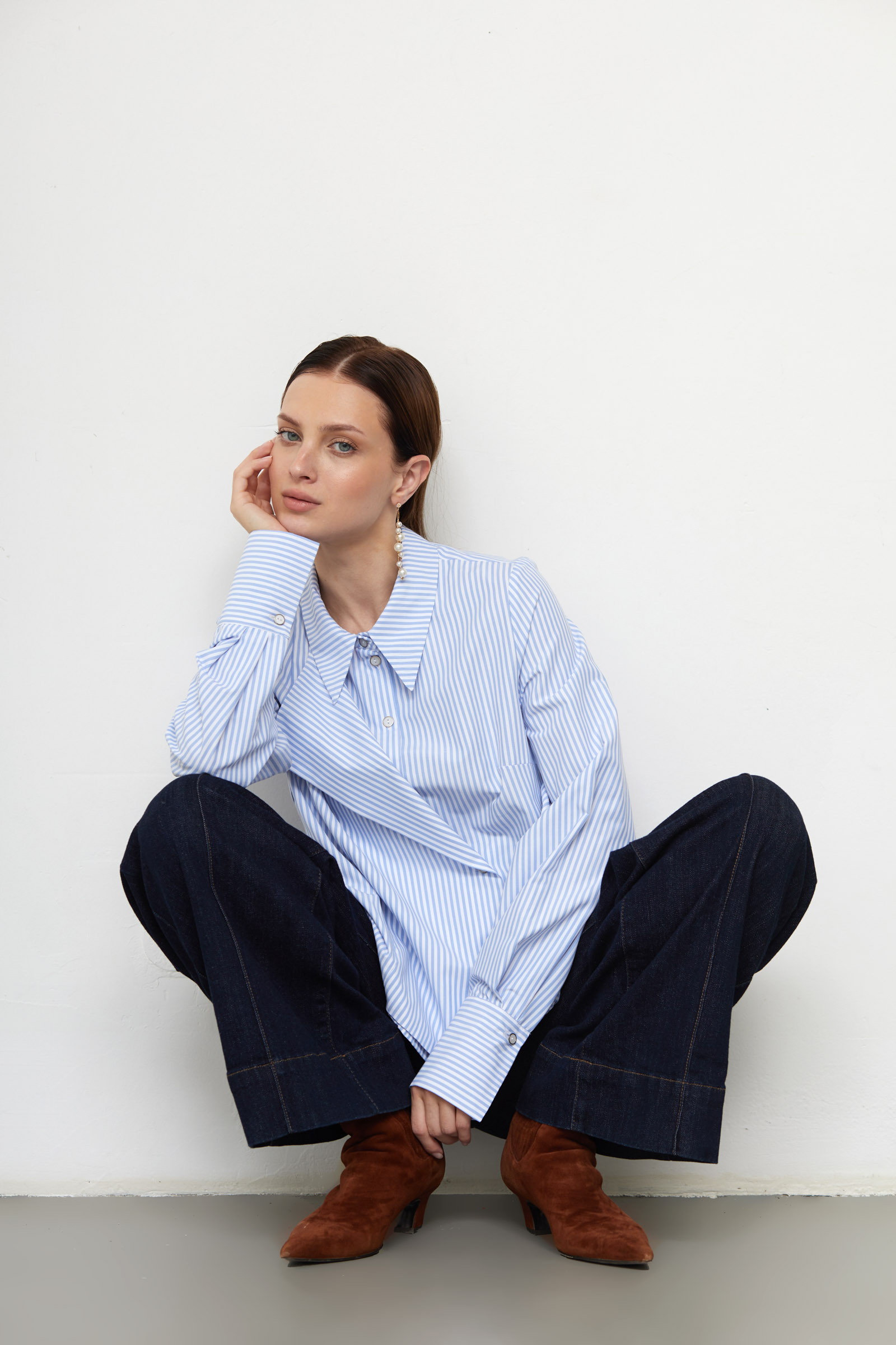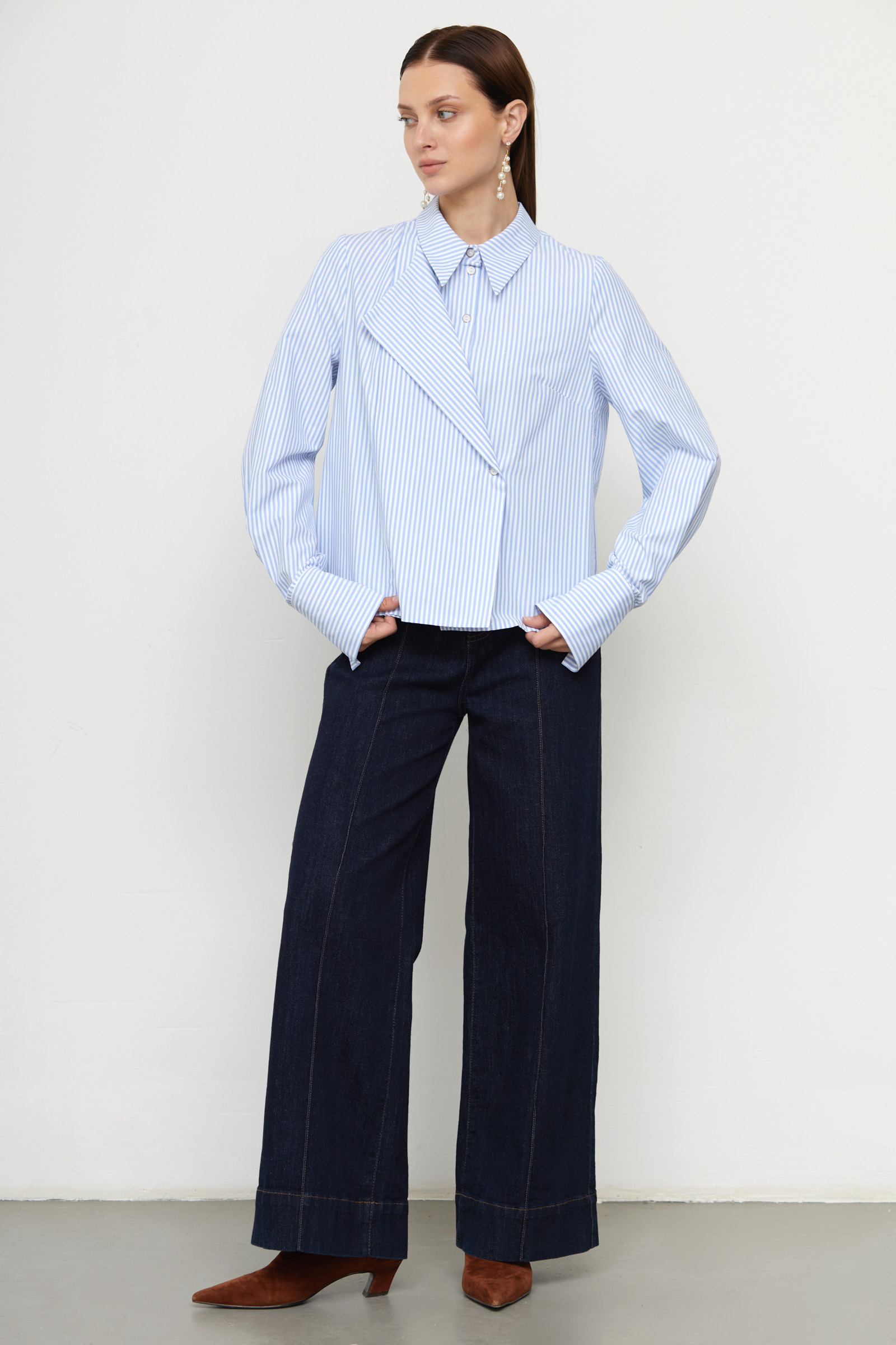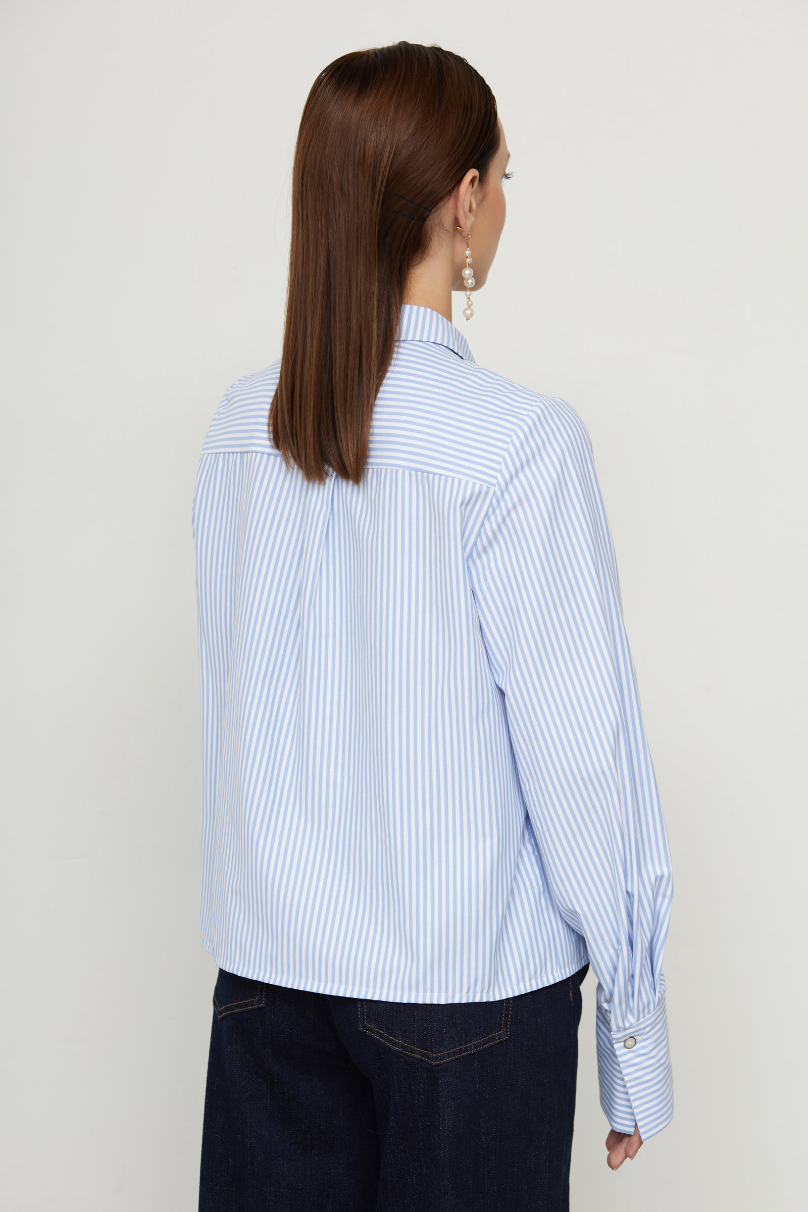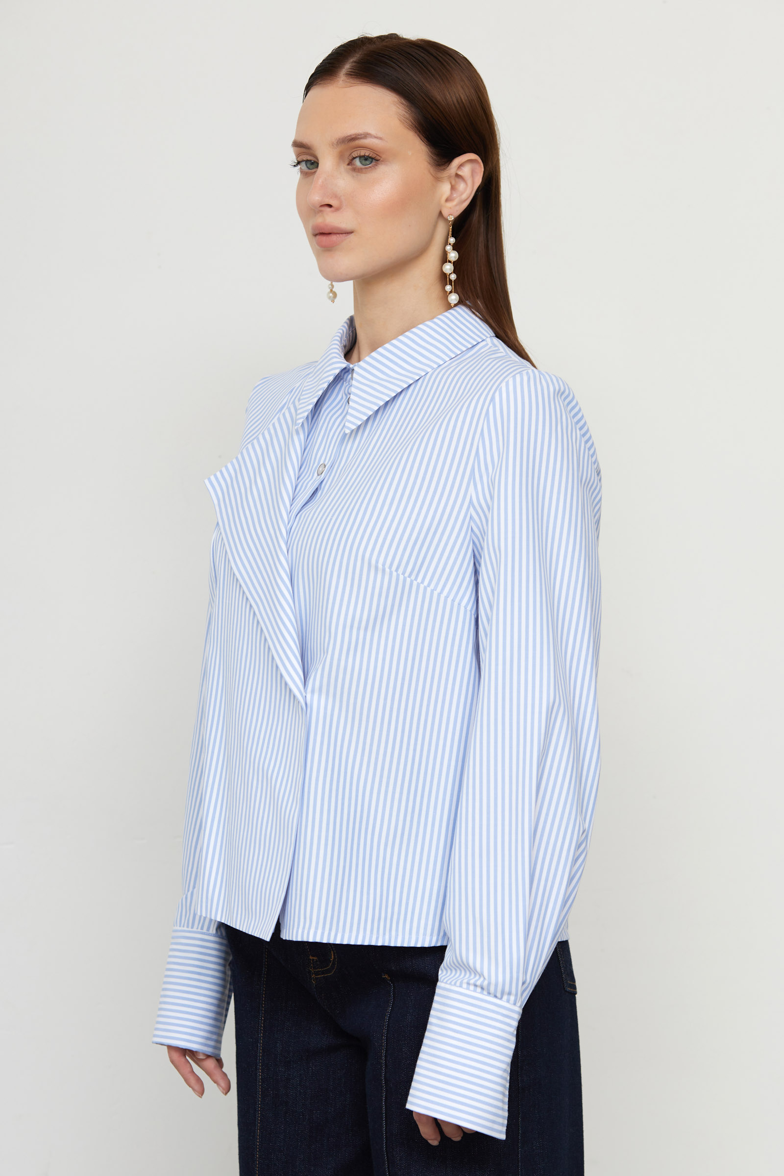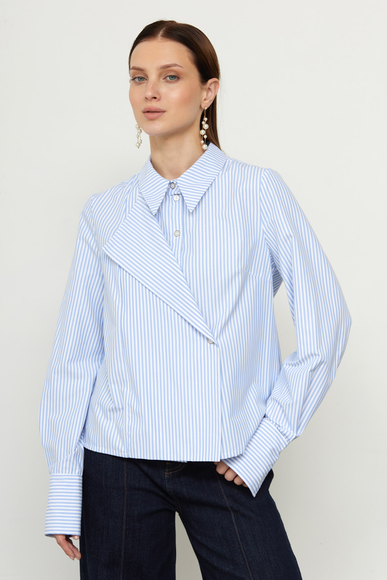 Слегка укороченная блузка из хлопка в полоску с отлетной полочкой.