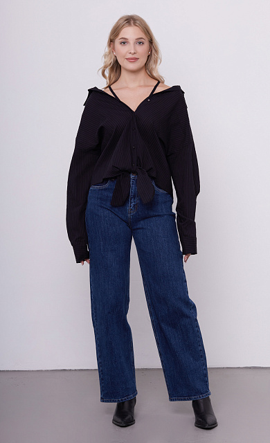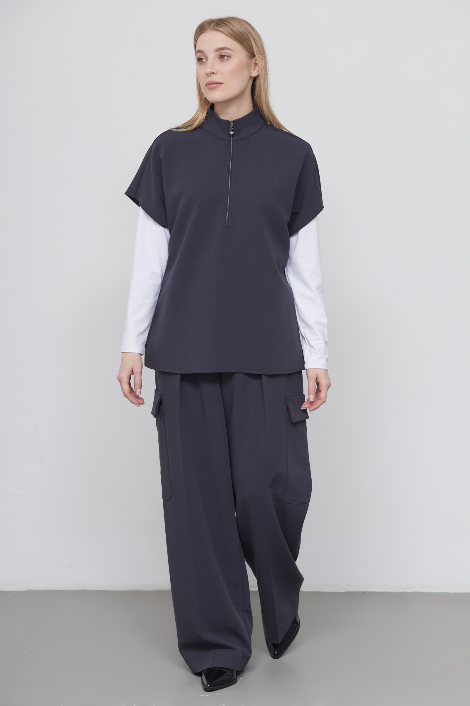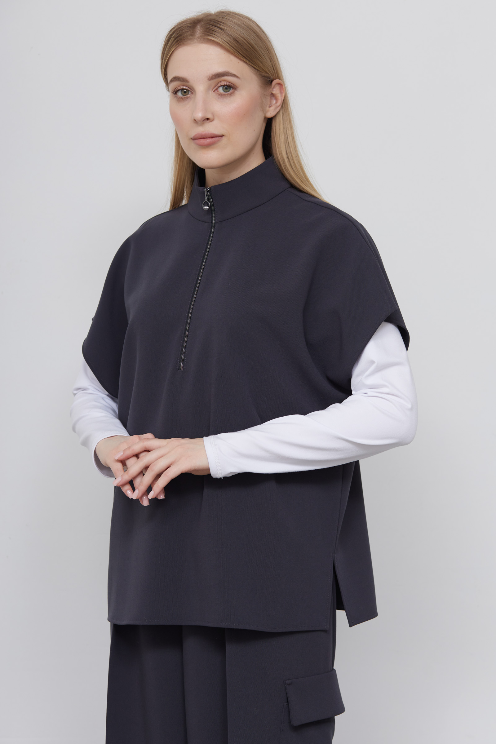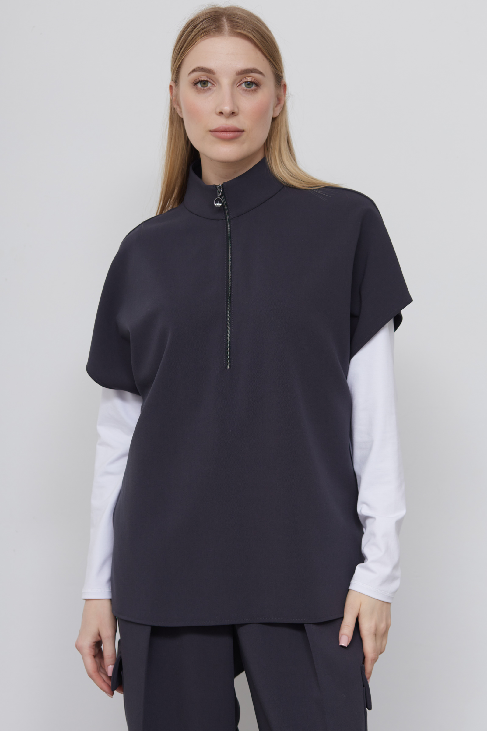 Блузка oversize из поливискозы с короткими рукавами и высоким воротником.