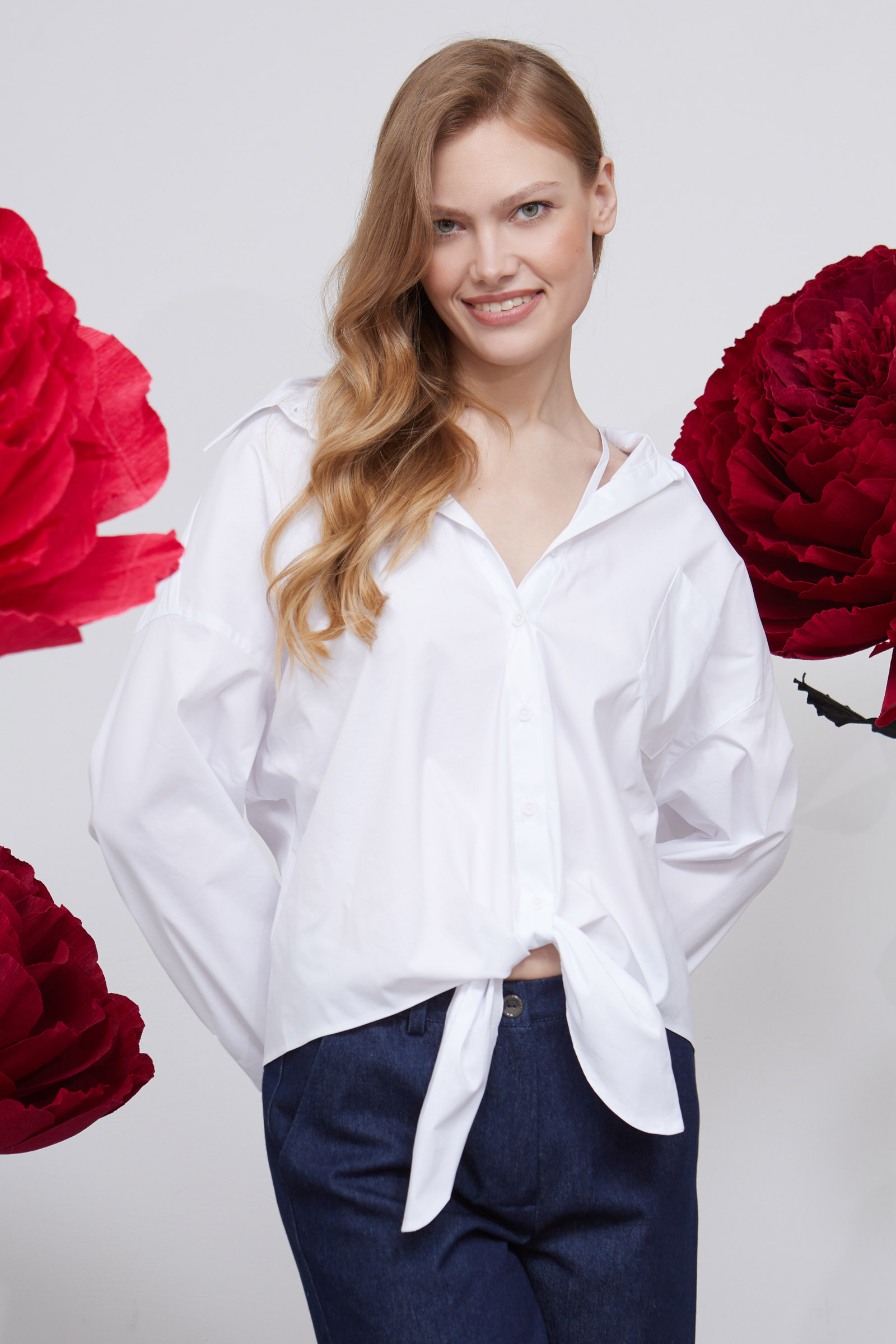 Укороченная блузка трансформер из хлопка с завязками по низу.