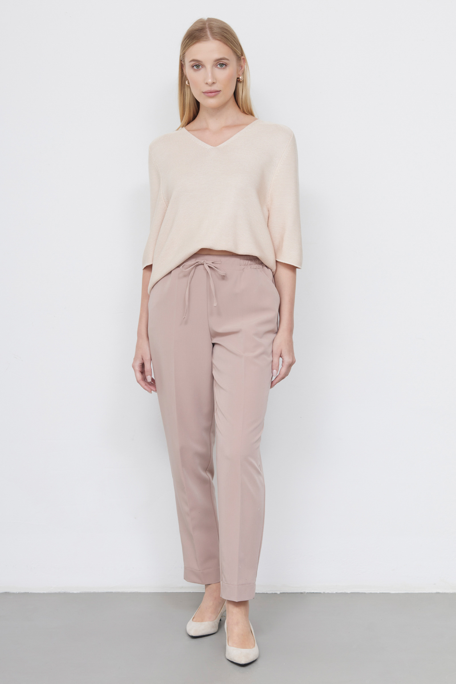 Классические зауженные брюки из поливискозы на эластичном поясе с кулиской.