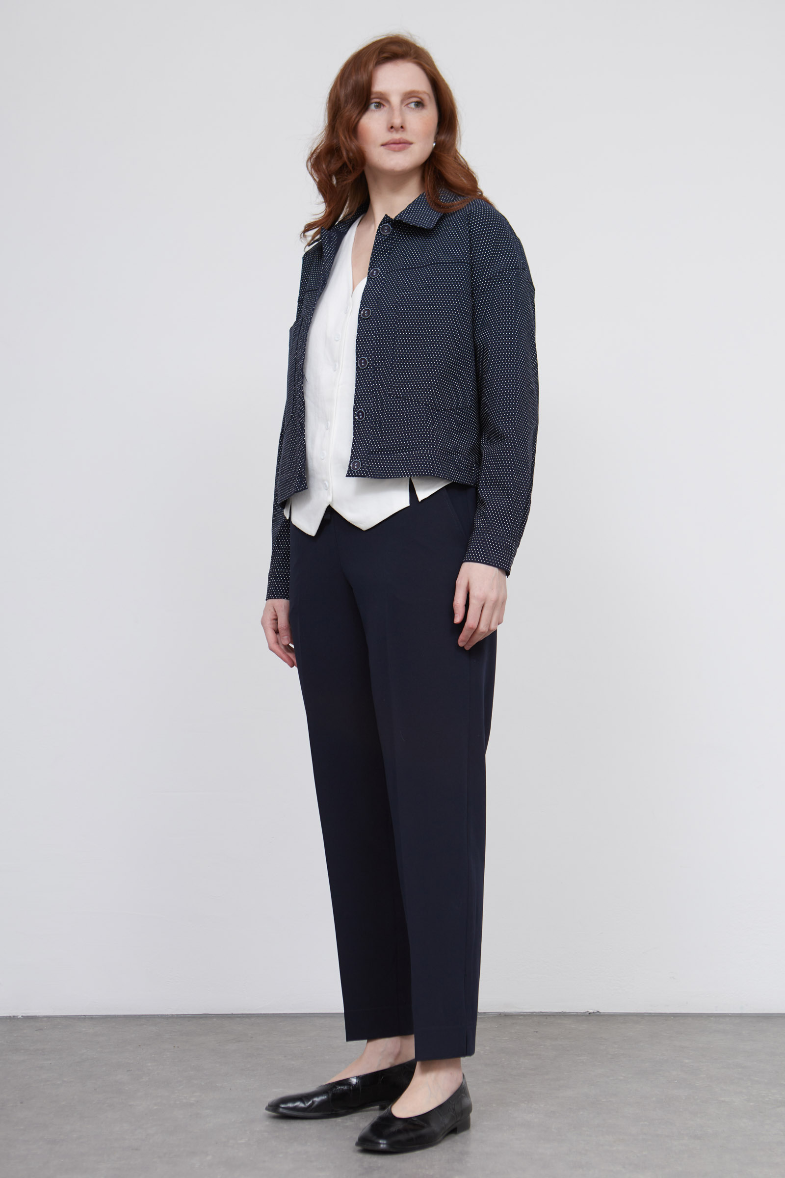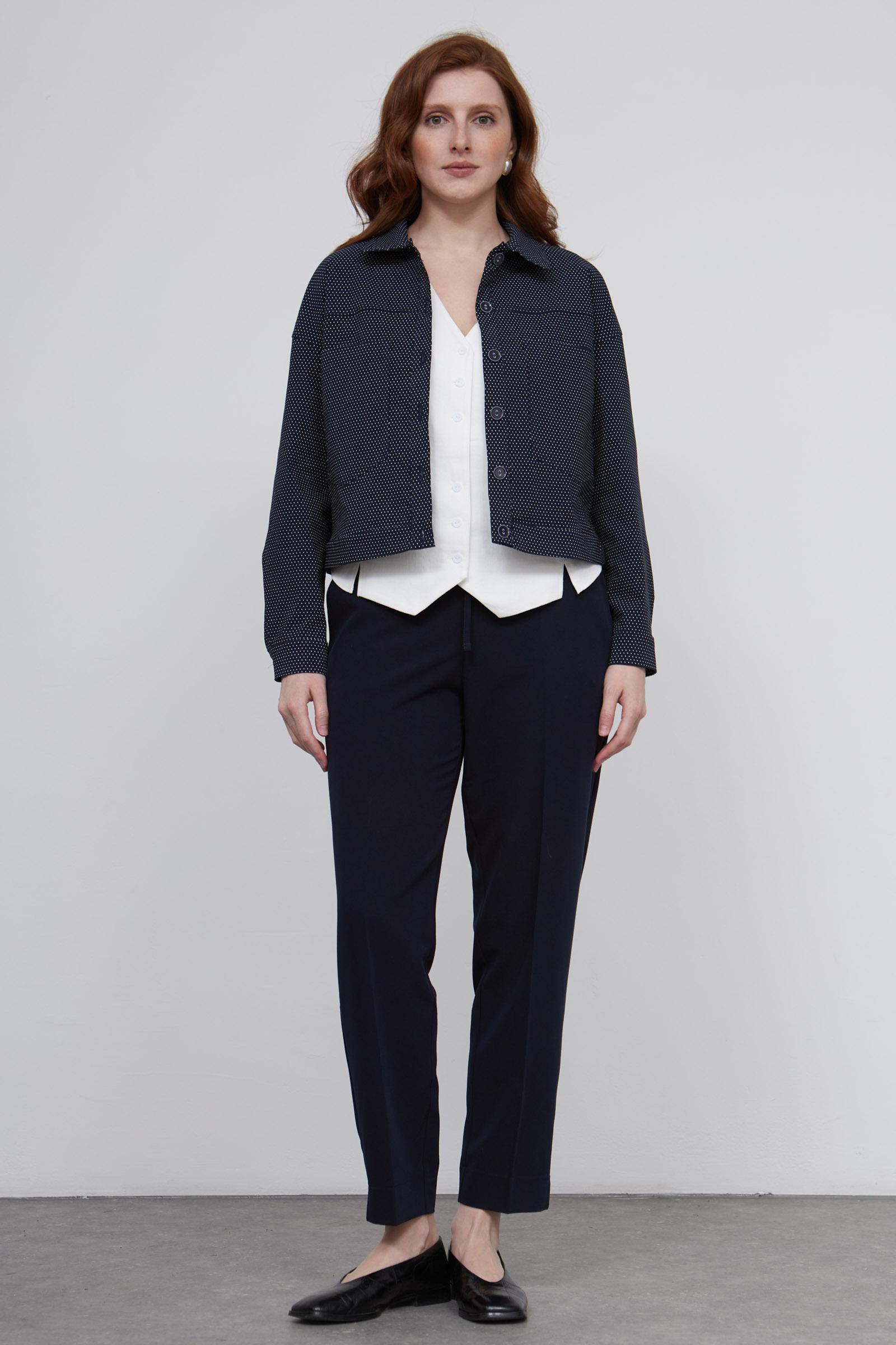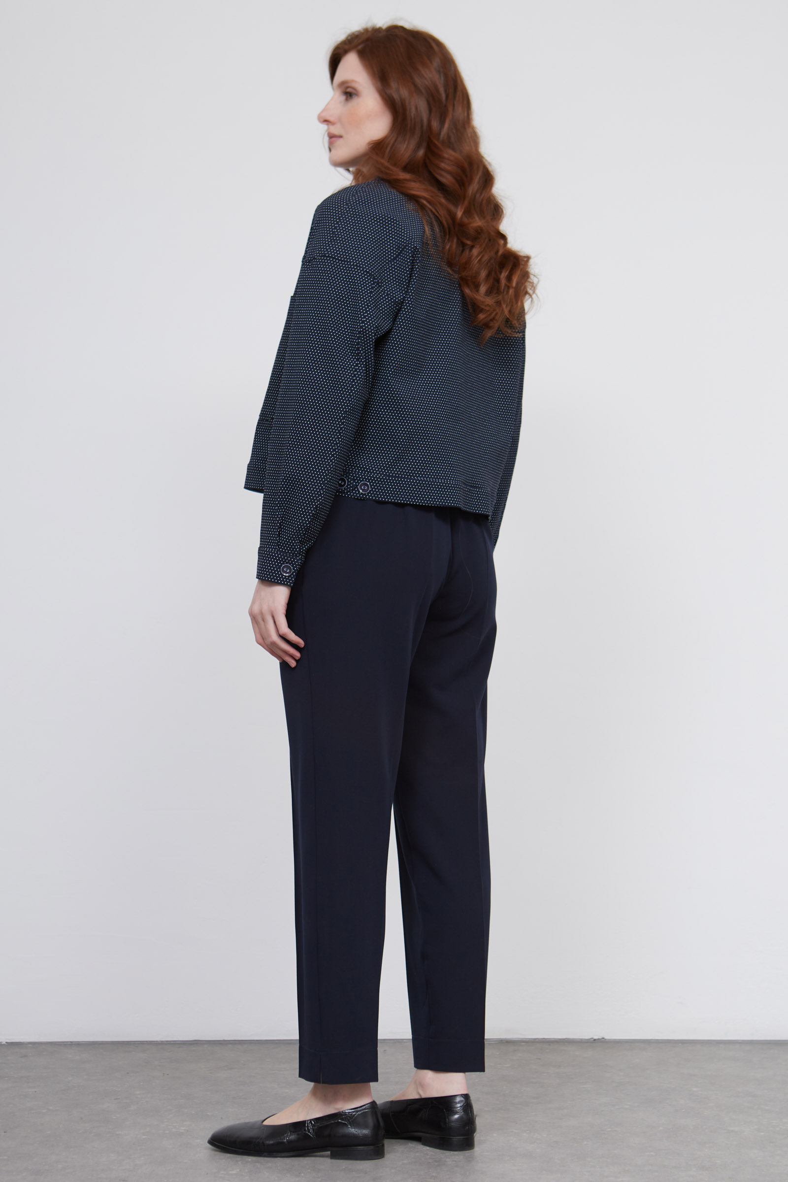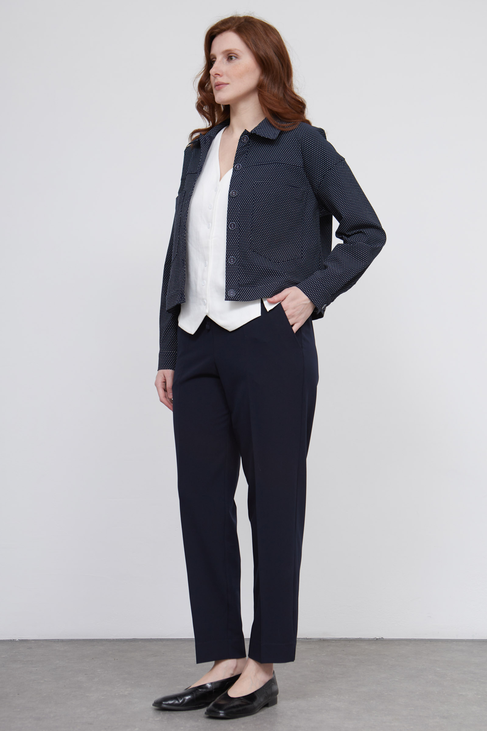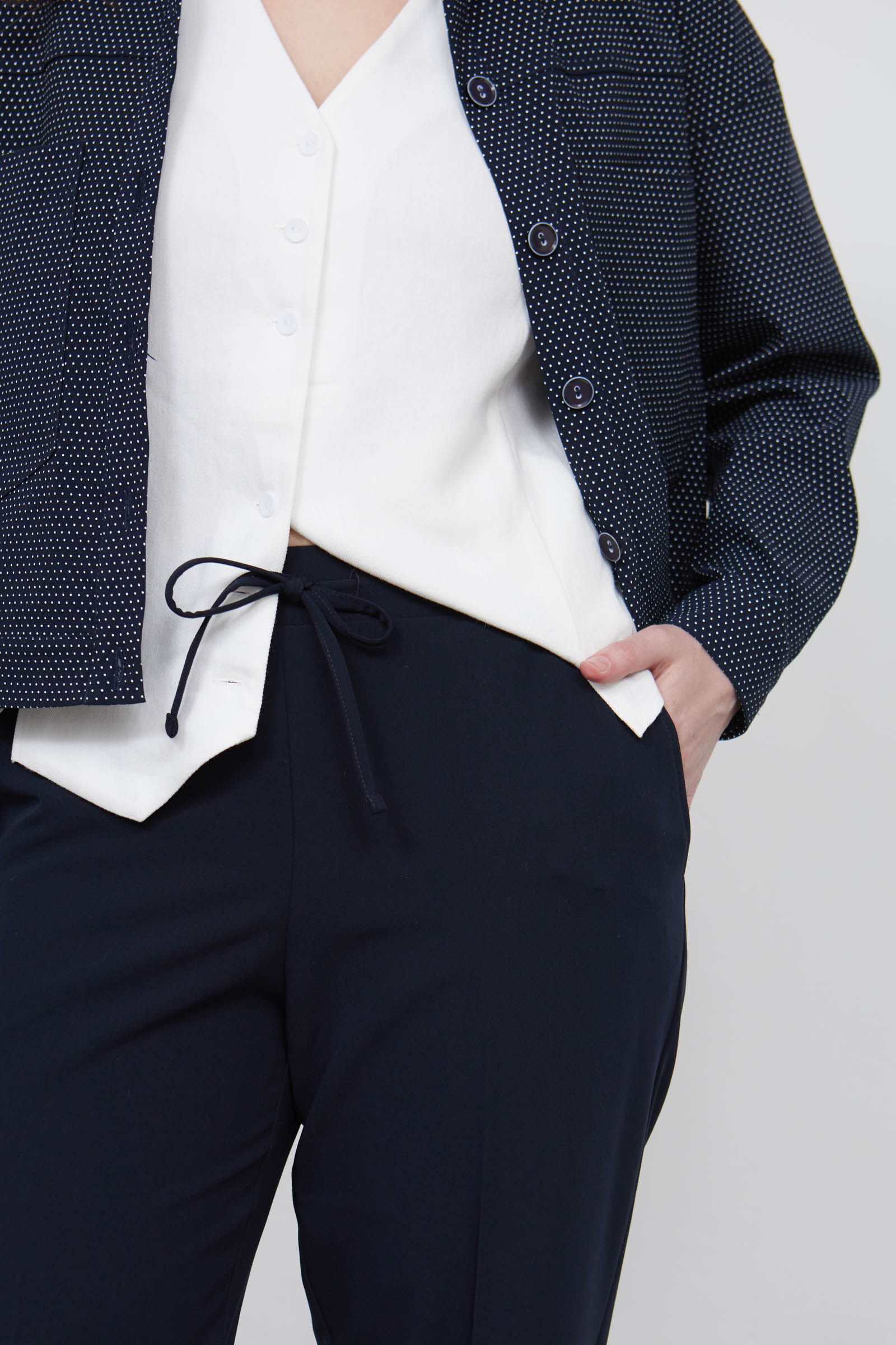 Классические зауженные брюки со стрелками на эластичном поясе с кулиской.