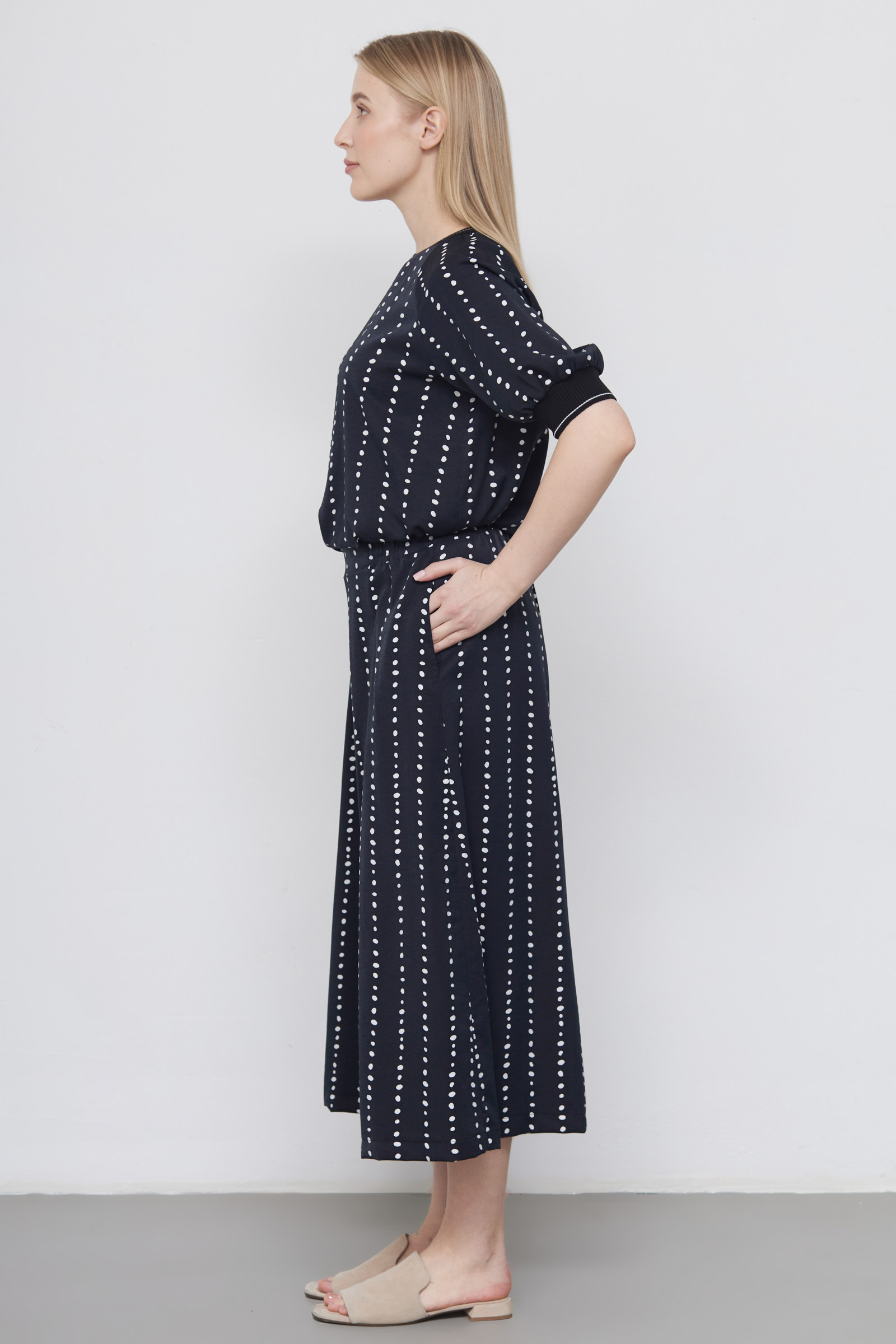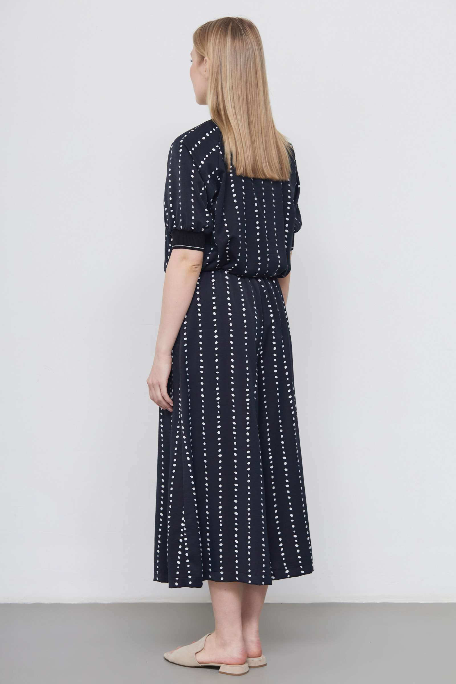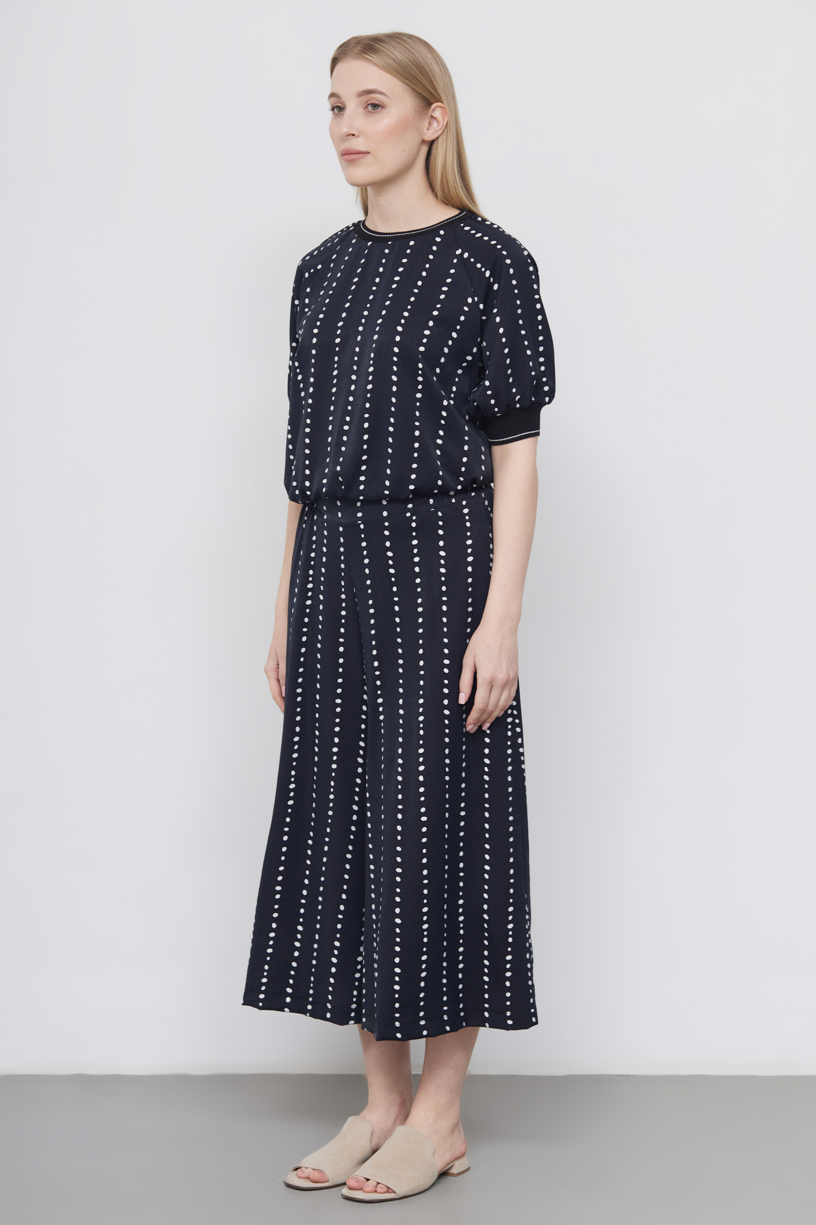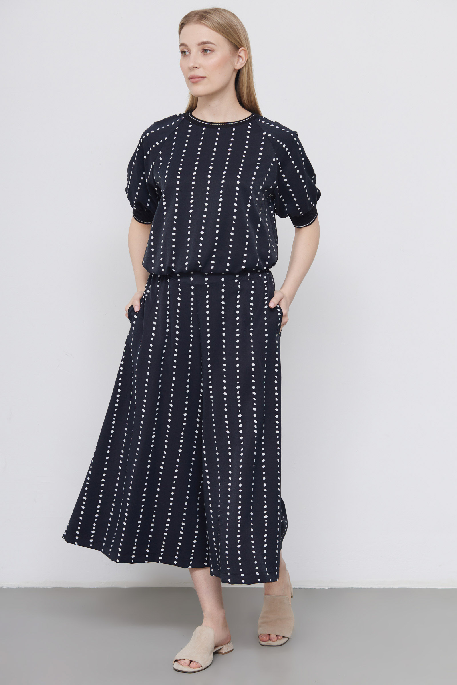 Юбка-брюки из вискозы с контрастным принтом в горошек на эластичном поясе.