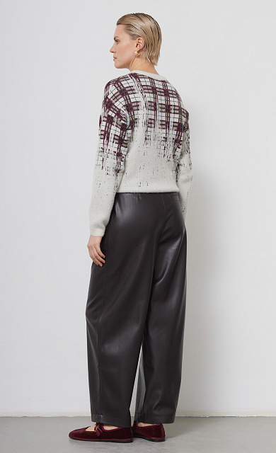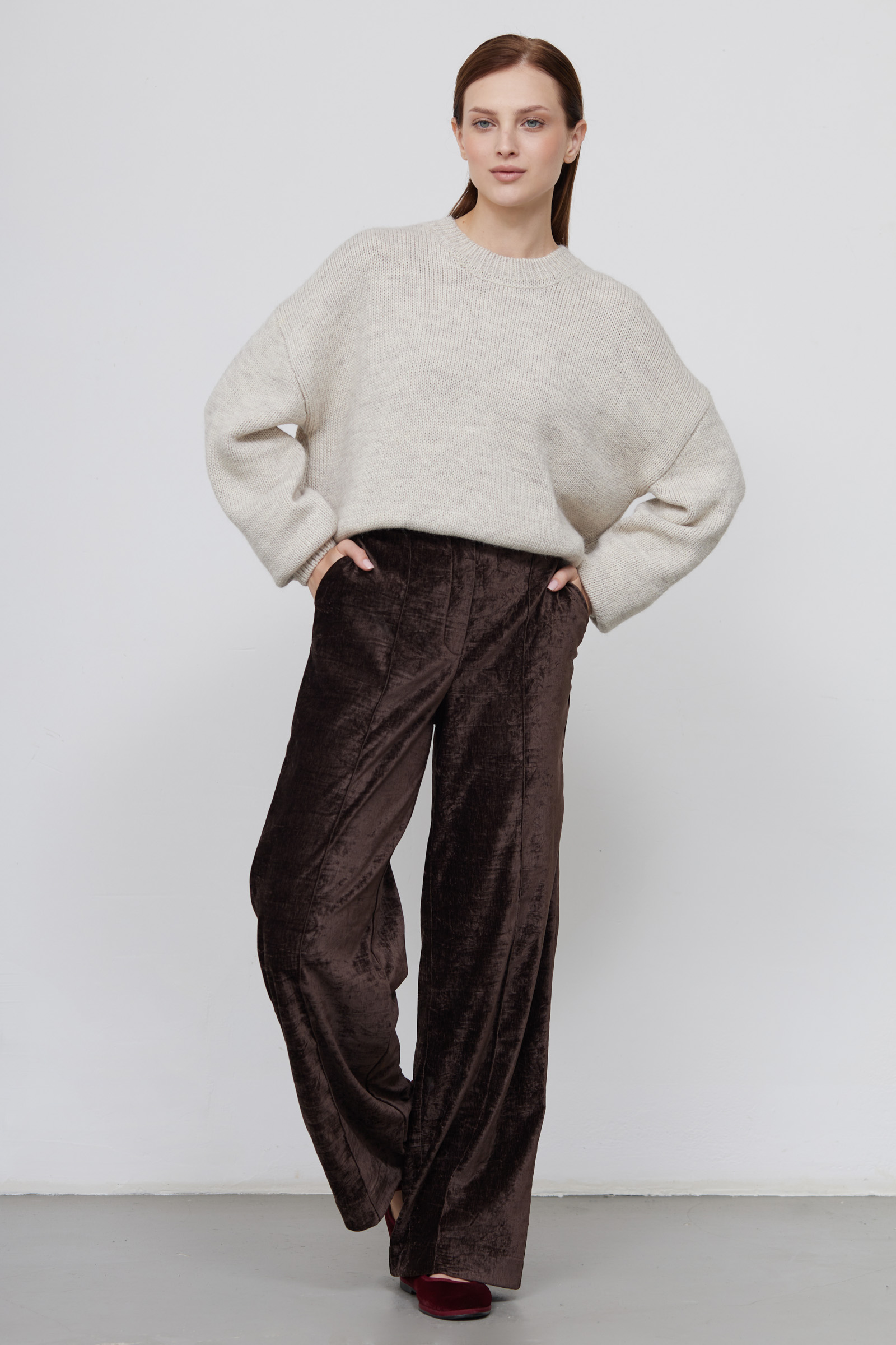Широкие брюки из бархата с жатым эффектом и декоративными стрелками.