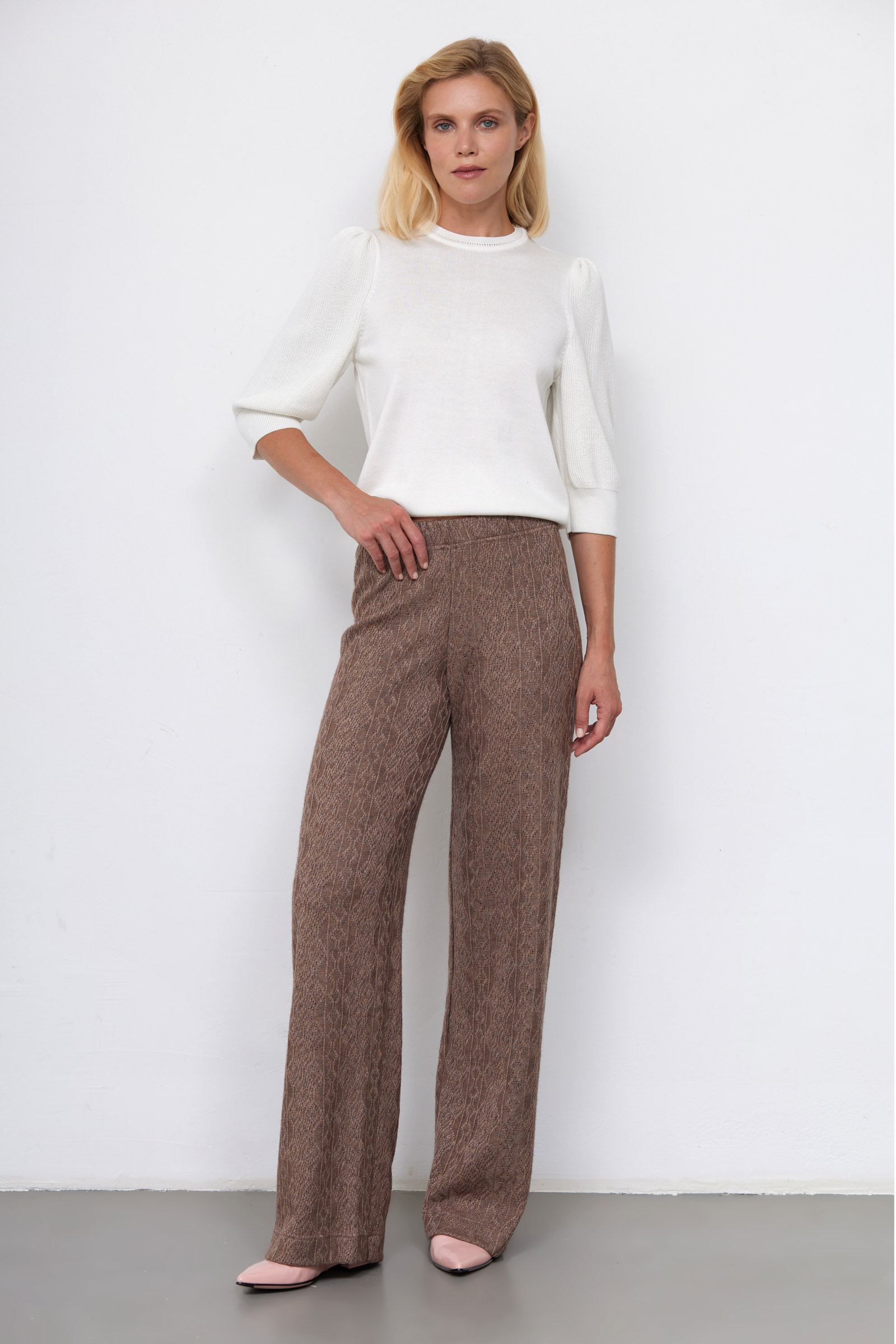 Широкие брюки из мягкого трикотажа ажурной вязки с узорами.