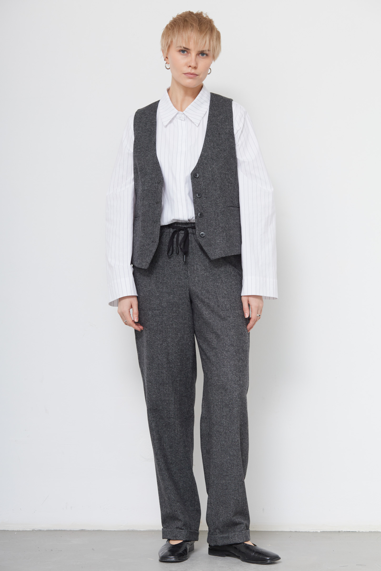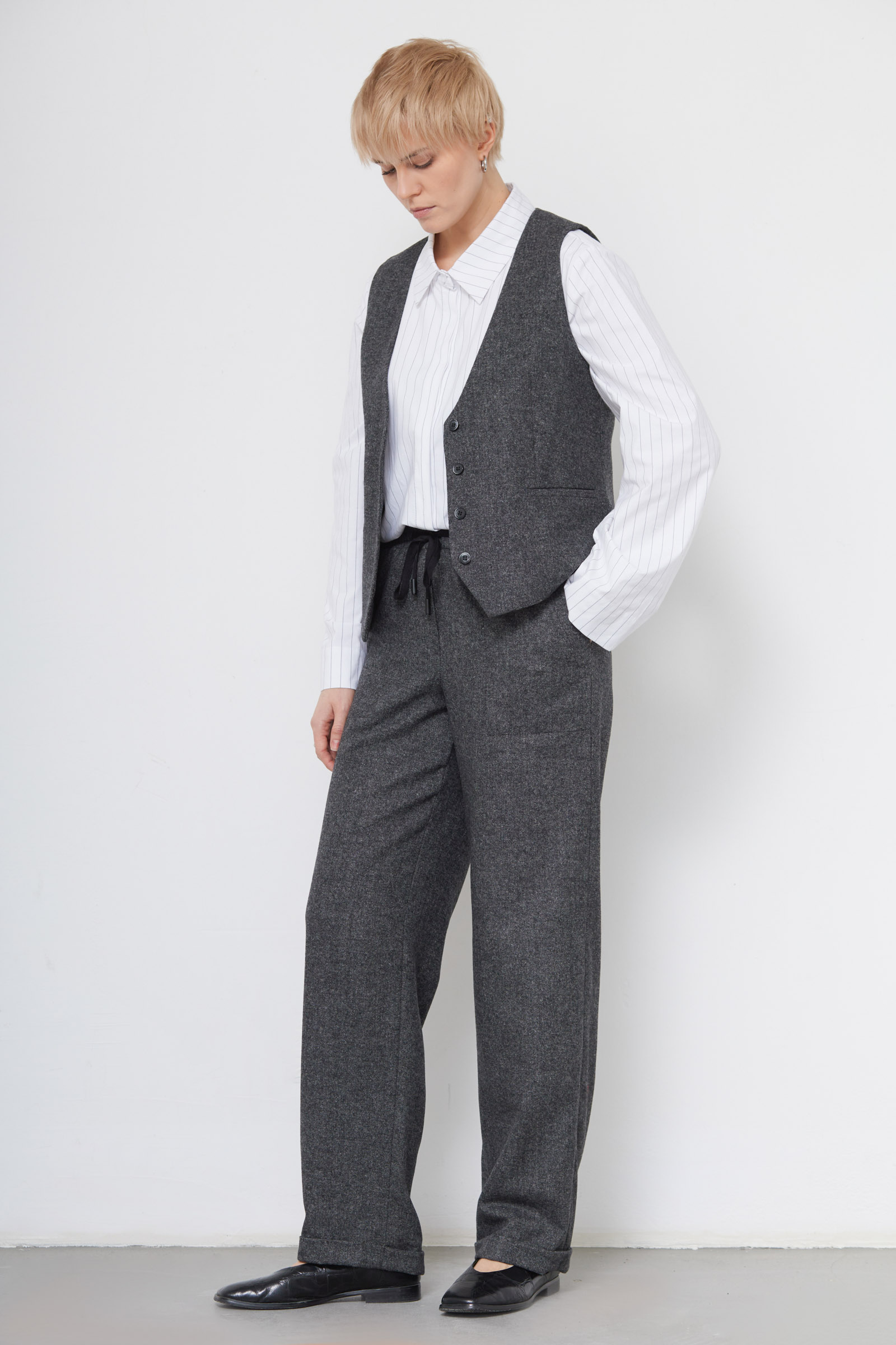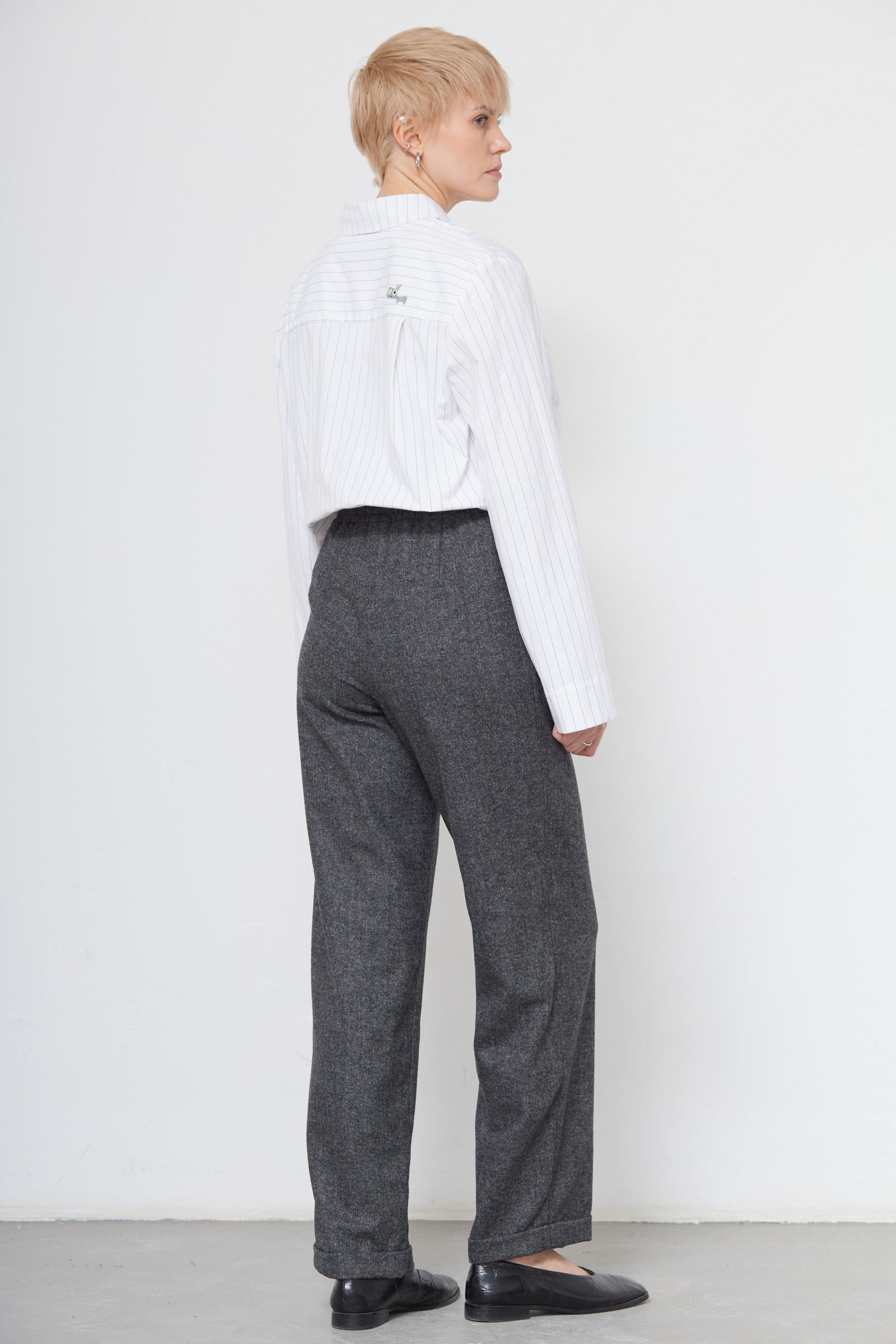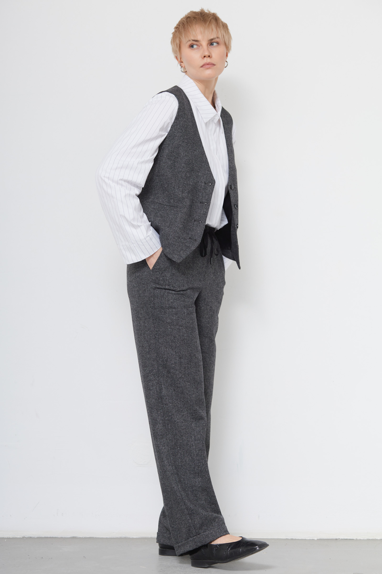 Широкие брюки из костюмной меланжевой ткани с шерстью на эластичном поясе.