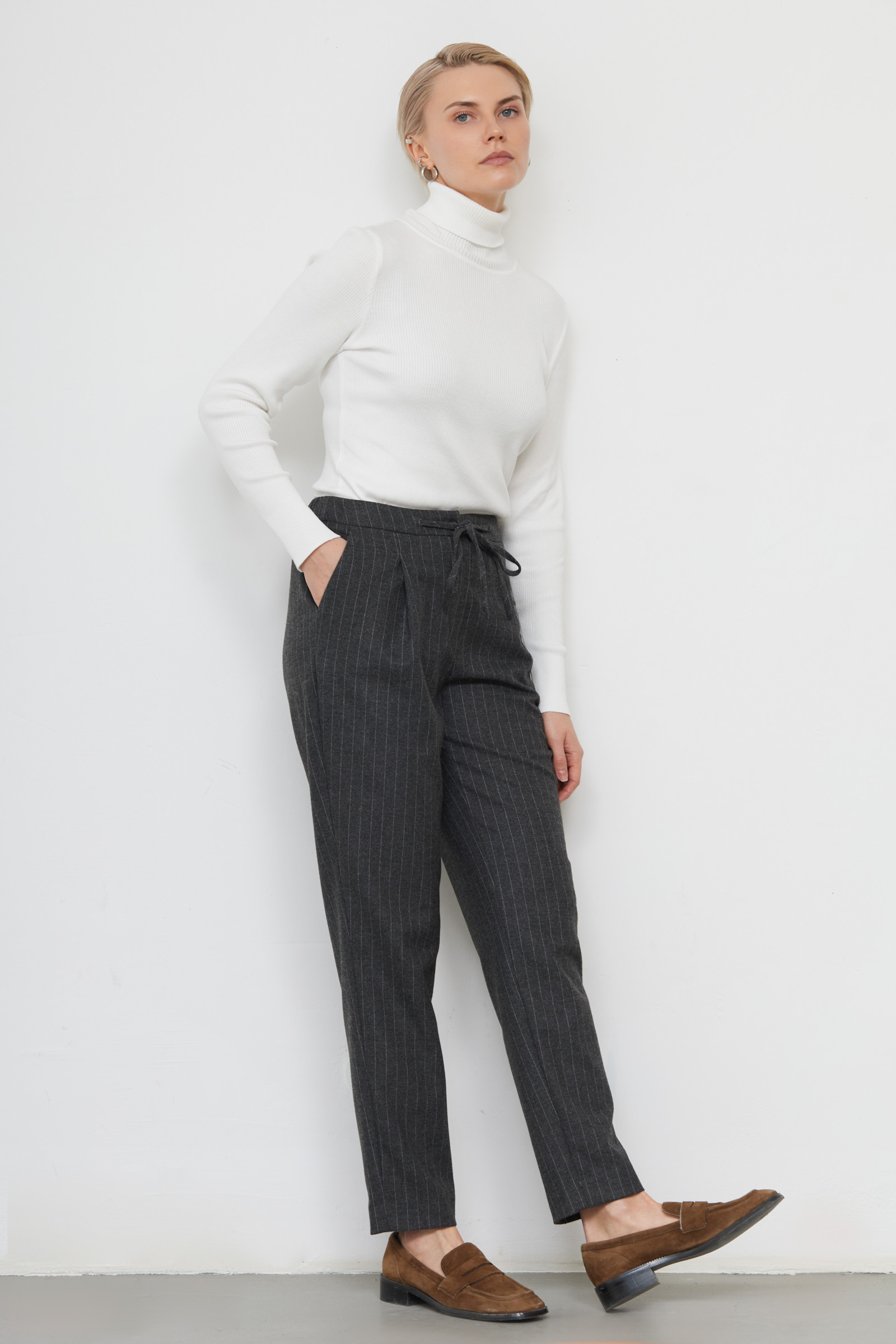 Слегка зауженные брюки в полоску из мягкой костюмной ткани с шерстью.