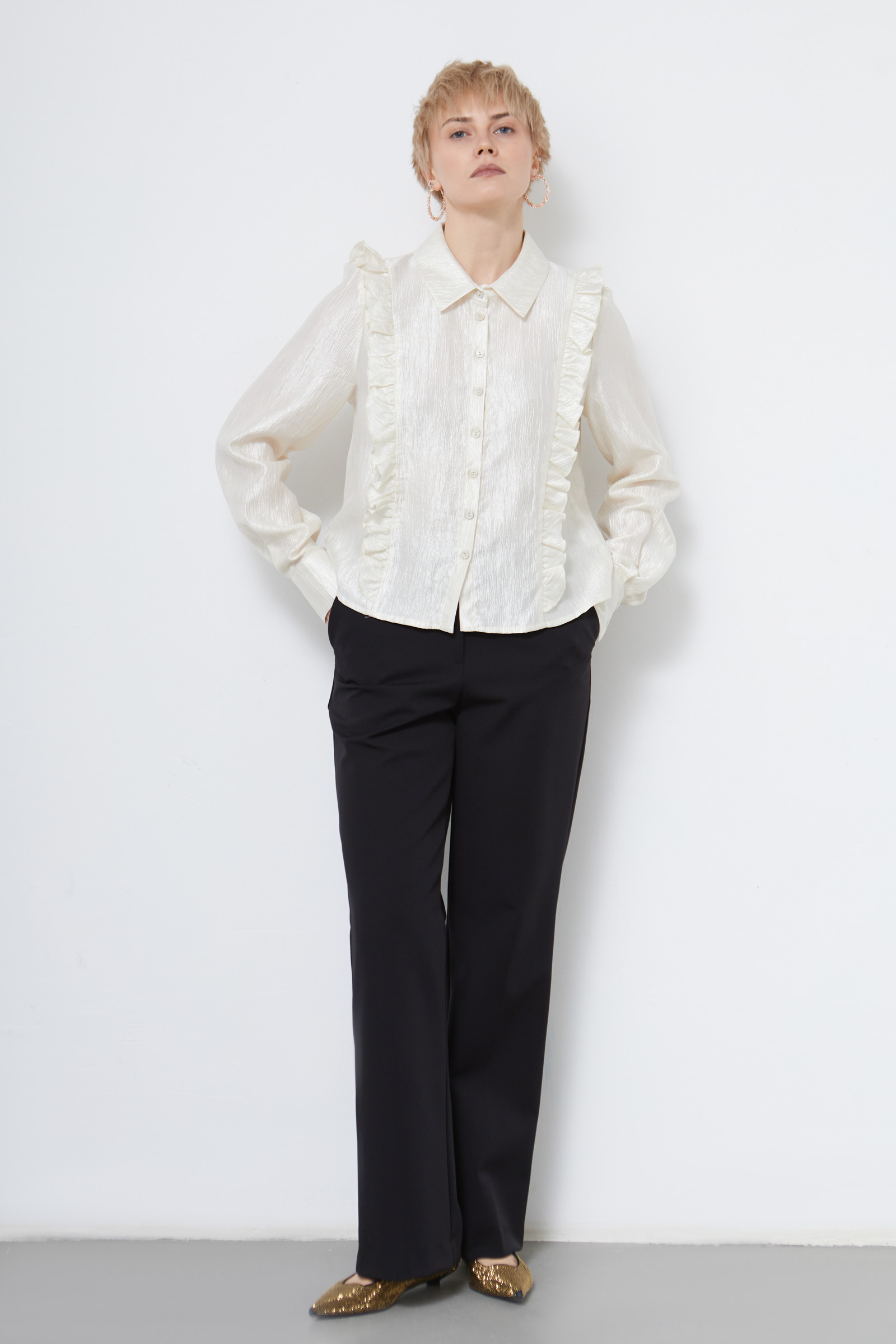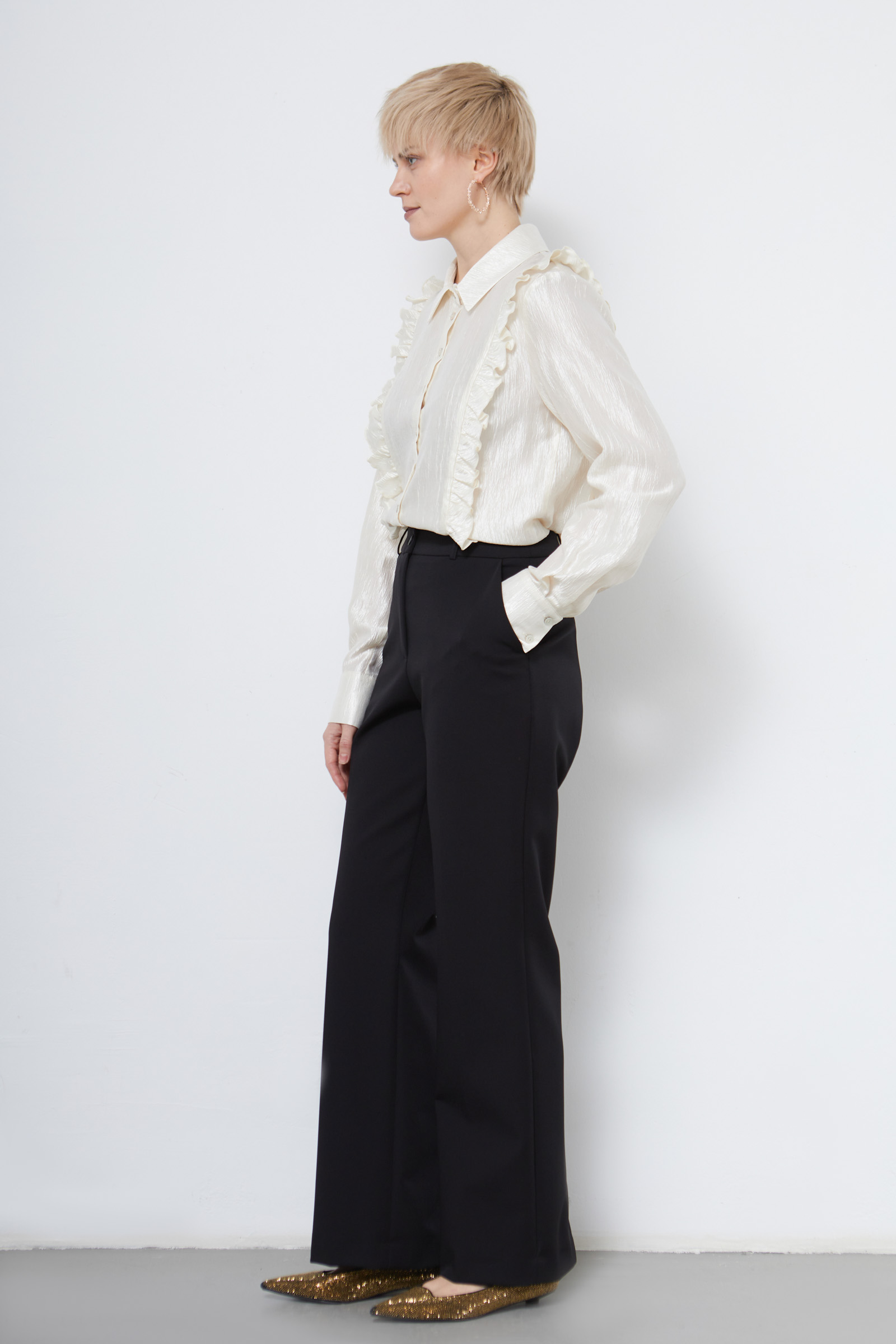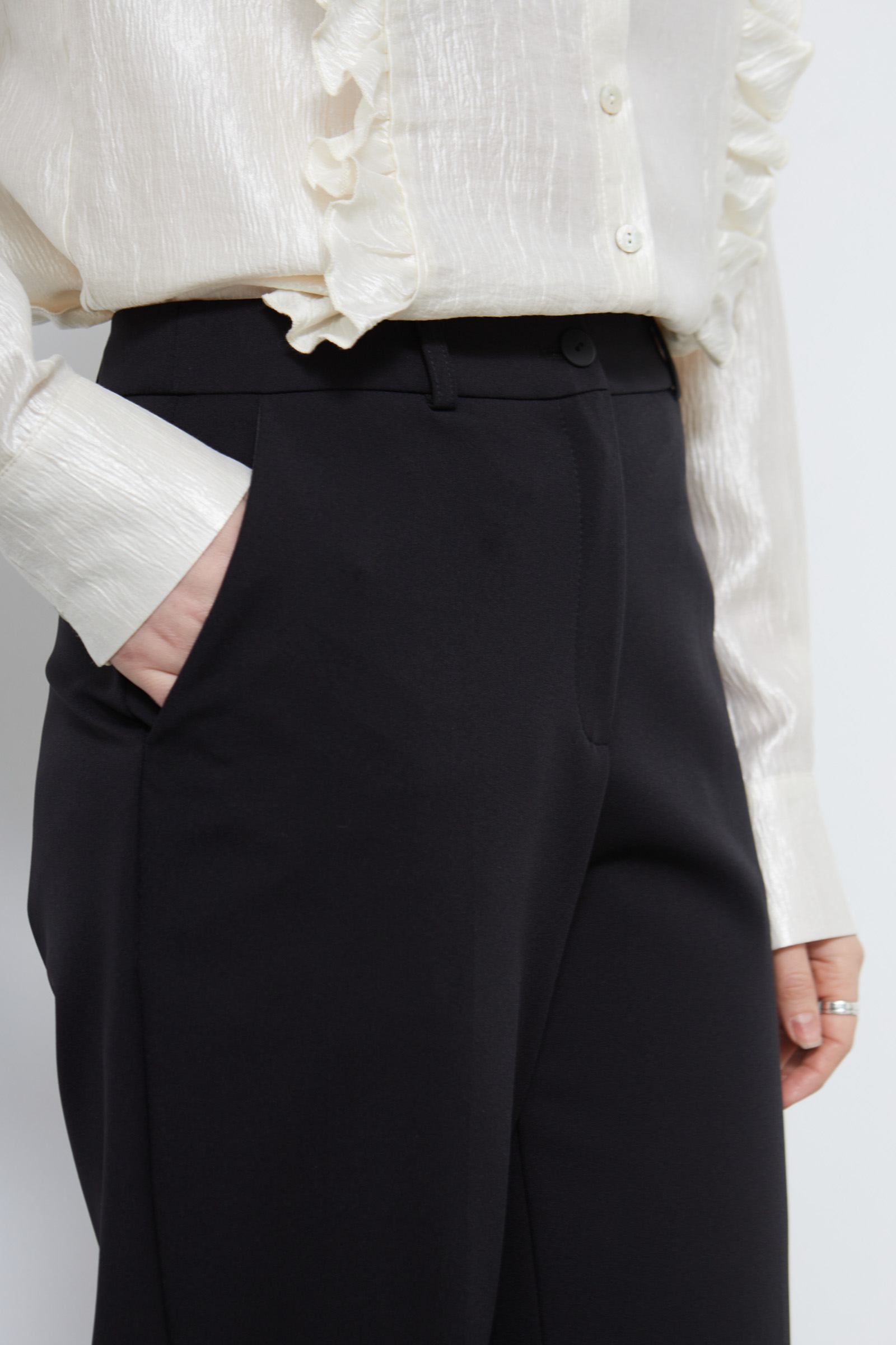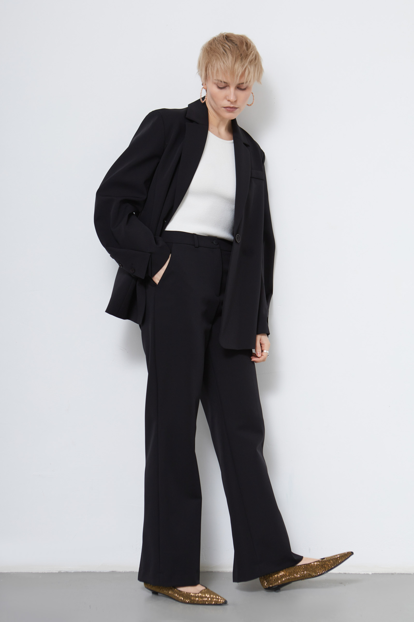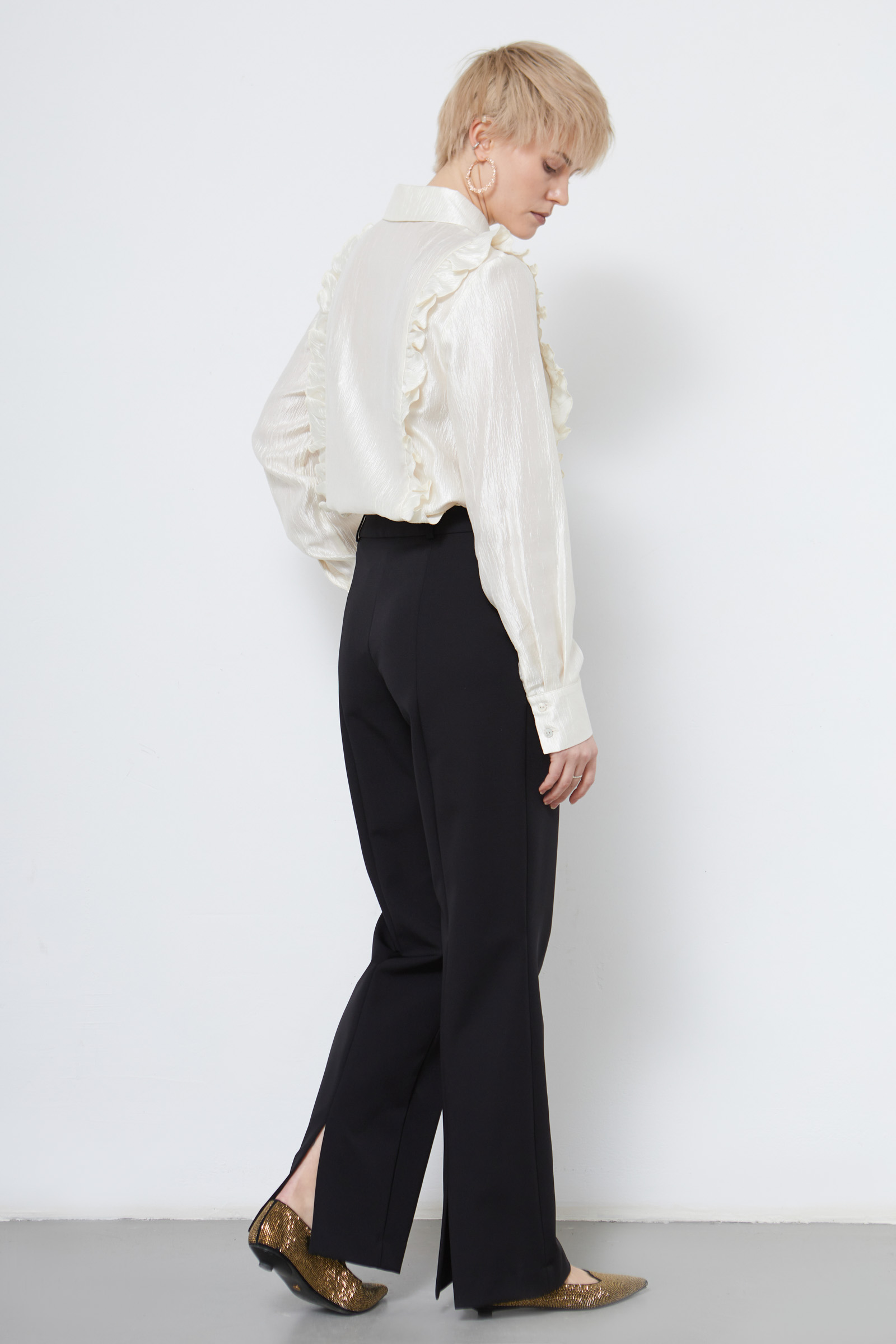Классические костюмные брюки с разрезами сзади по низу.