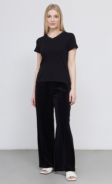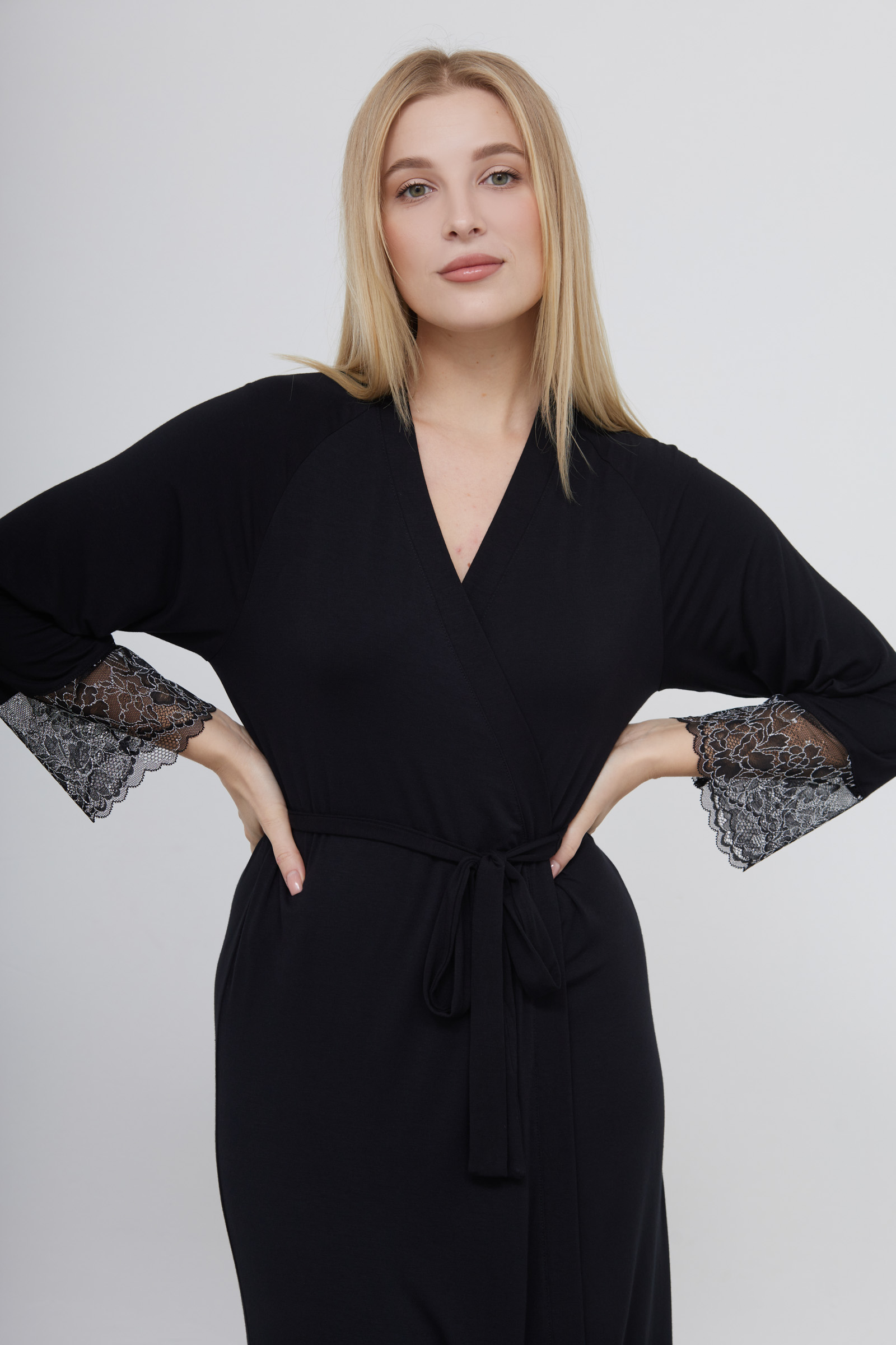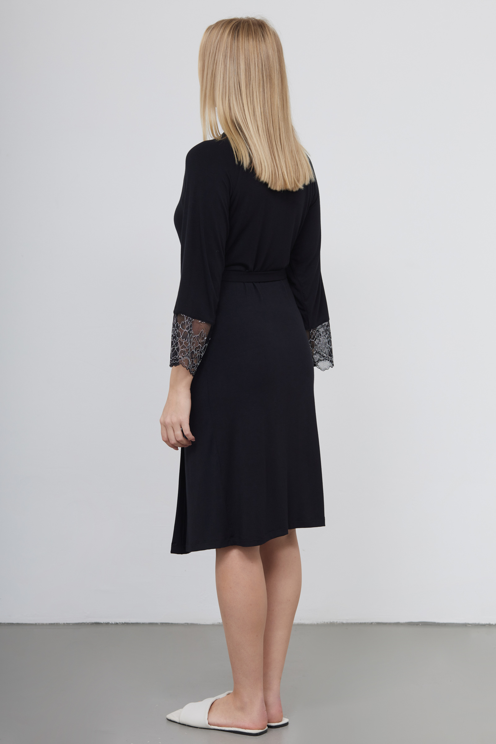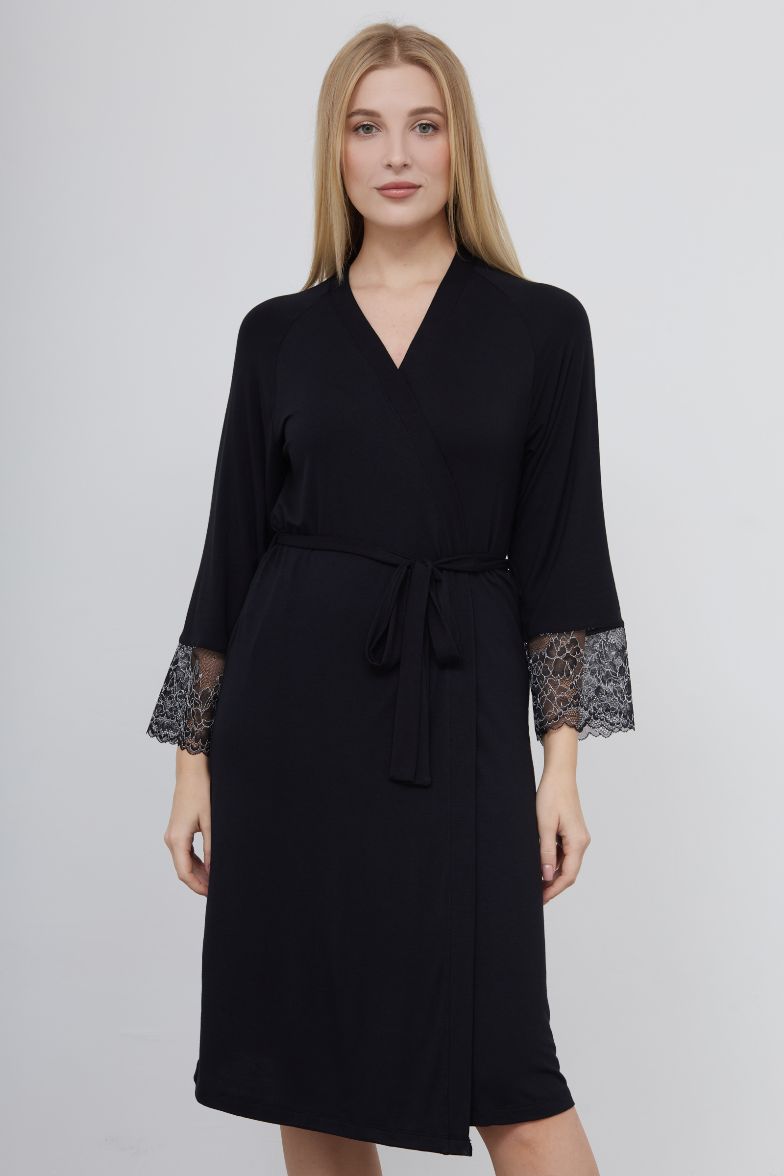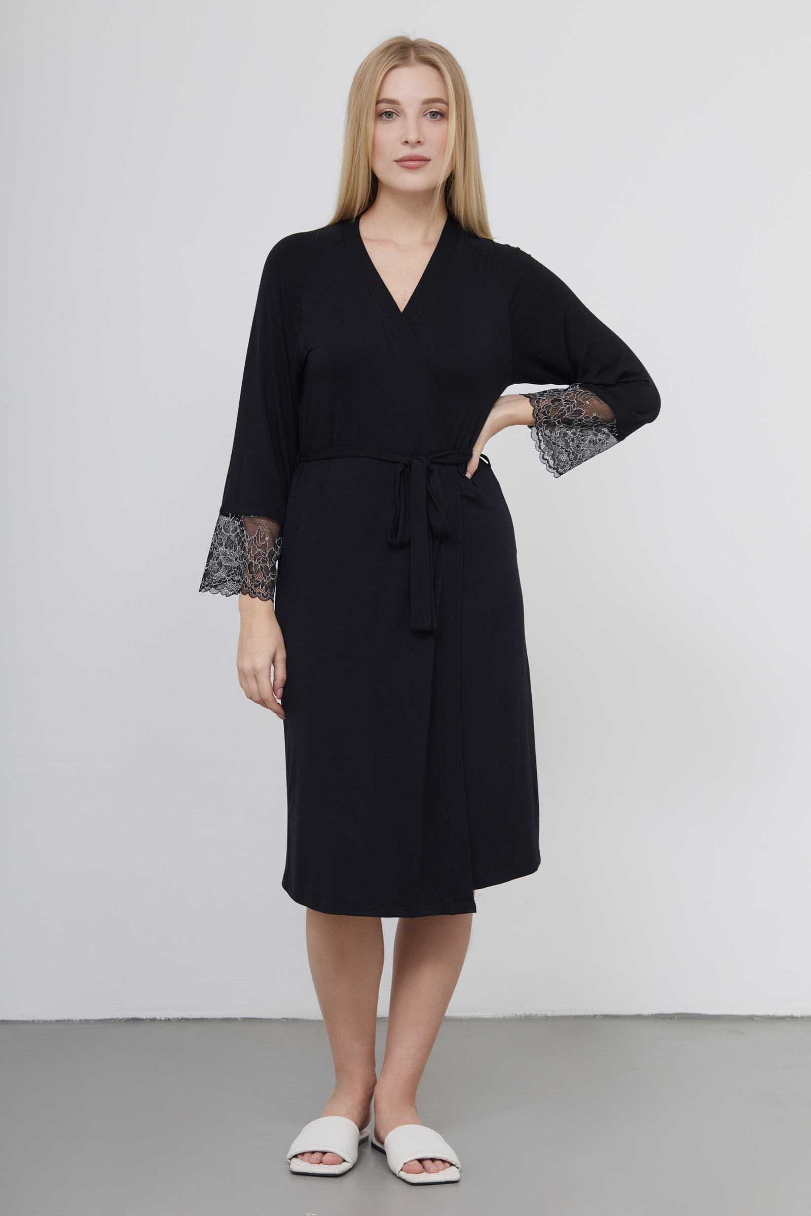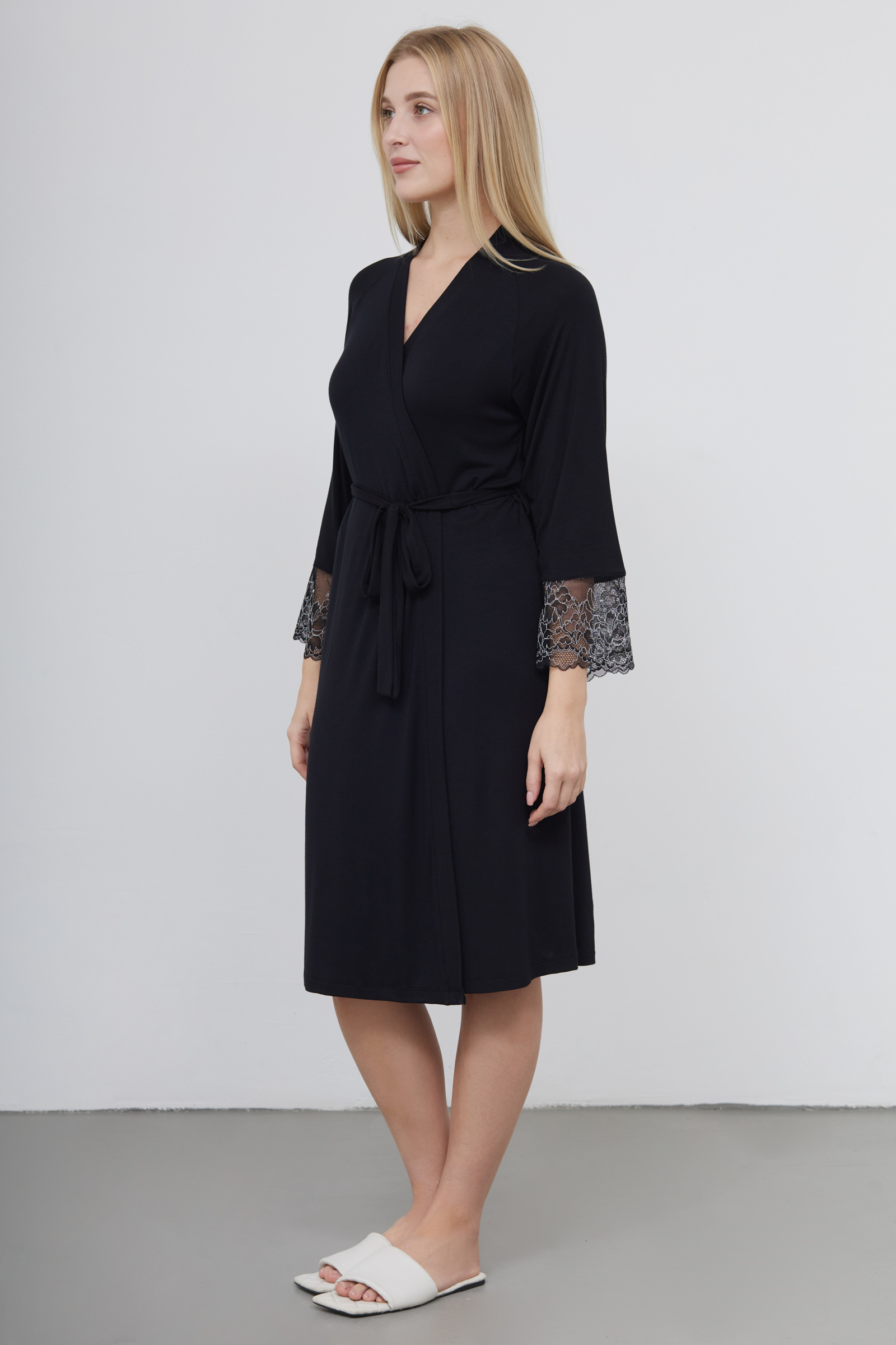 Халат из тонкого вискозного трикотажа с кружевными манжетами.