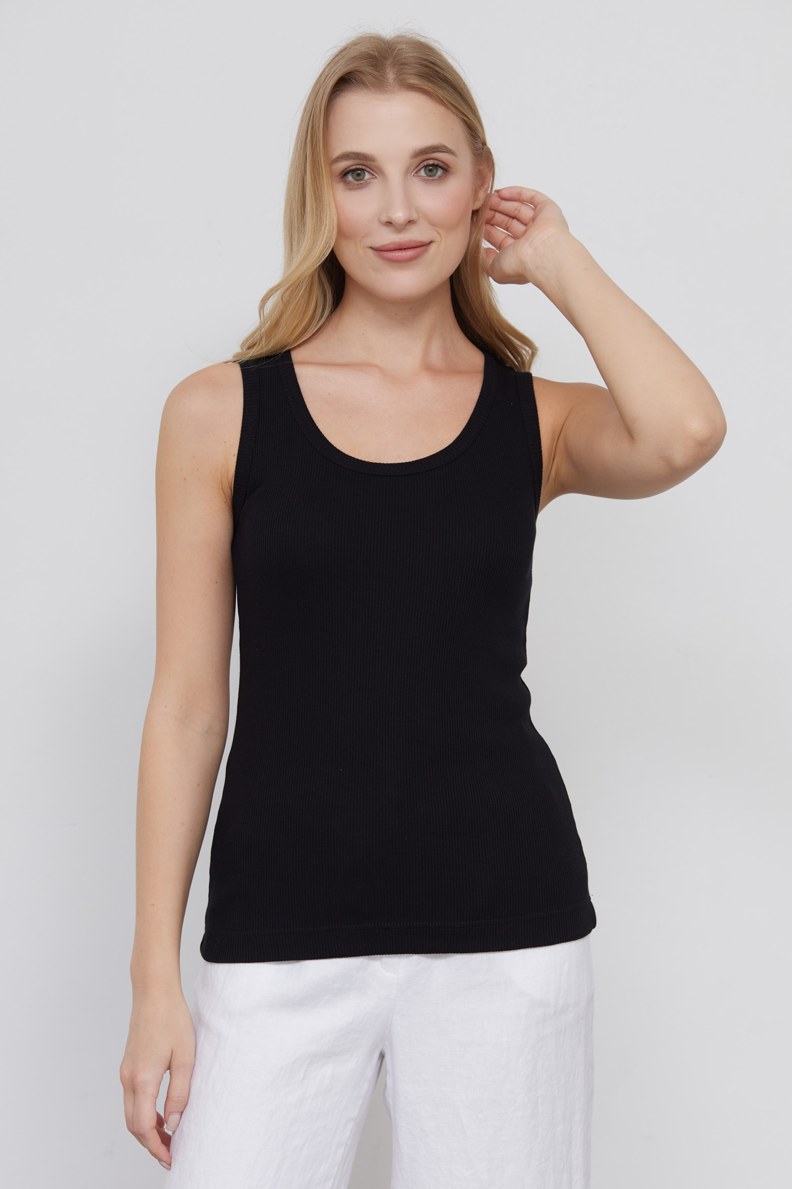 Базовая майка из мягкого хлопкового трикотажа в рубчик.