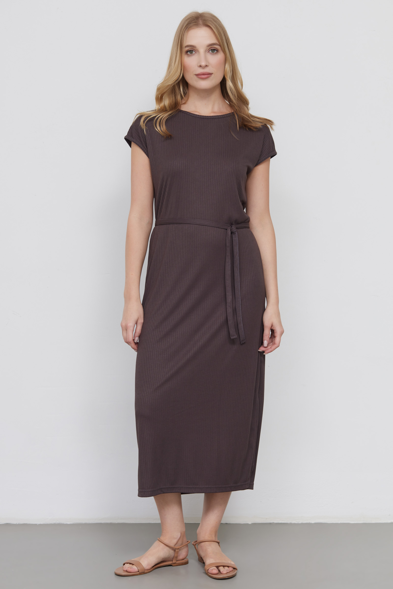 Платье из мягкого трикотажа в рубчик с тонким поясом.