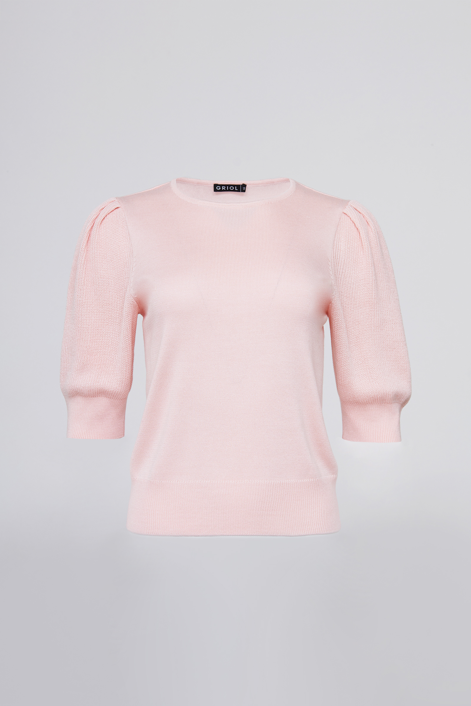 Джемпер из вязаного вискозного трикотажа с пышными рукавами.