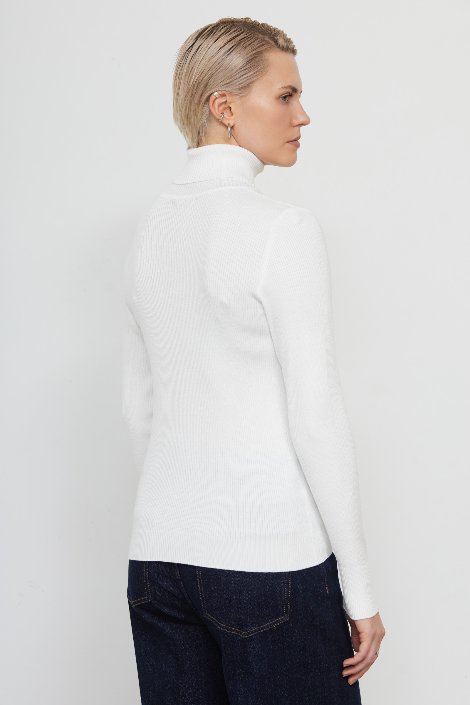 Базовая водолазка из мягкого вискозного трикотажа в рубчик.