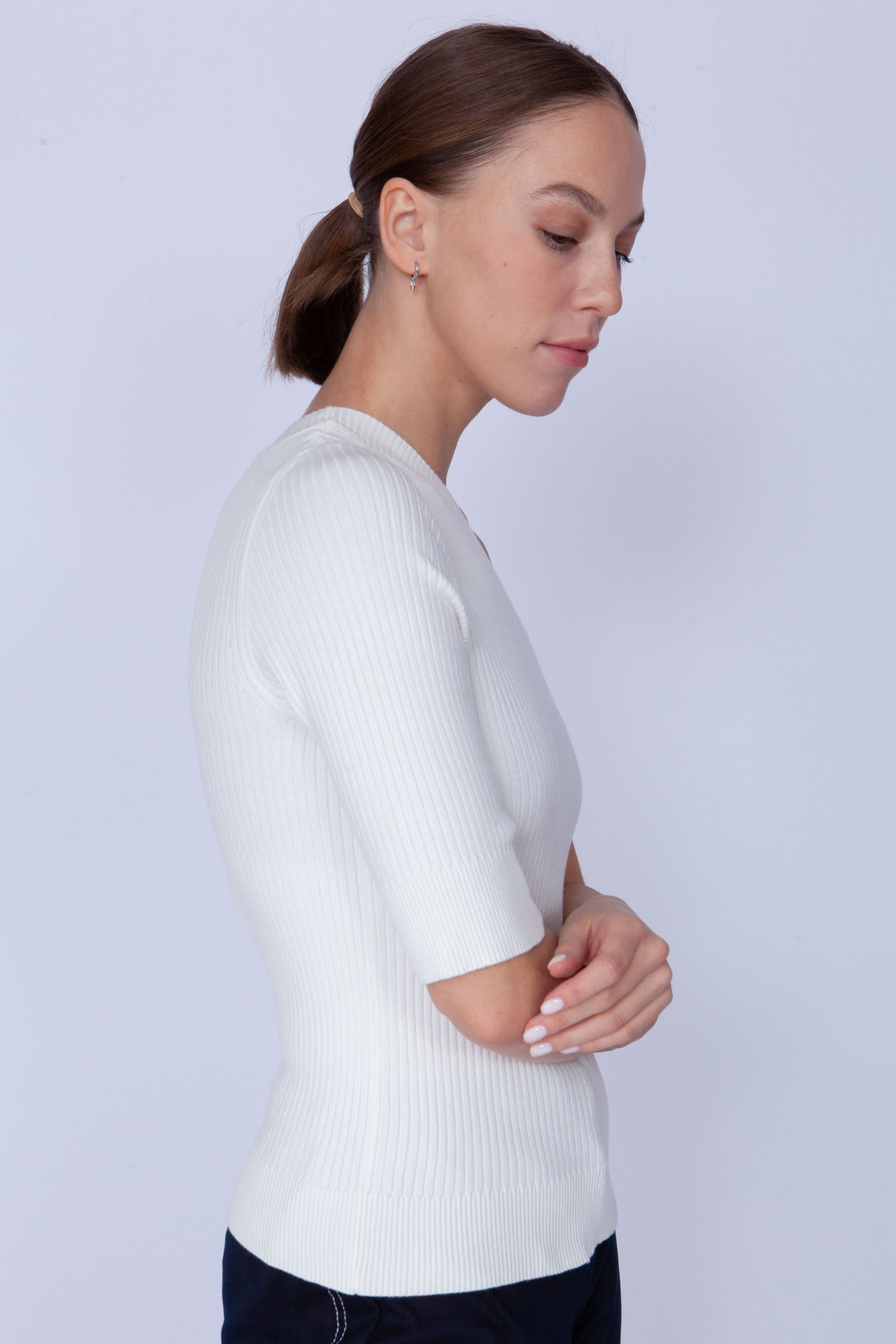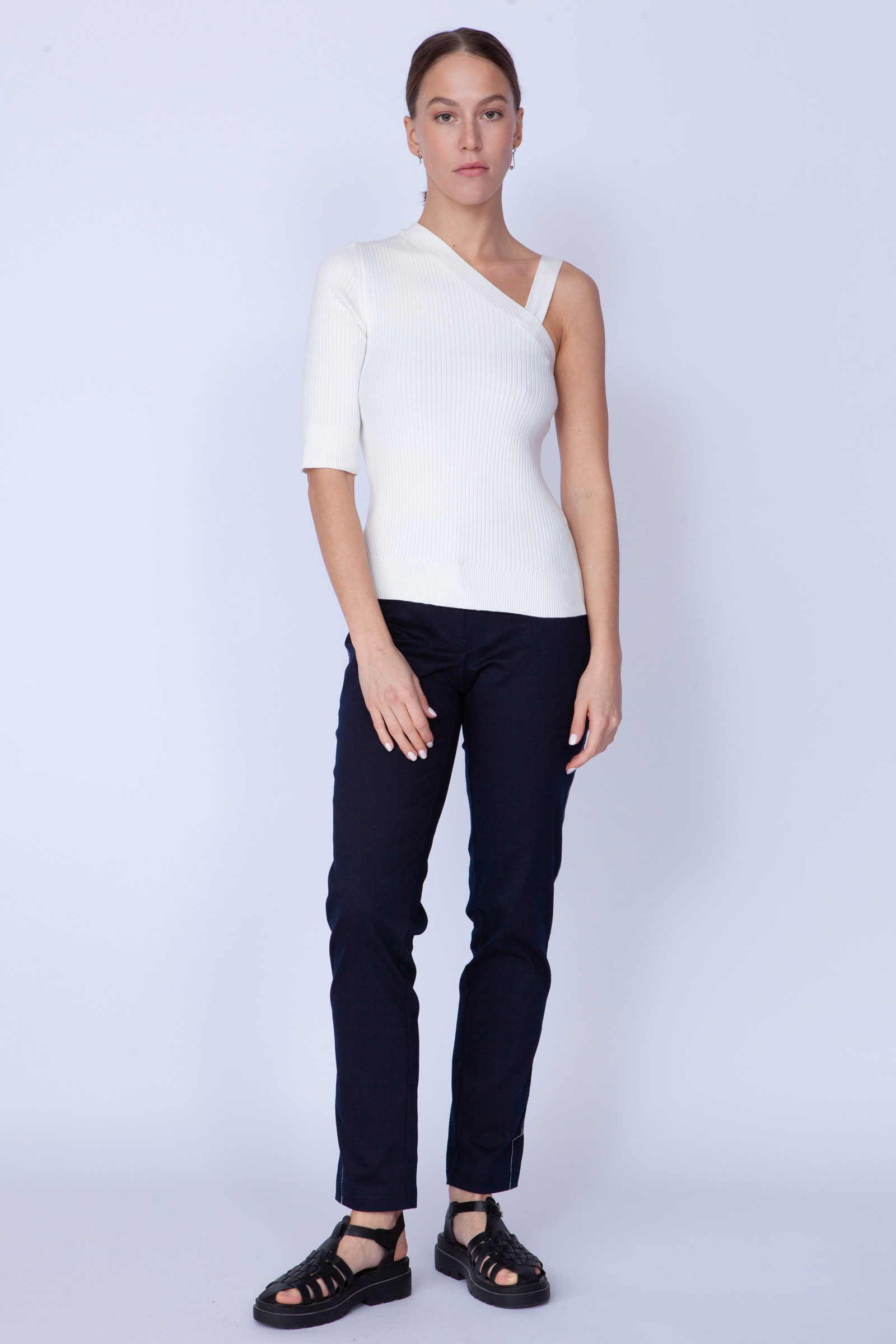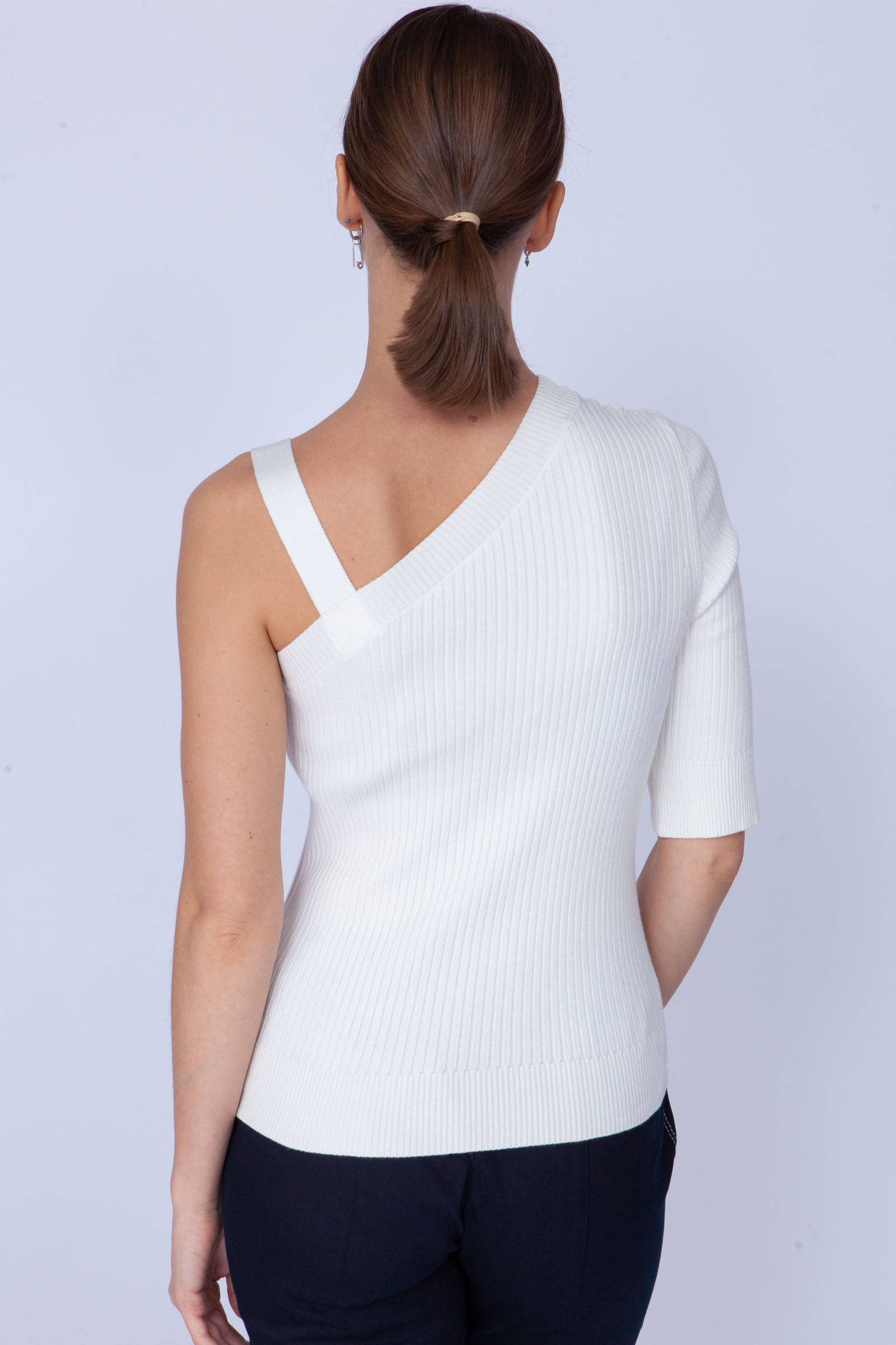 Топ из вязаного трикотажа в рубчик с открытым плечом.