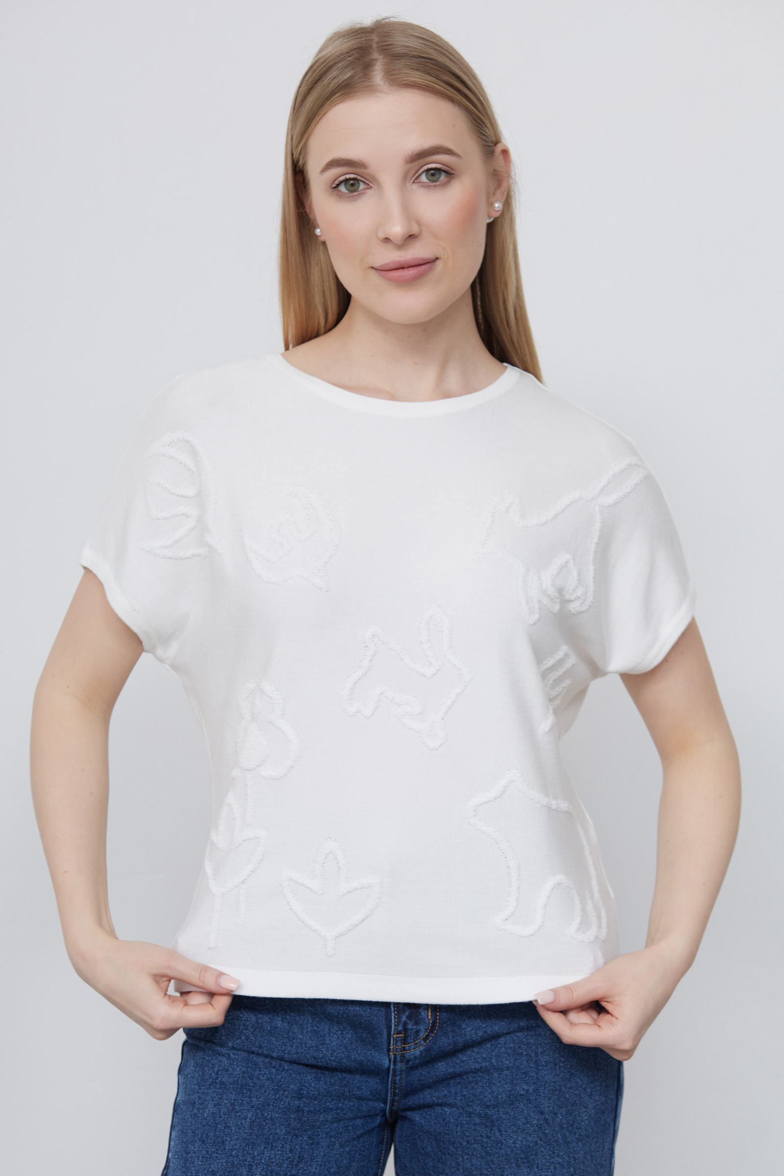 Джемпер из тонкого вязаного трикотажа с объемным принтом и короткими рукавами.