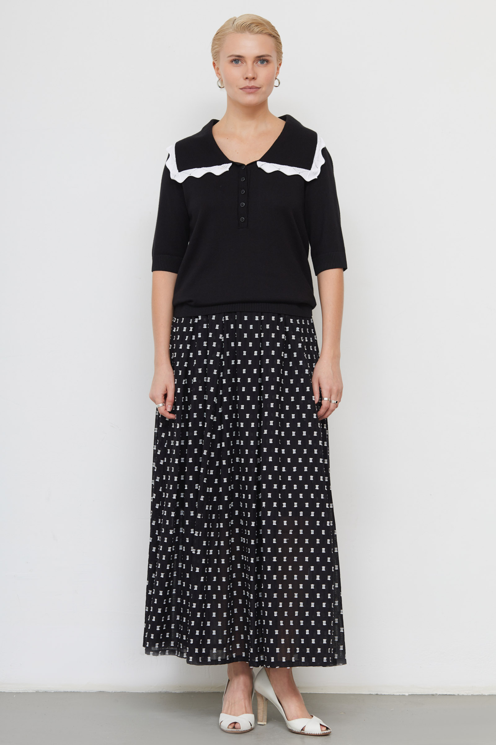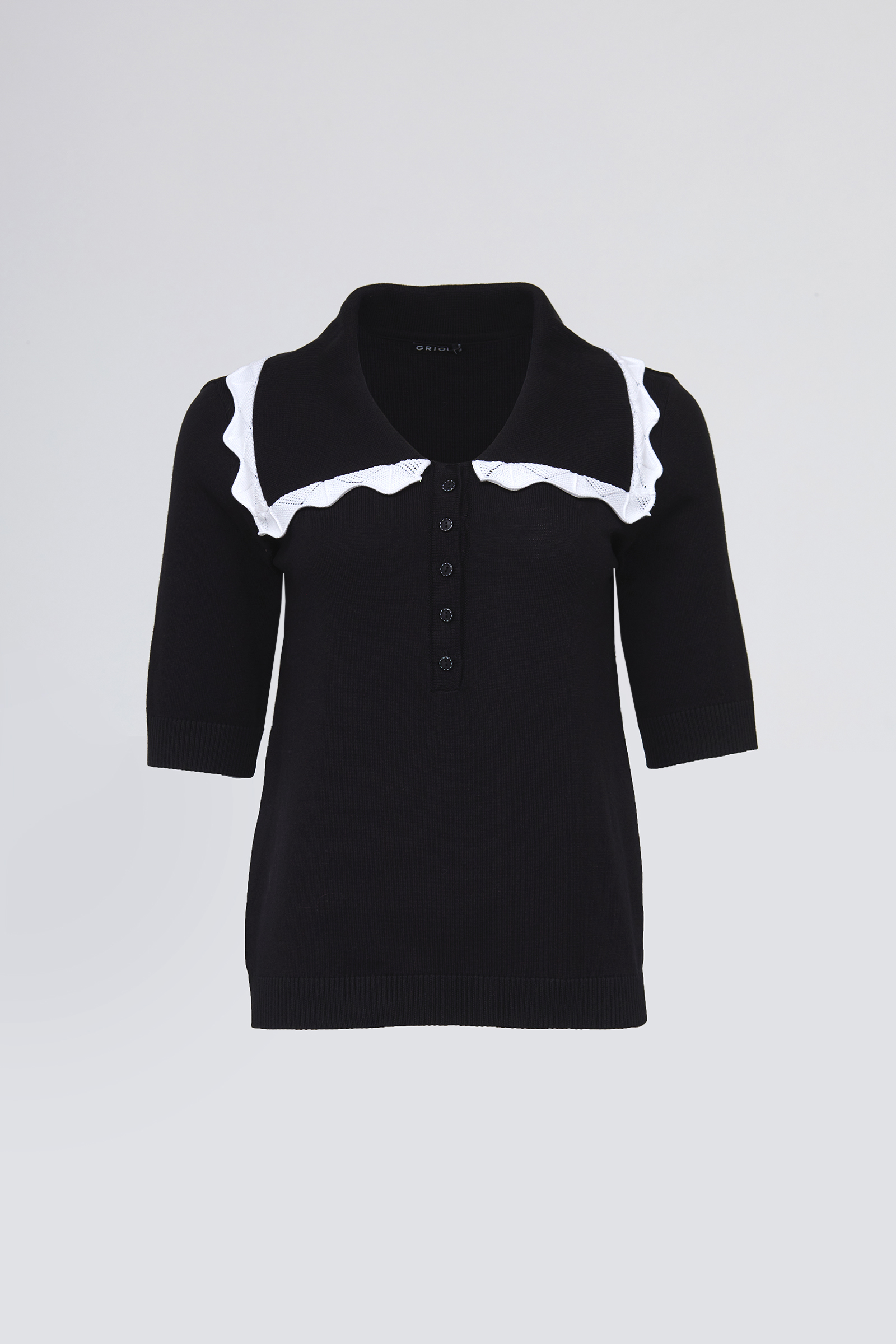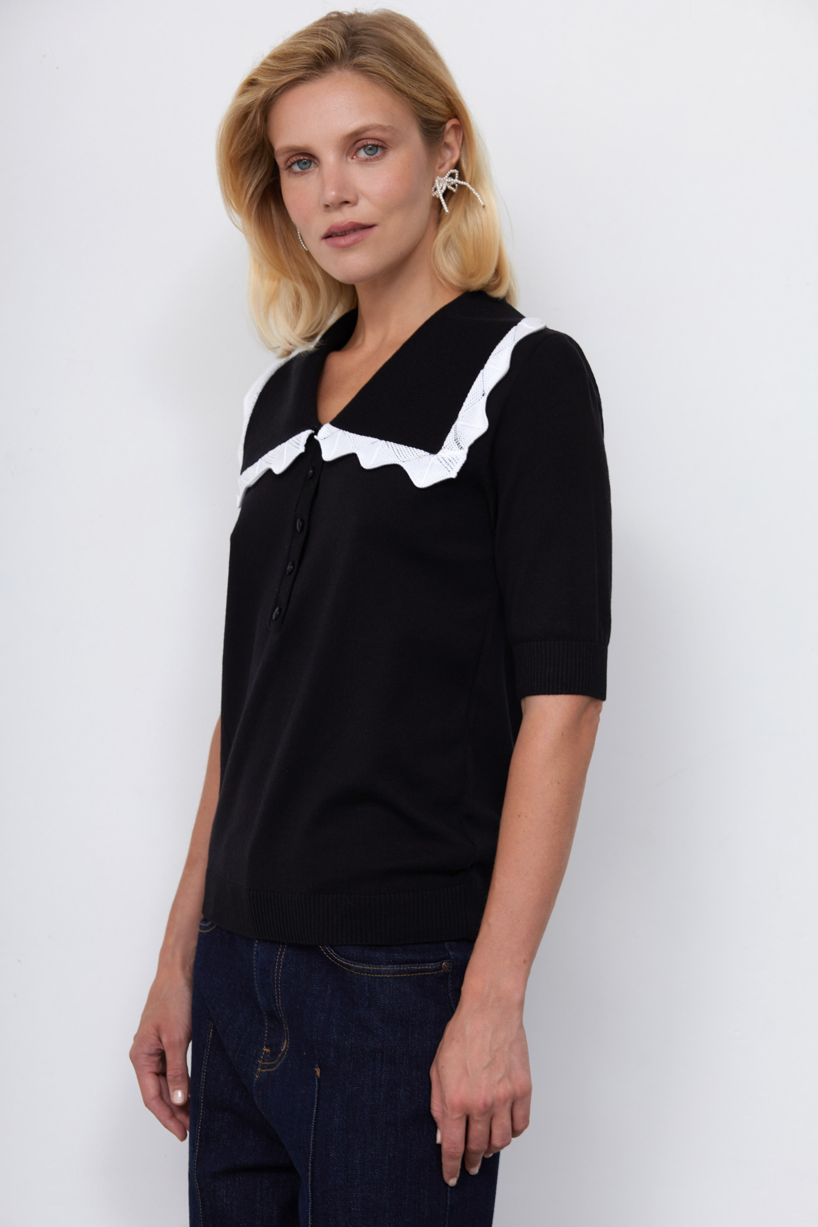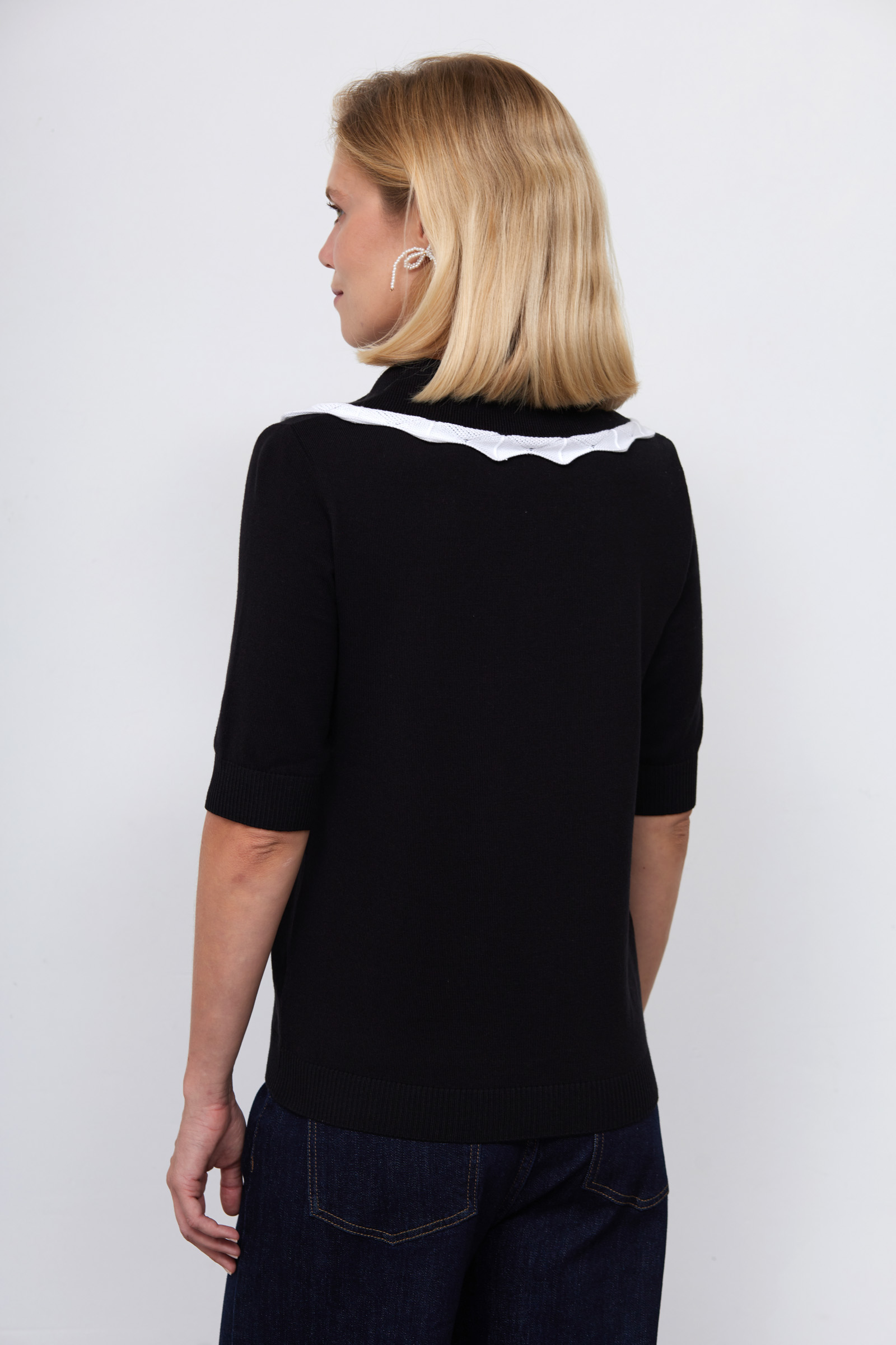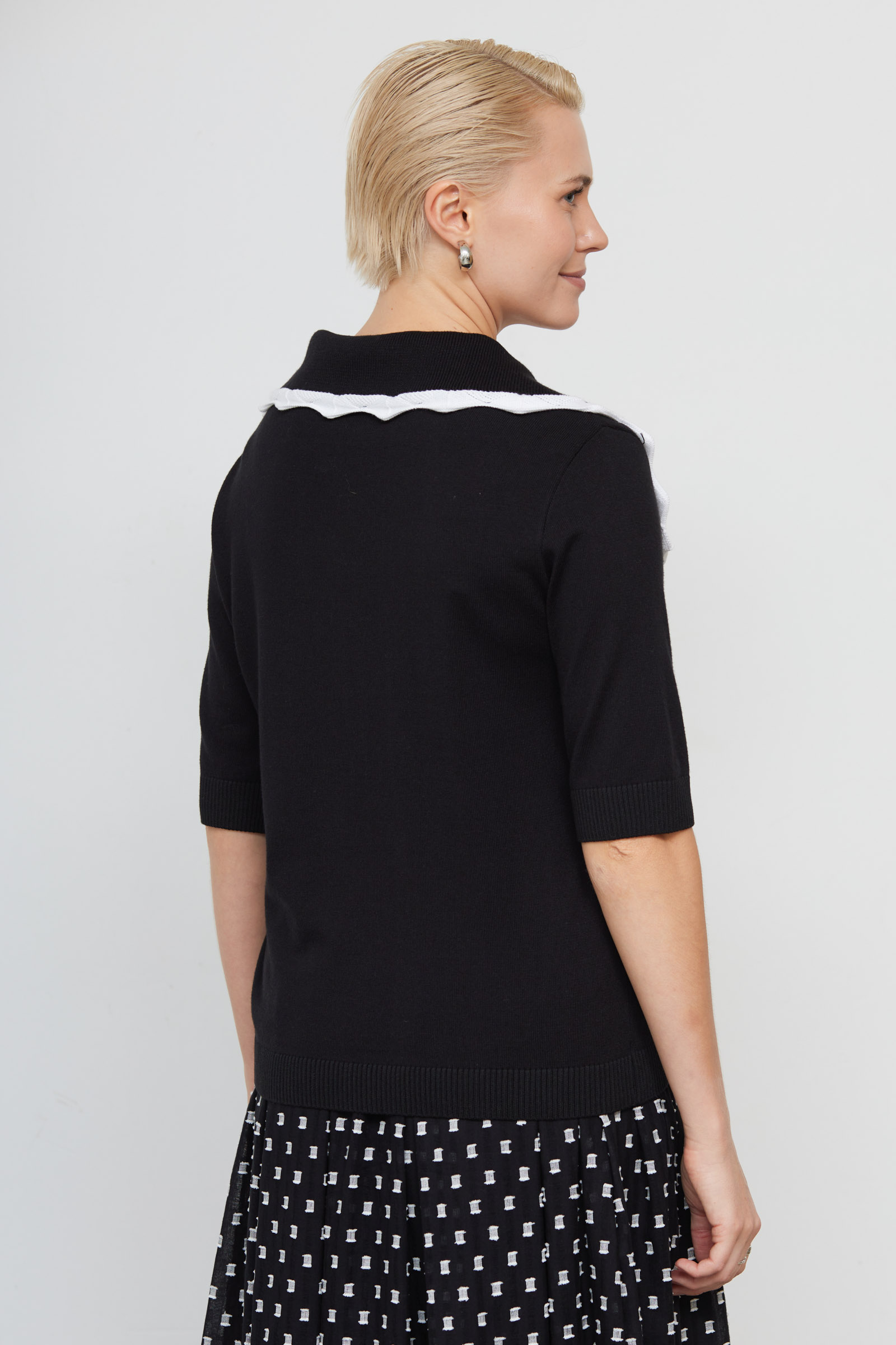 Джемпер из мягкого вязаного трикотажа с декором на воротнике.
