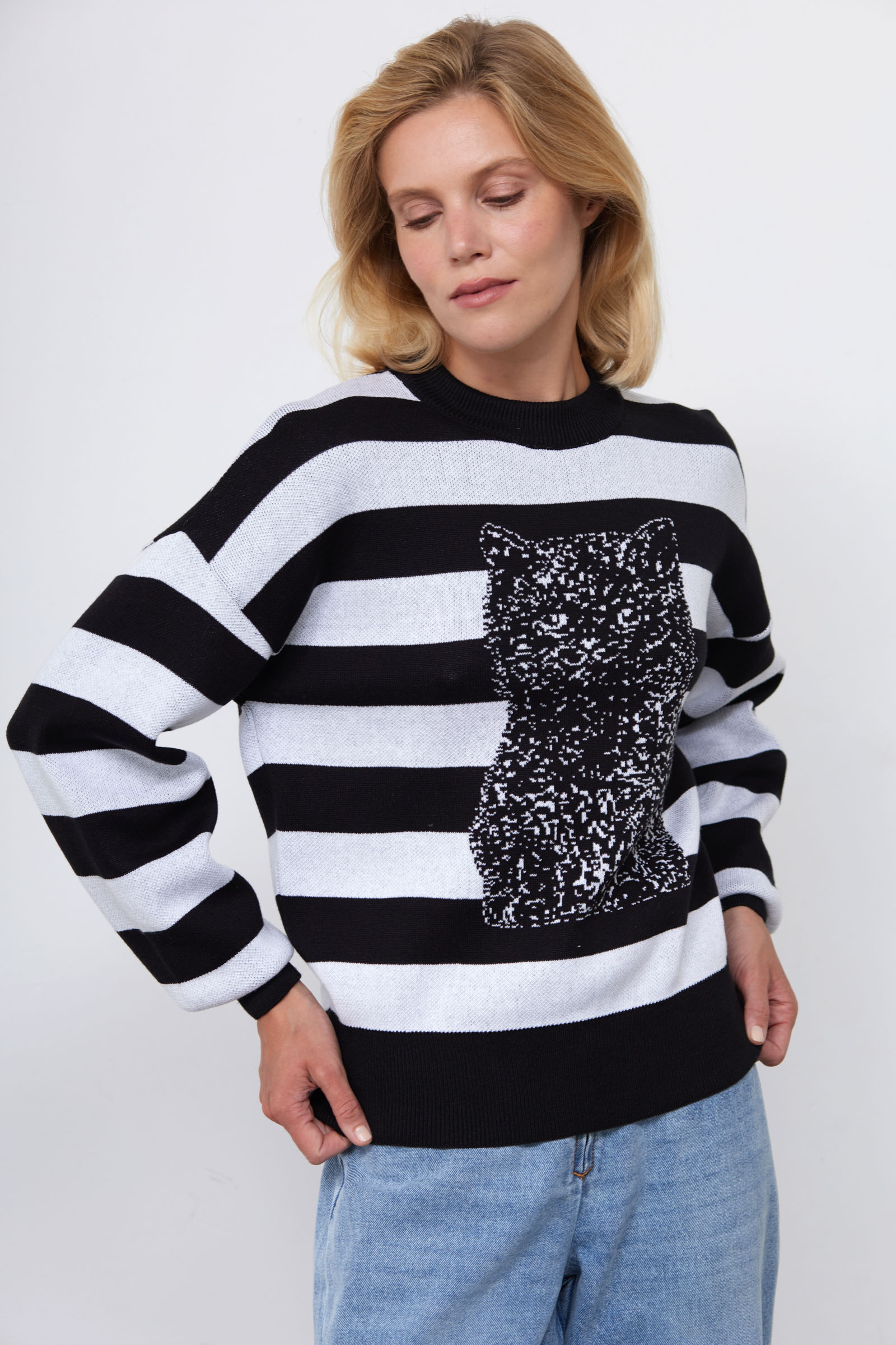 Джемпер из мягкого трикотажа жаккардовой вязки в полоску с авторским рисунком.