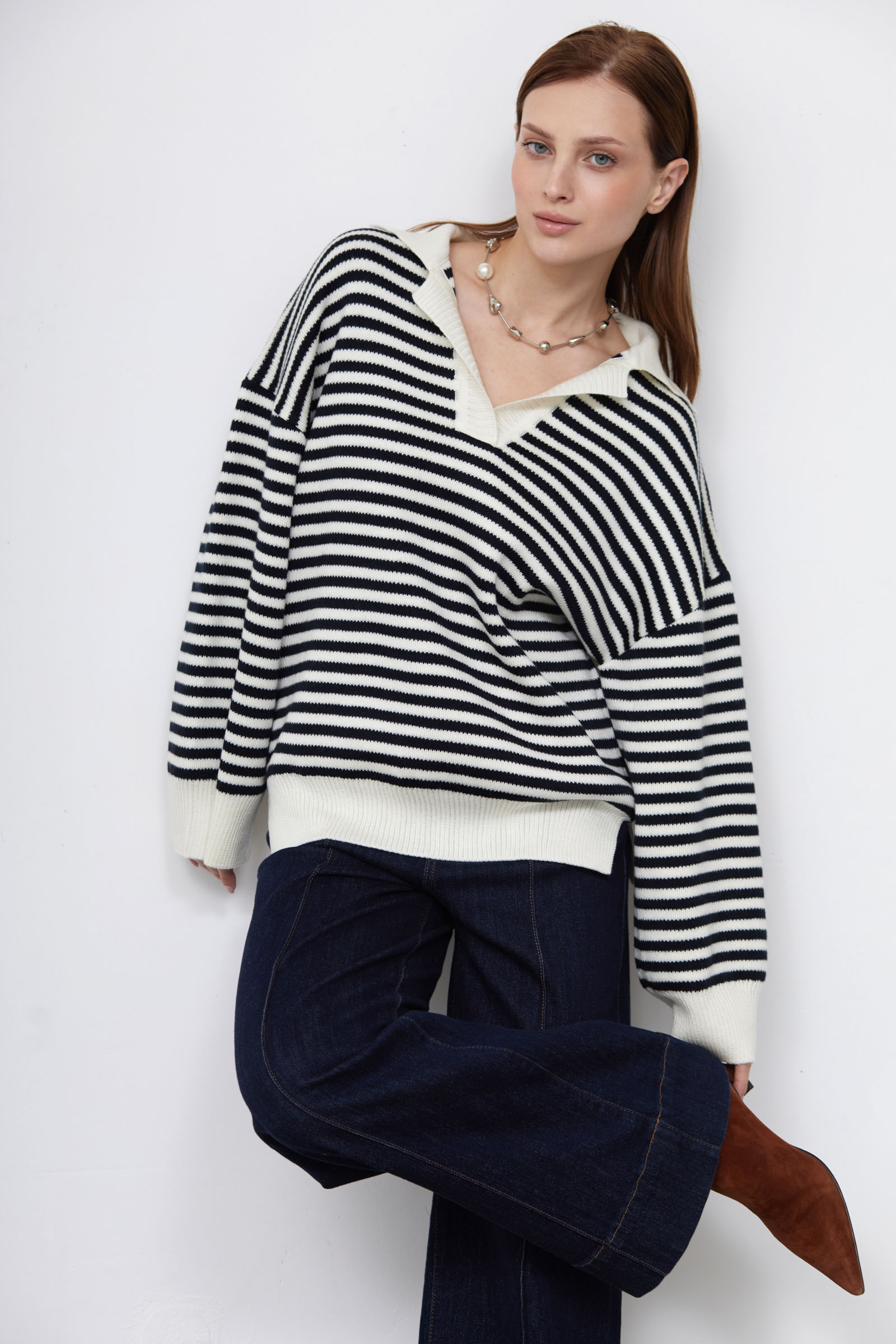 Джемпер-поло oversize из полушерстяного вязаного трикотажа в полоску.