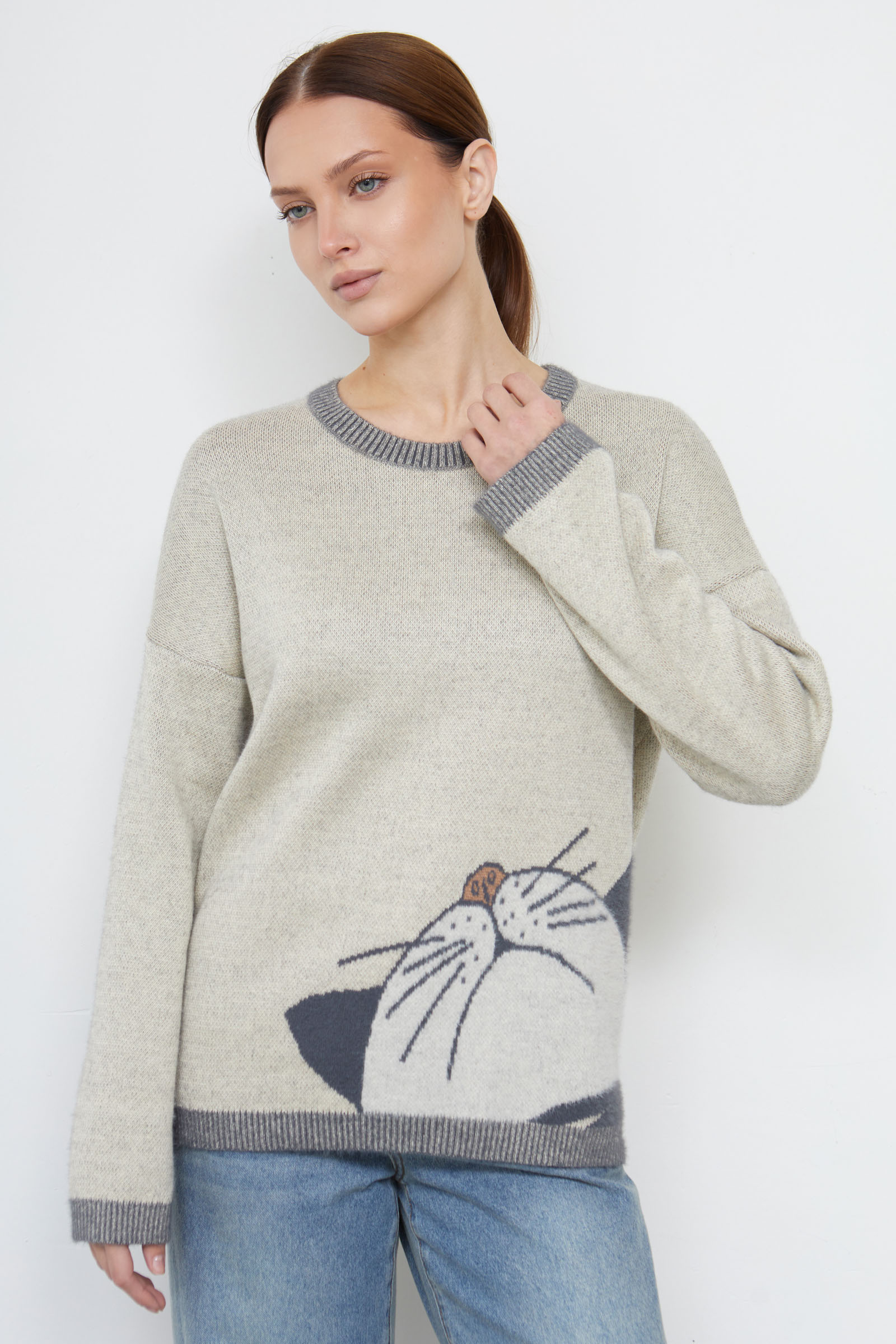 Джемпер из мягкого пушистого трикотажа жаккардовой вязки с фантазийным рисунком.