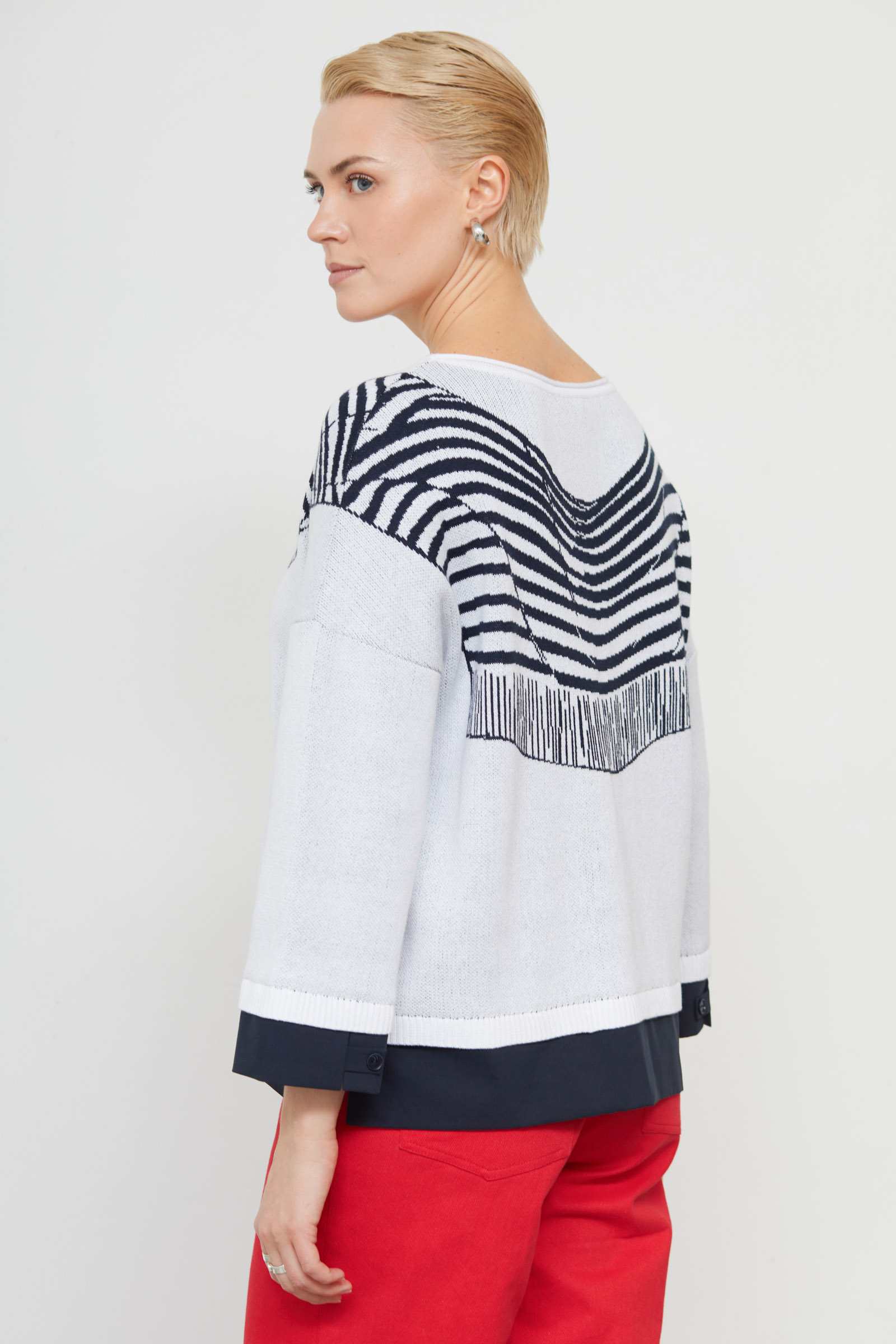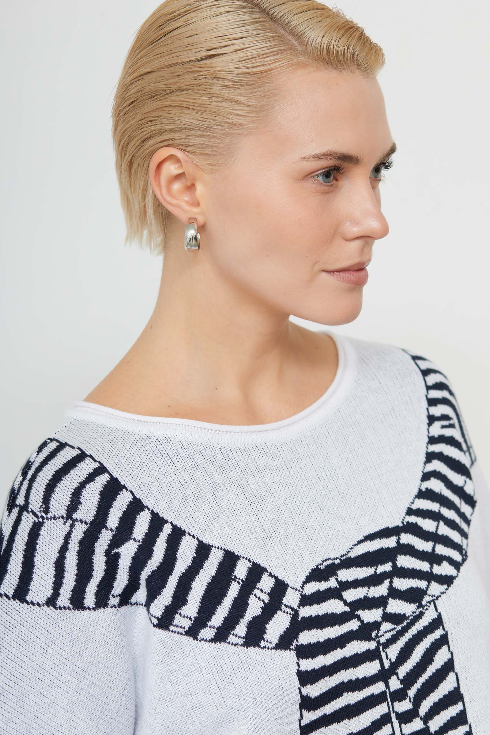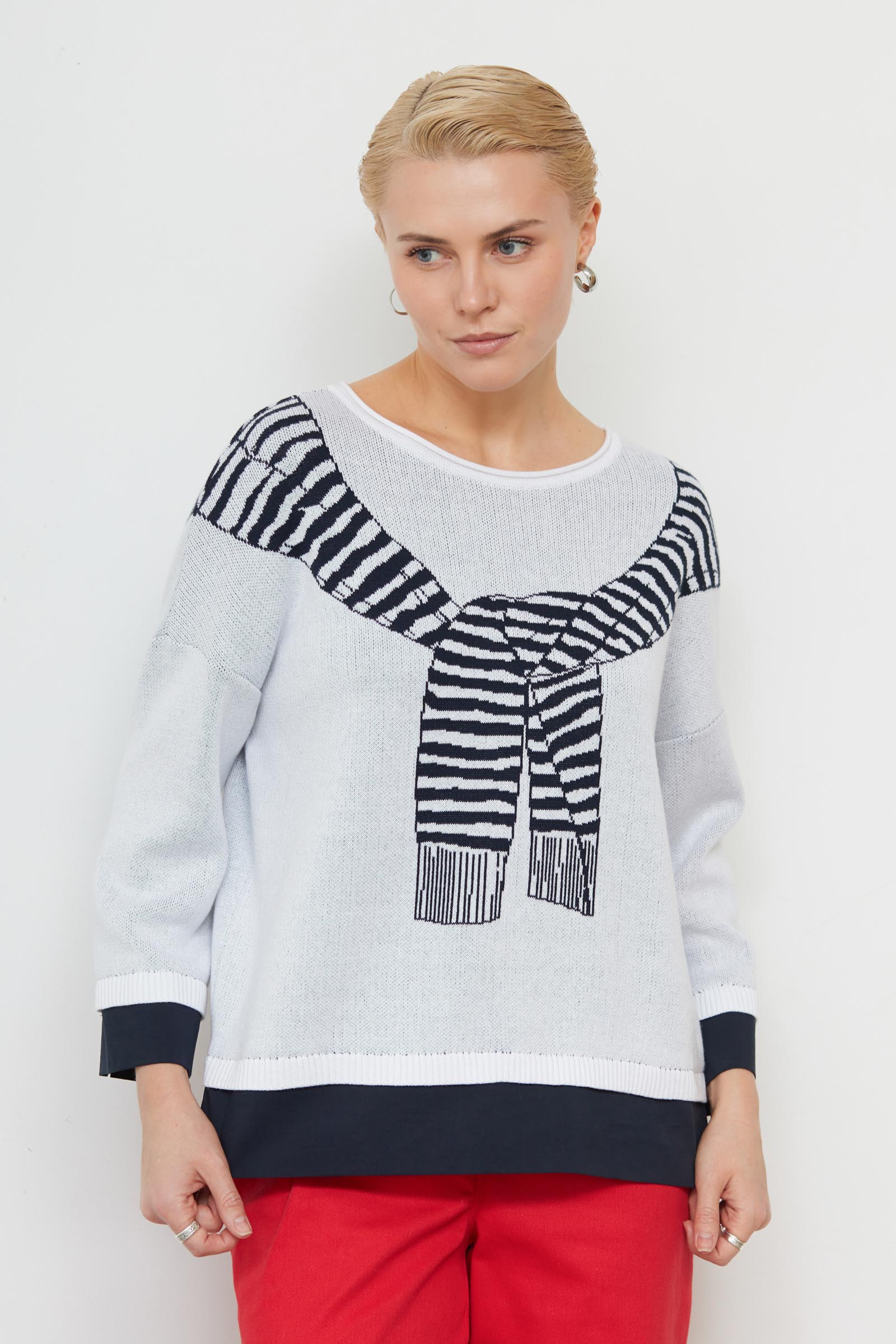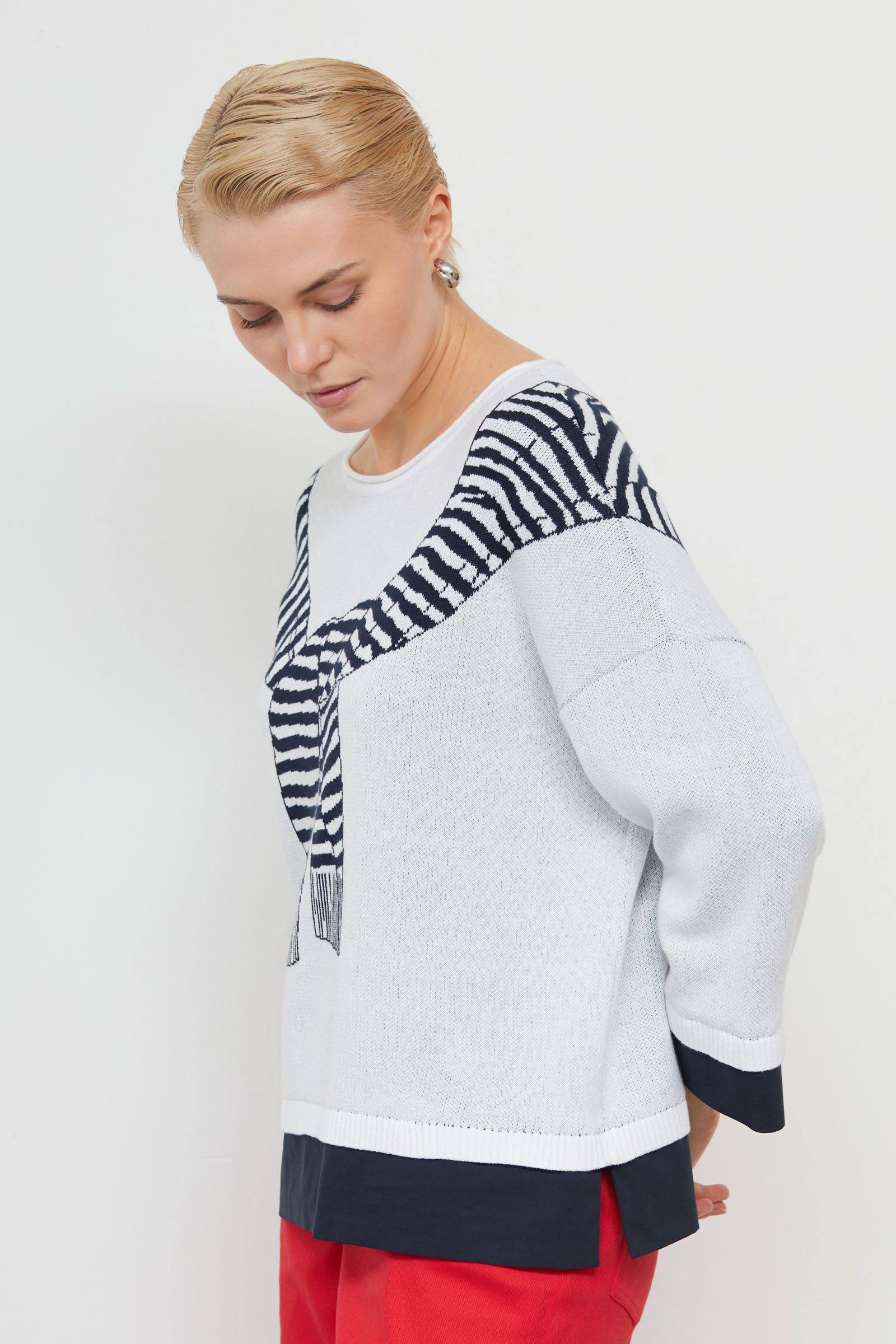 Комбинированный джемпер из мягкого трикотажа жаккардовой вязки с рисунком в виде накинутого джемпера и текстильными вставками по низу.