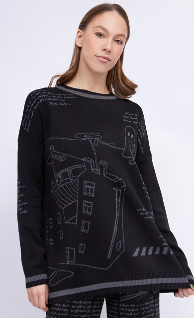Лонгслив из вискозного трикотажа с отделкой из сетки и новогодним печатным принтом.