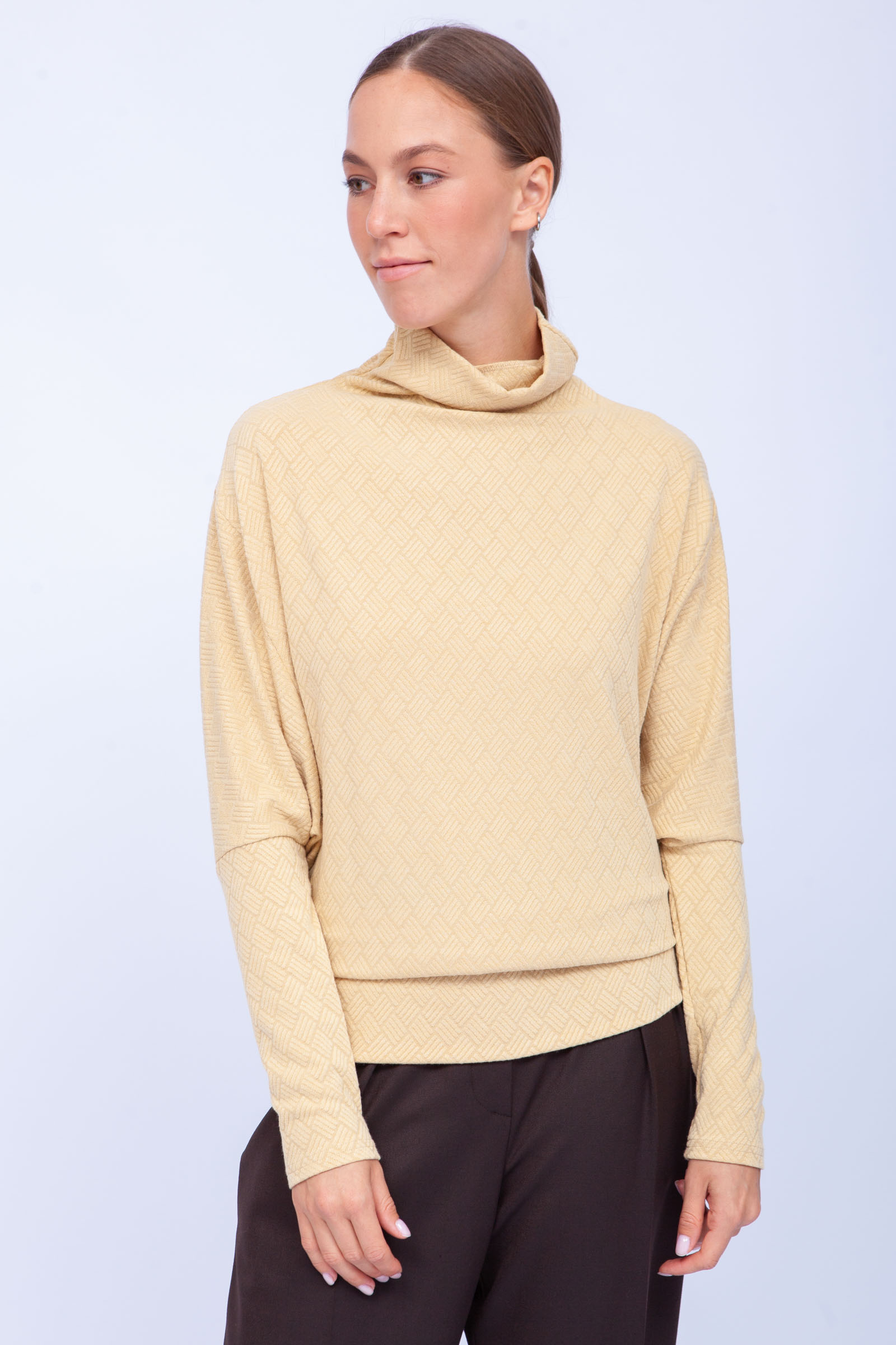 Джемпер из мягкого трикотажа с цельнокроеным воротником и посадкой на бедрах.