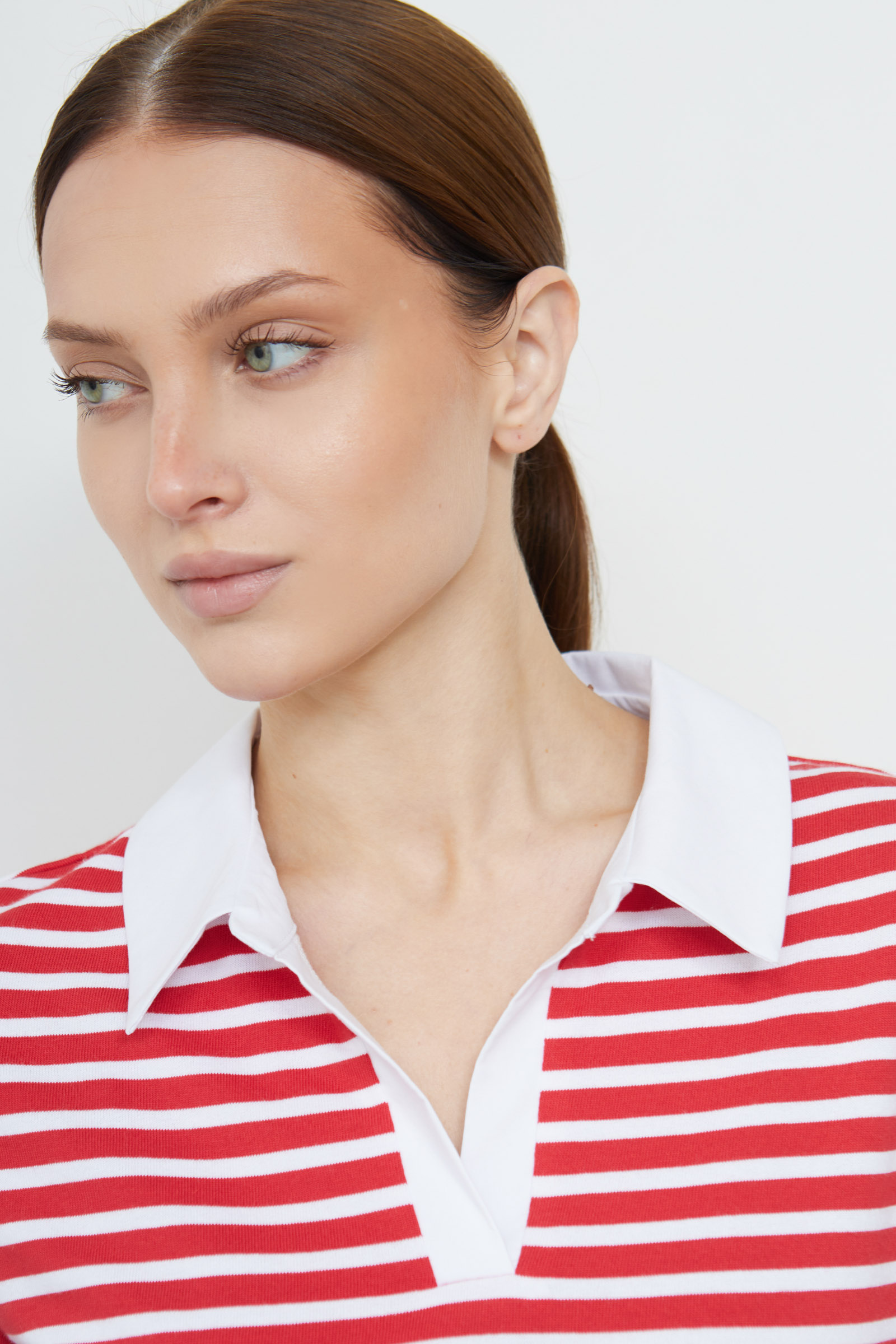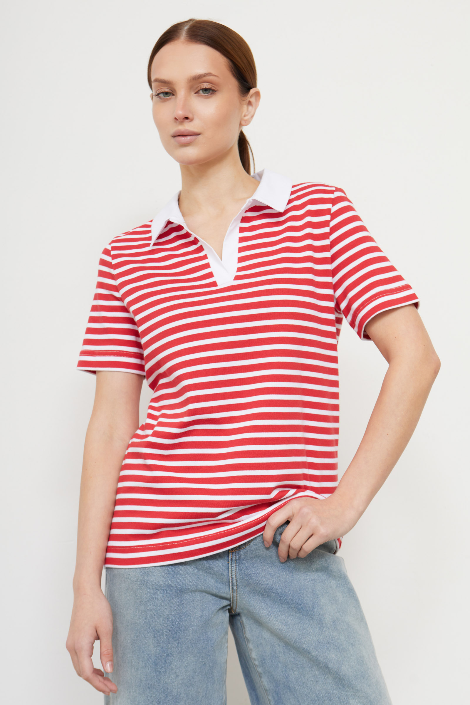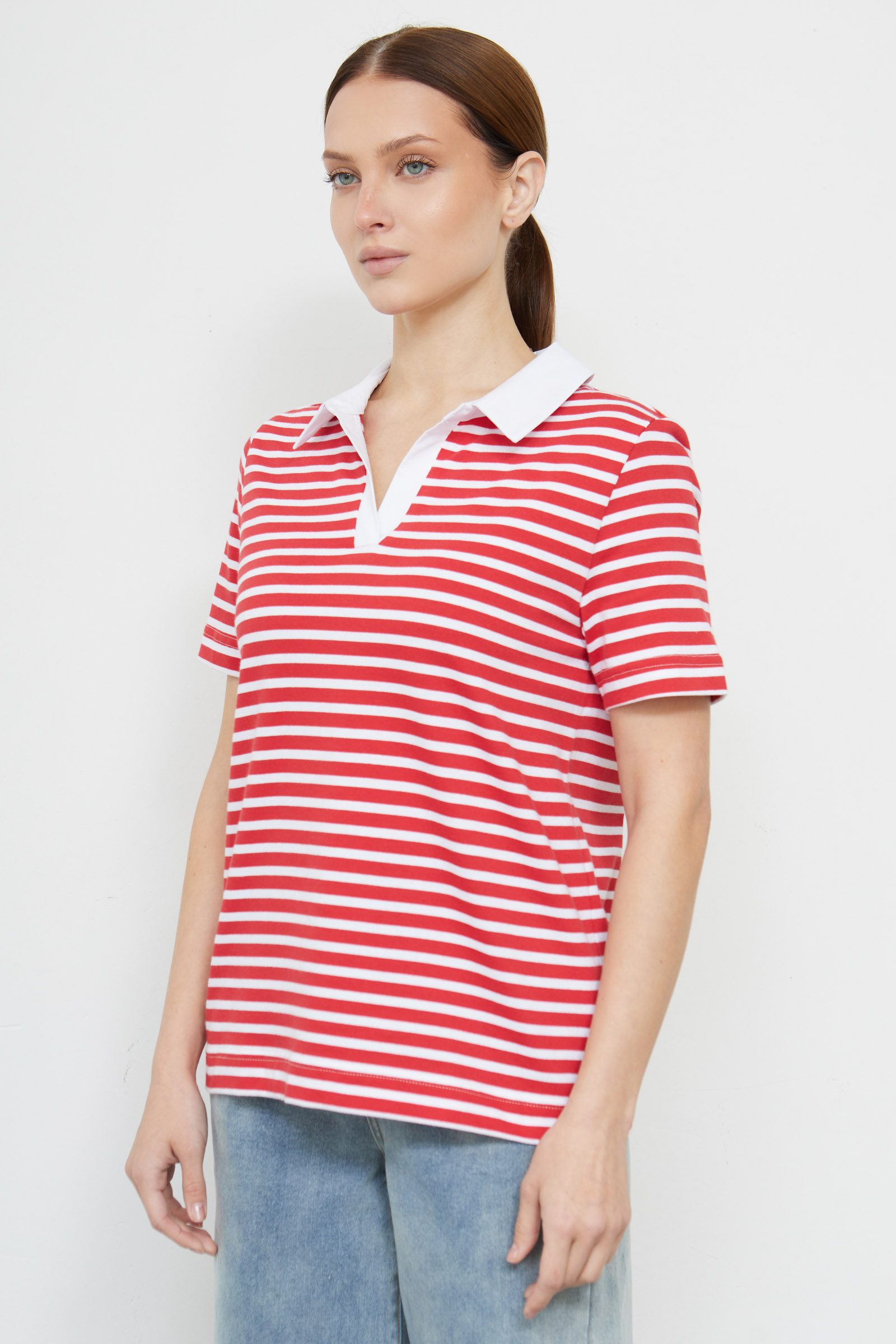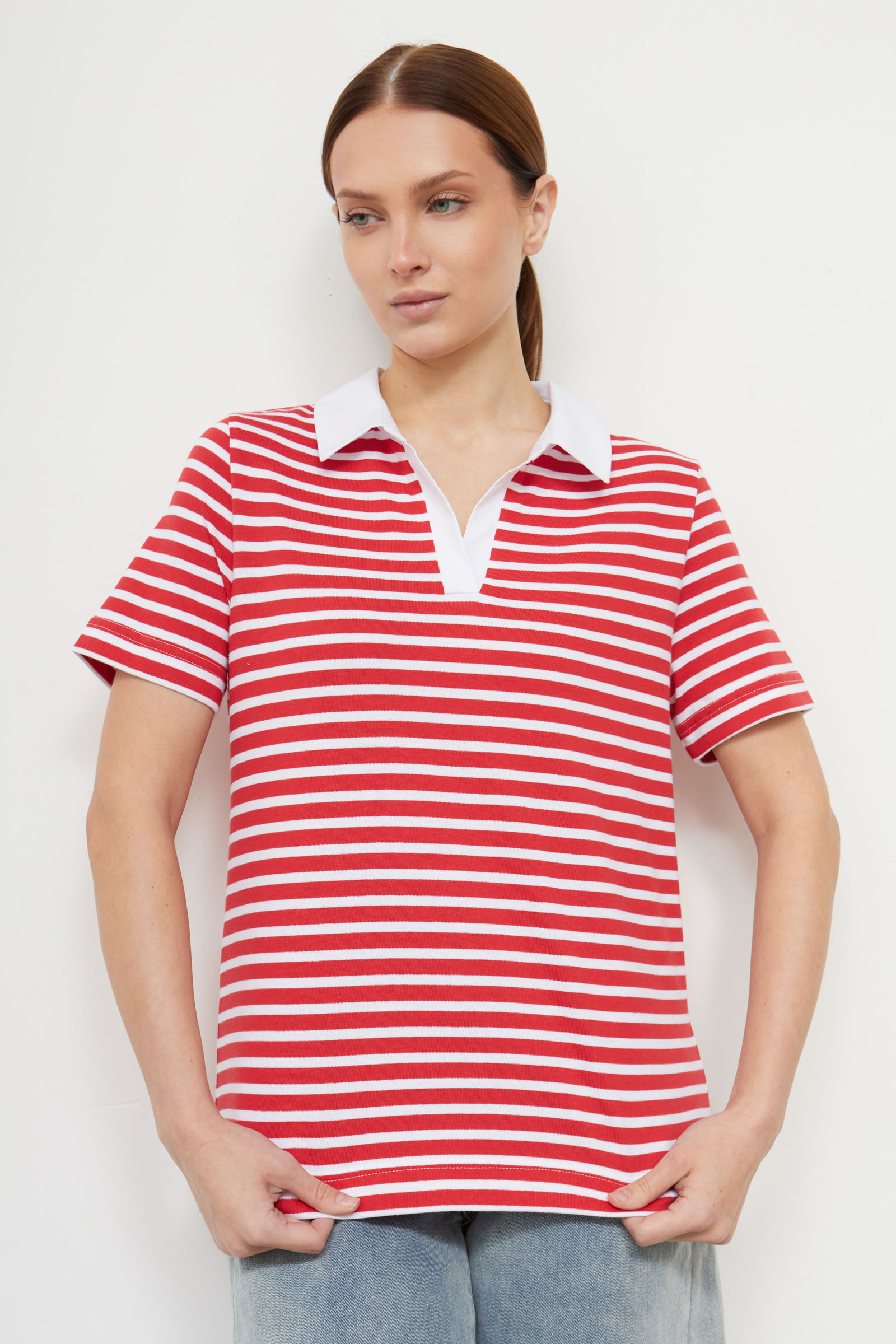 Футболка-поло из мягкого хлопкового трикотажа в полоску с контрастным воротником.