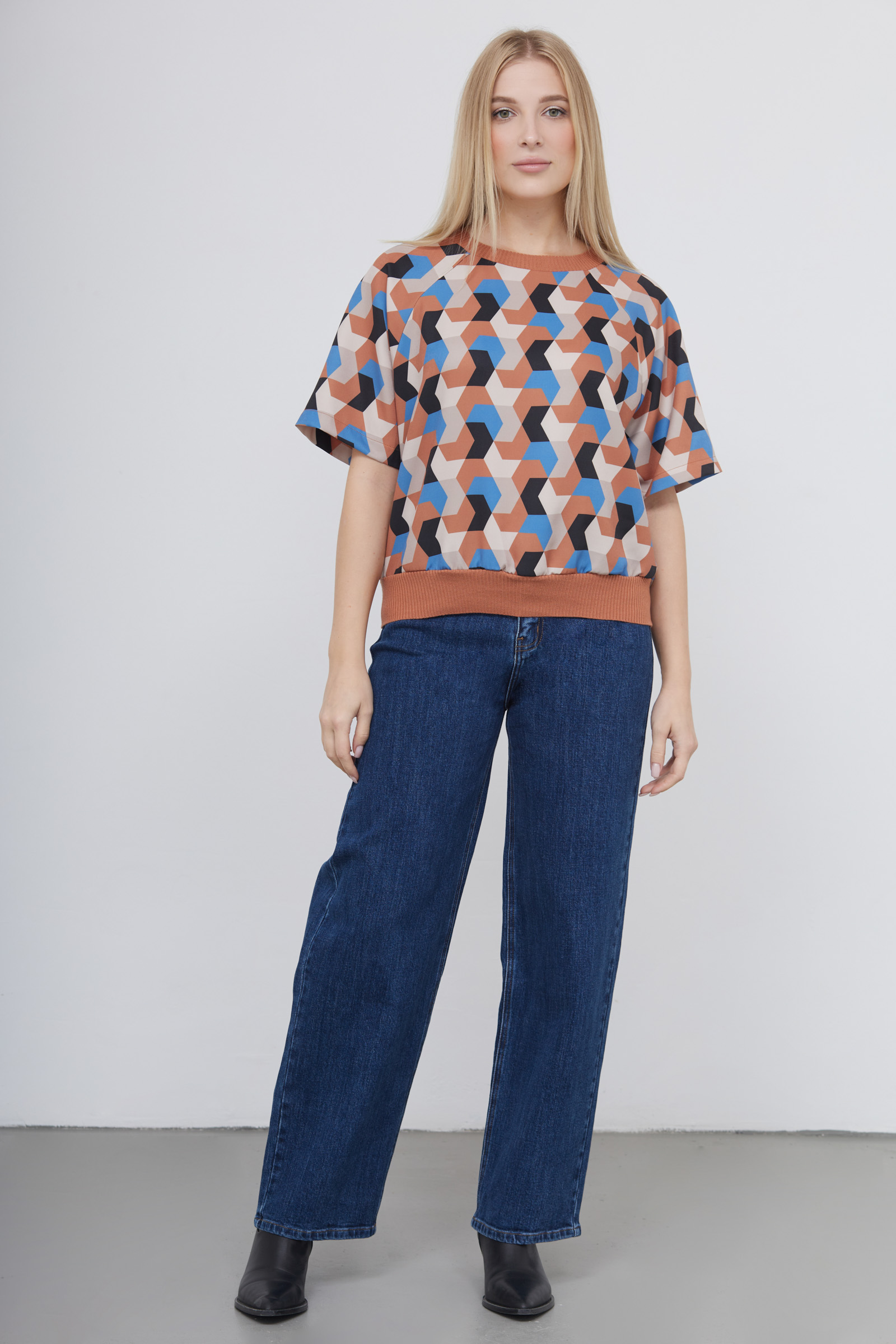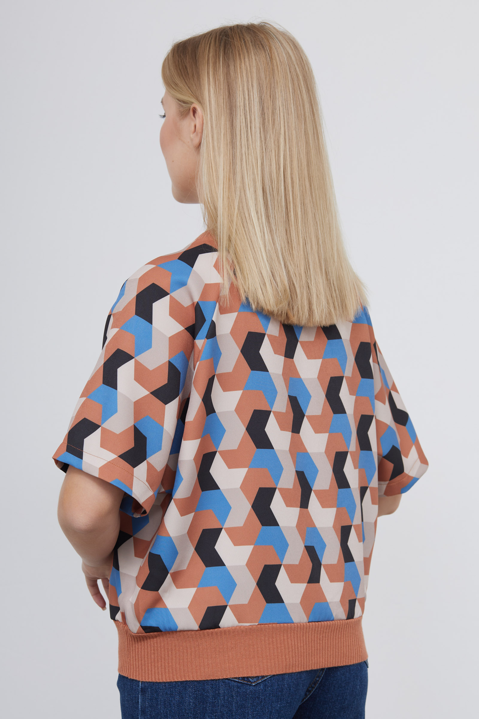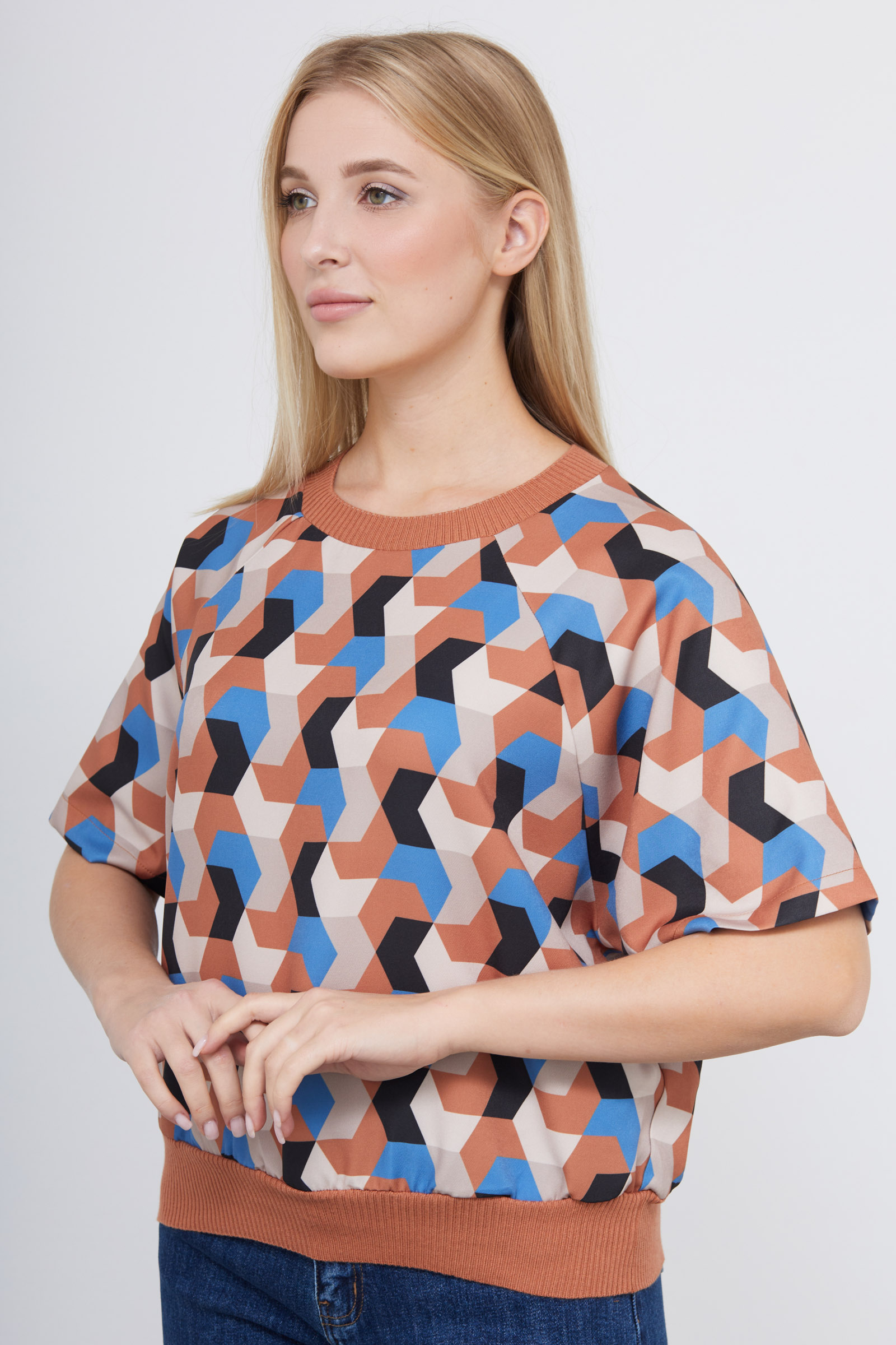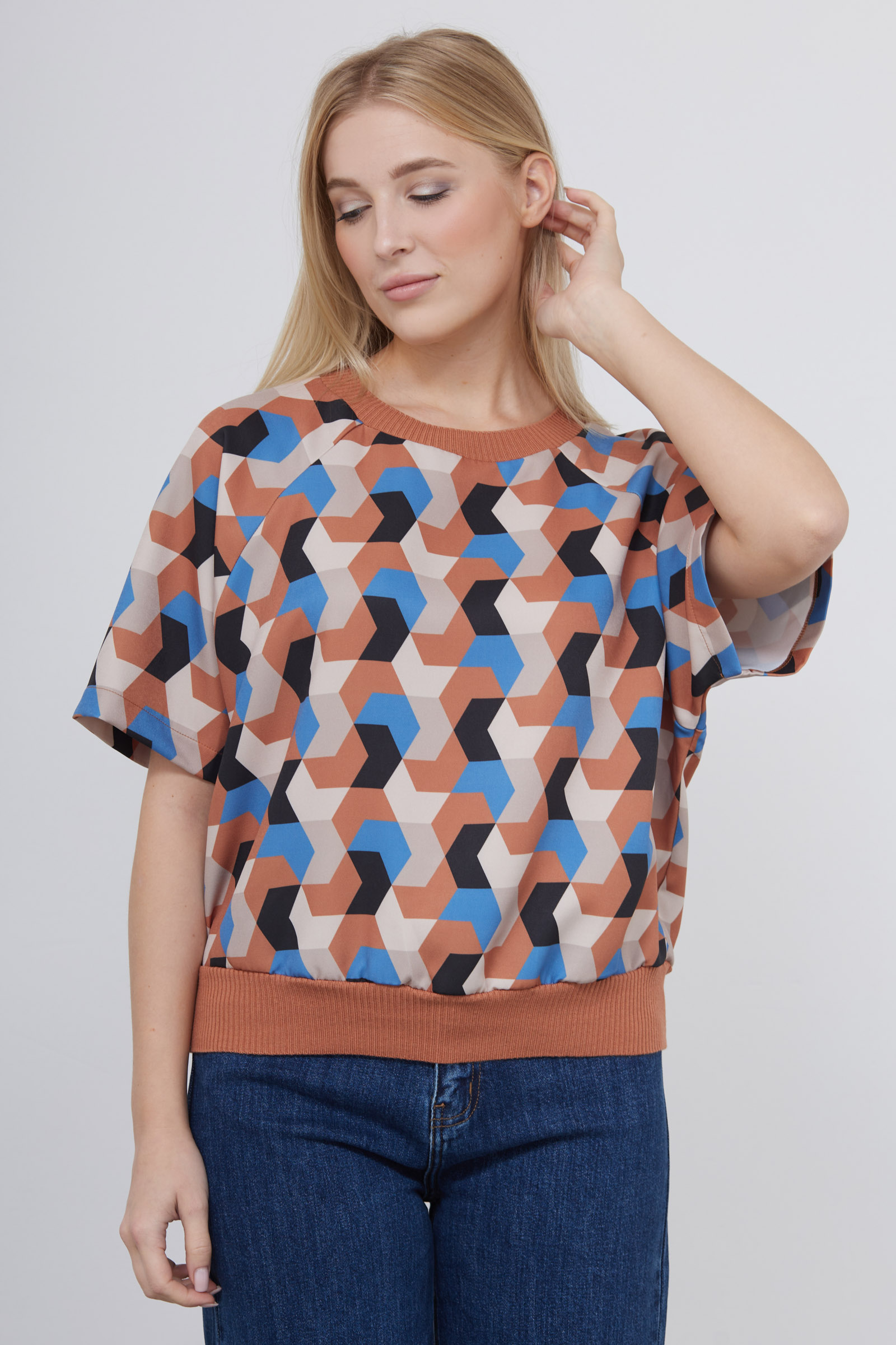 Блузка oversize c короткими рукавами, трикотажной отделкой и геометрическим принтом.