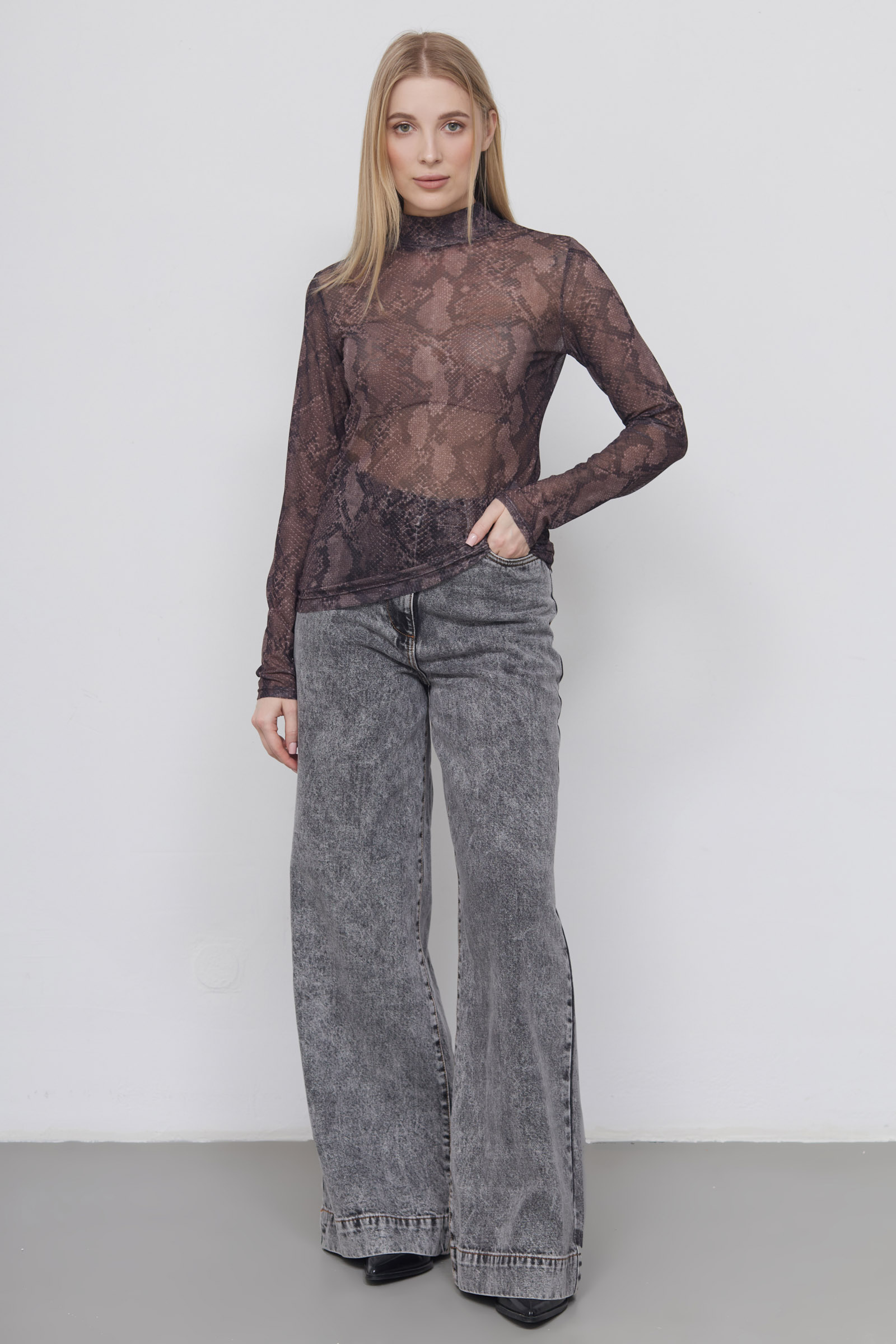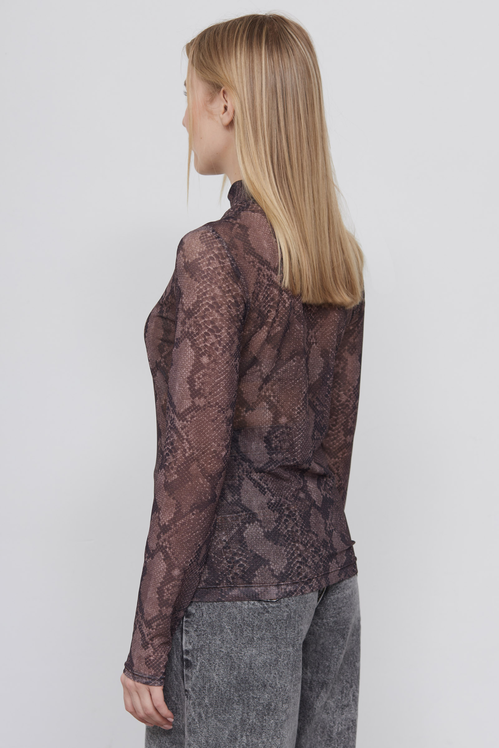 Водолазка из полупрозрачной сетки с анималистичным принтом.