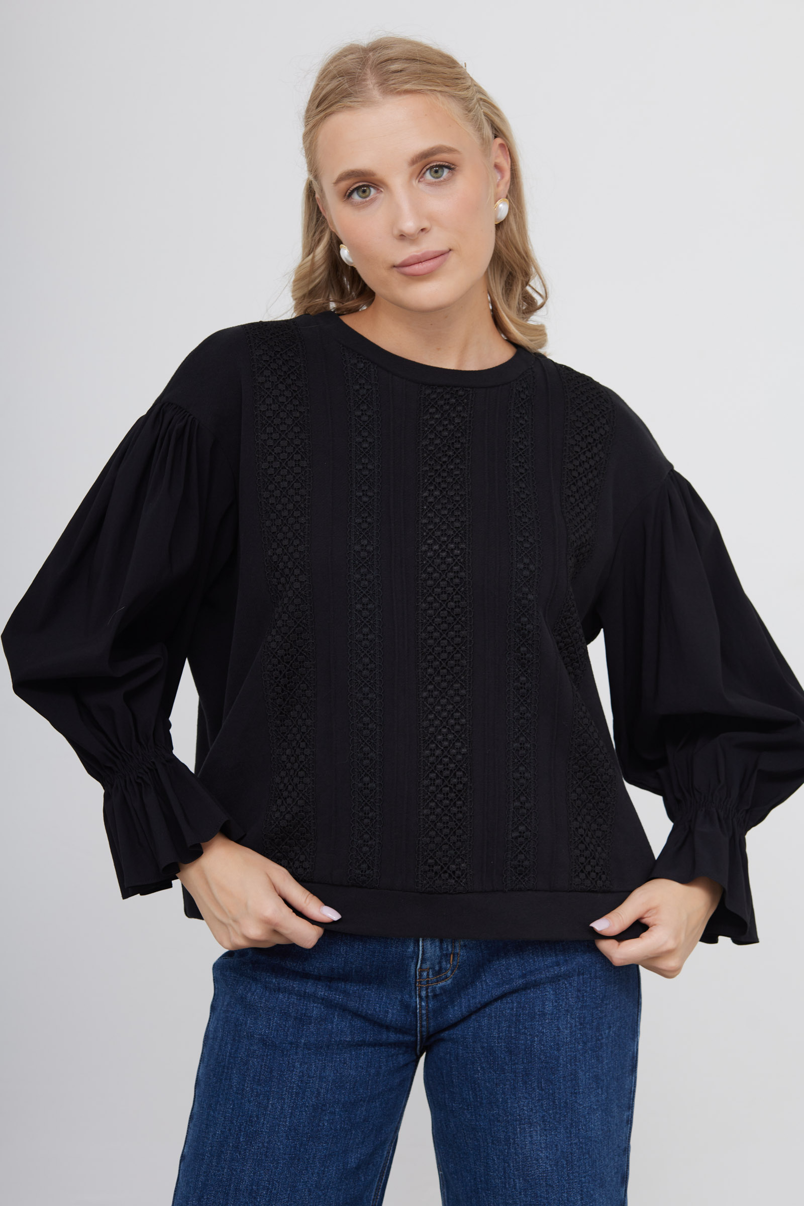 Комбинированный свитшот oversize из футера с рукавами-буфами из вискозы.