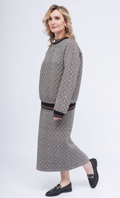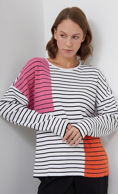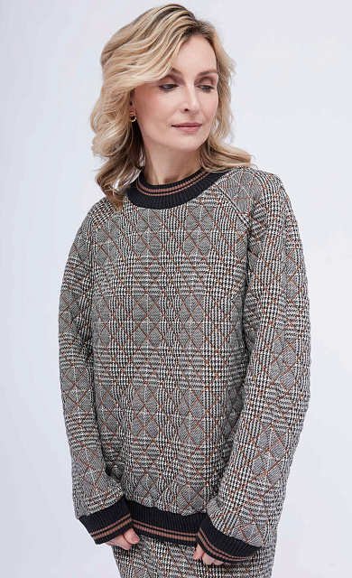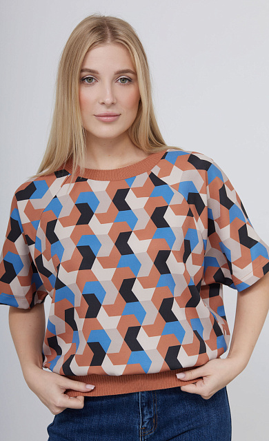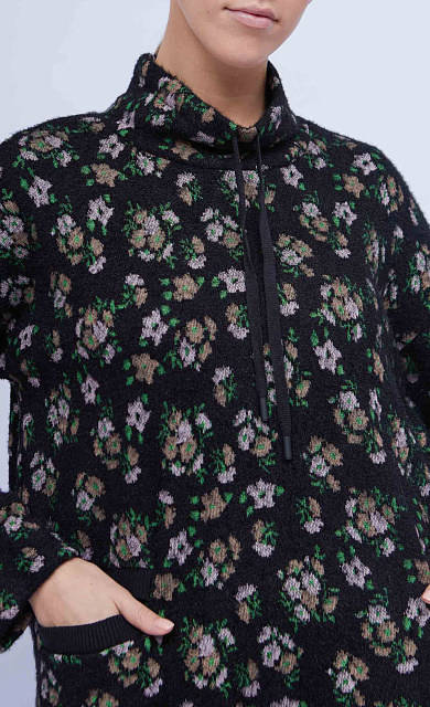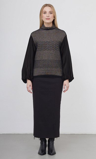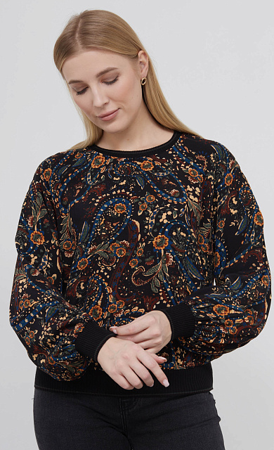 Комбинированный свитшот с фактурным орнаментом и рукавами из струящейся вискозы в горошек.