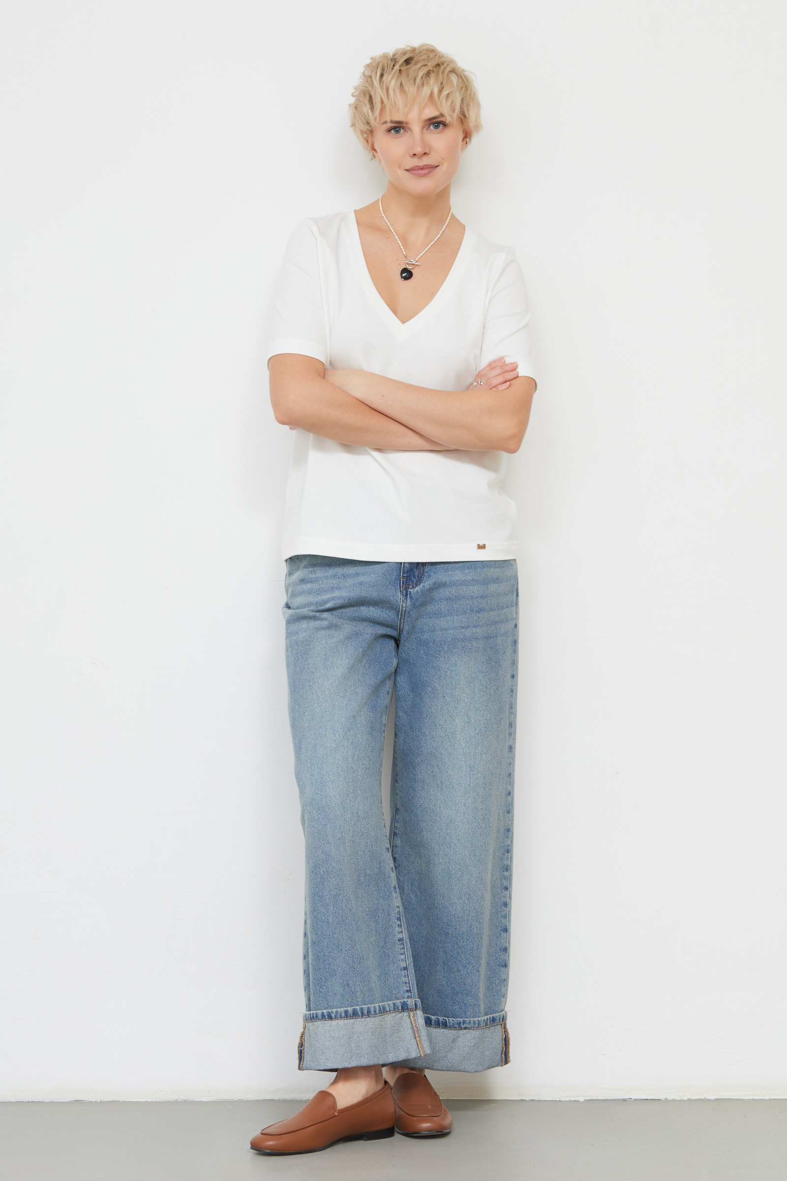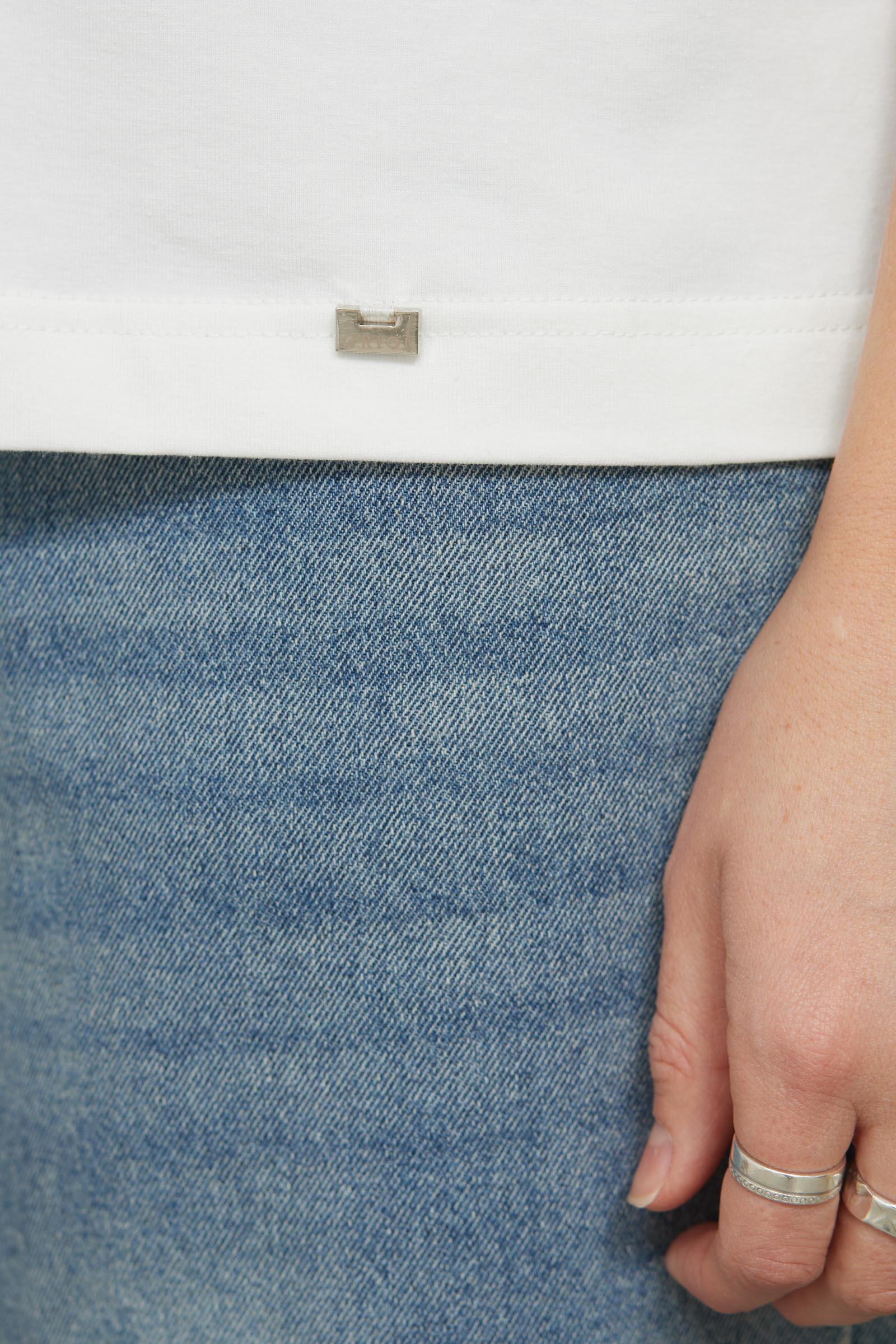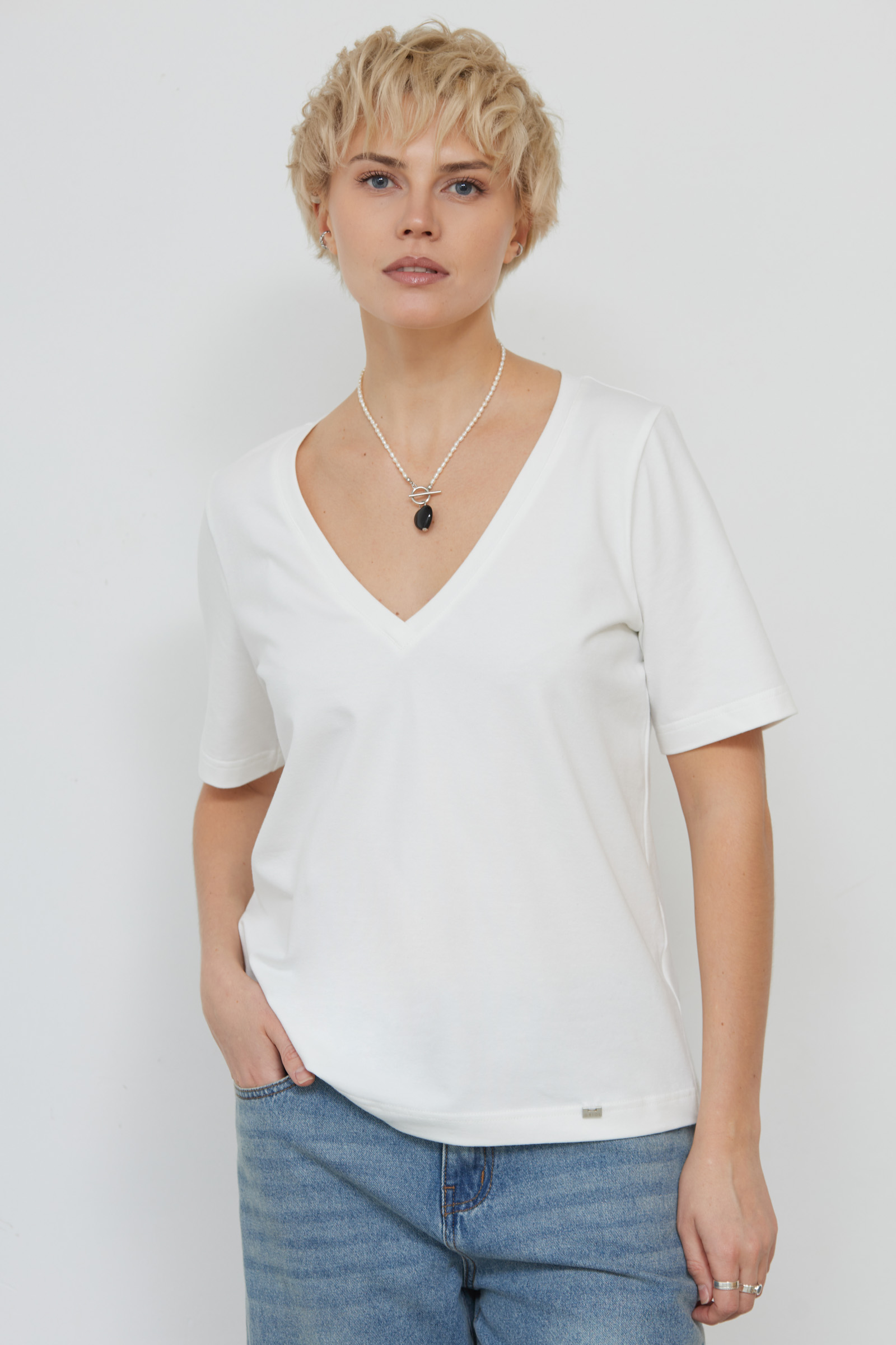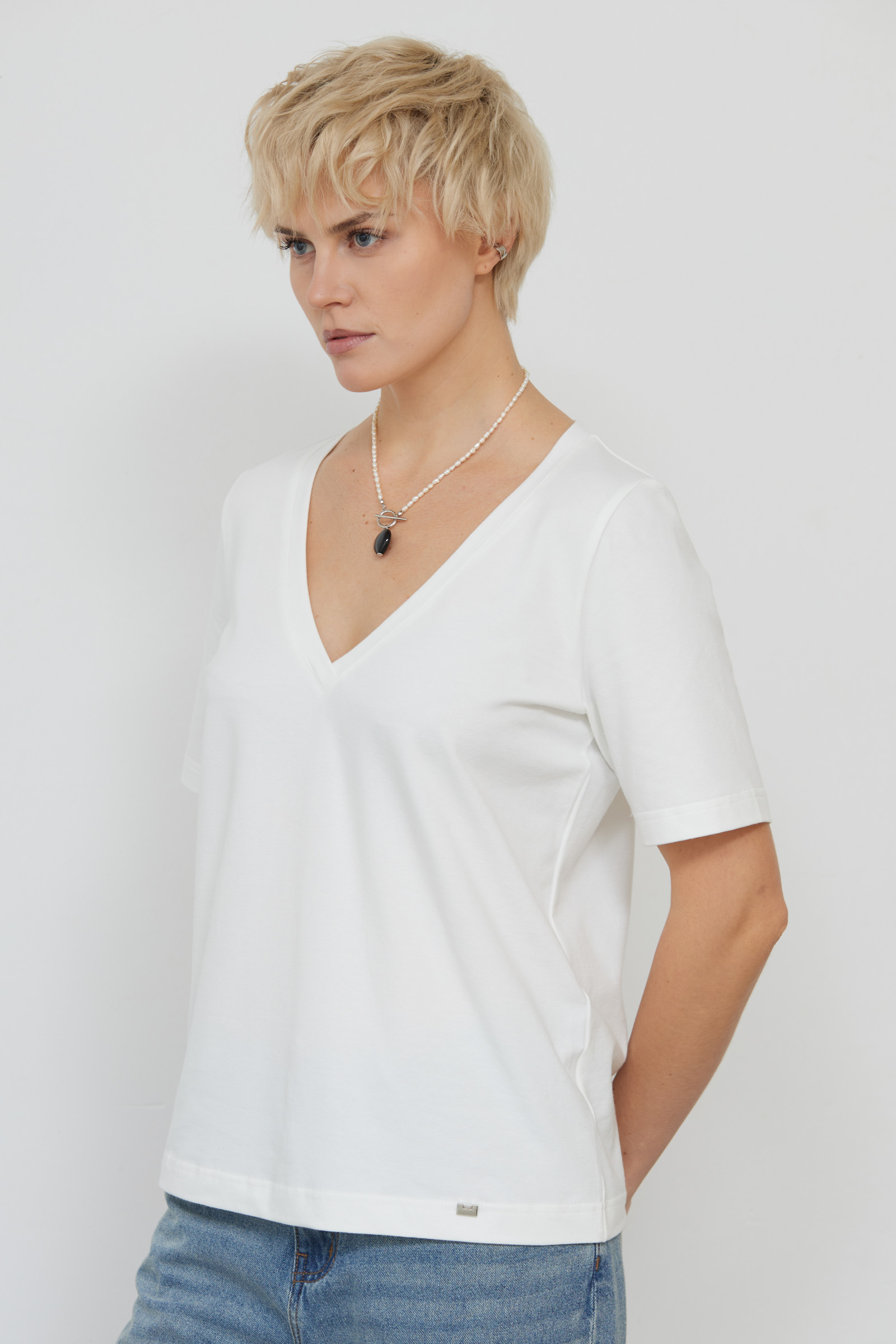 Базовая футболка из мягкого хлопкового трикотажа с V-вырезом.