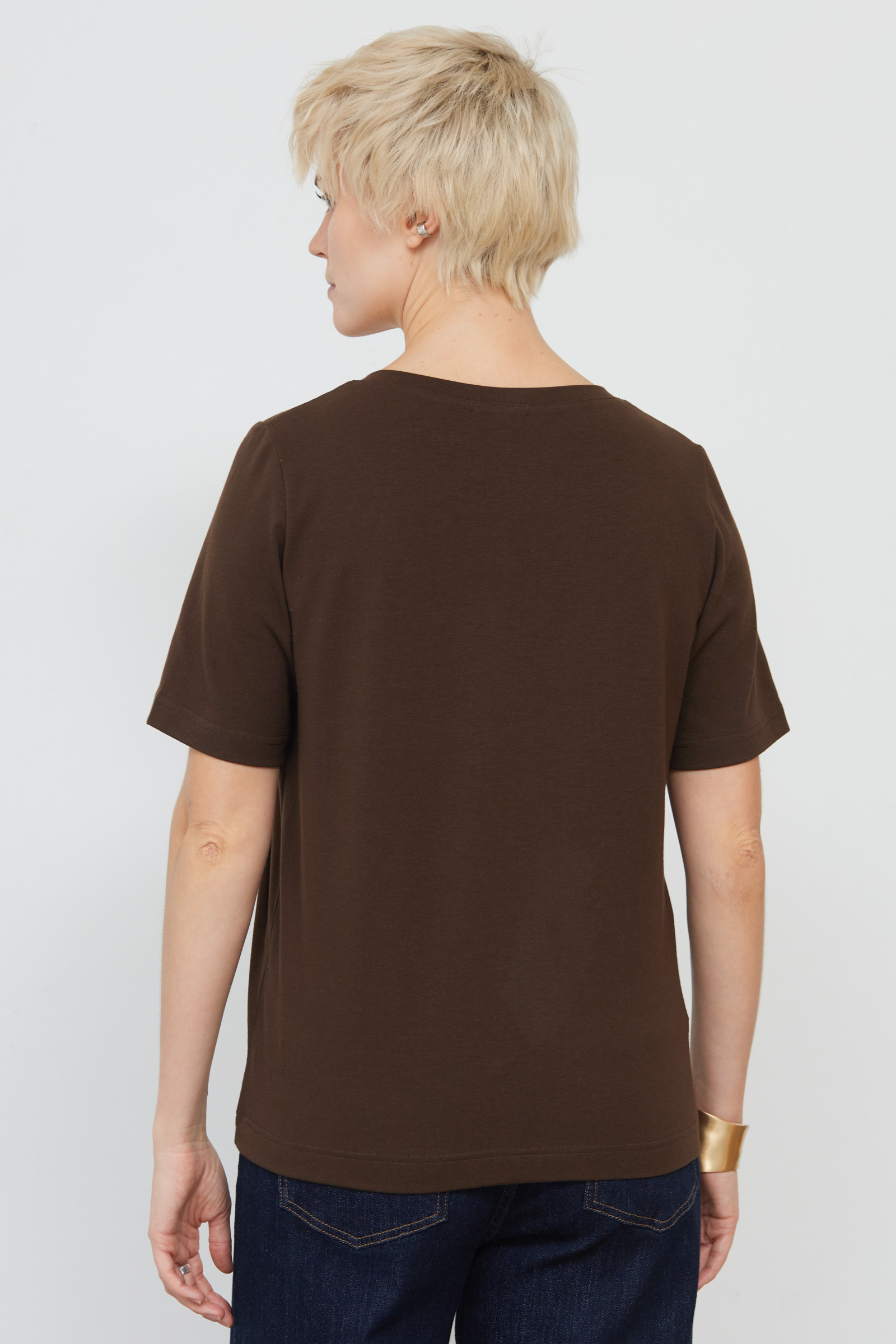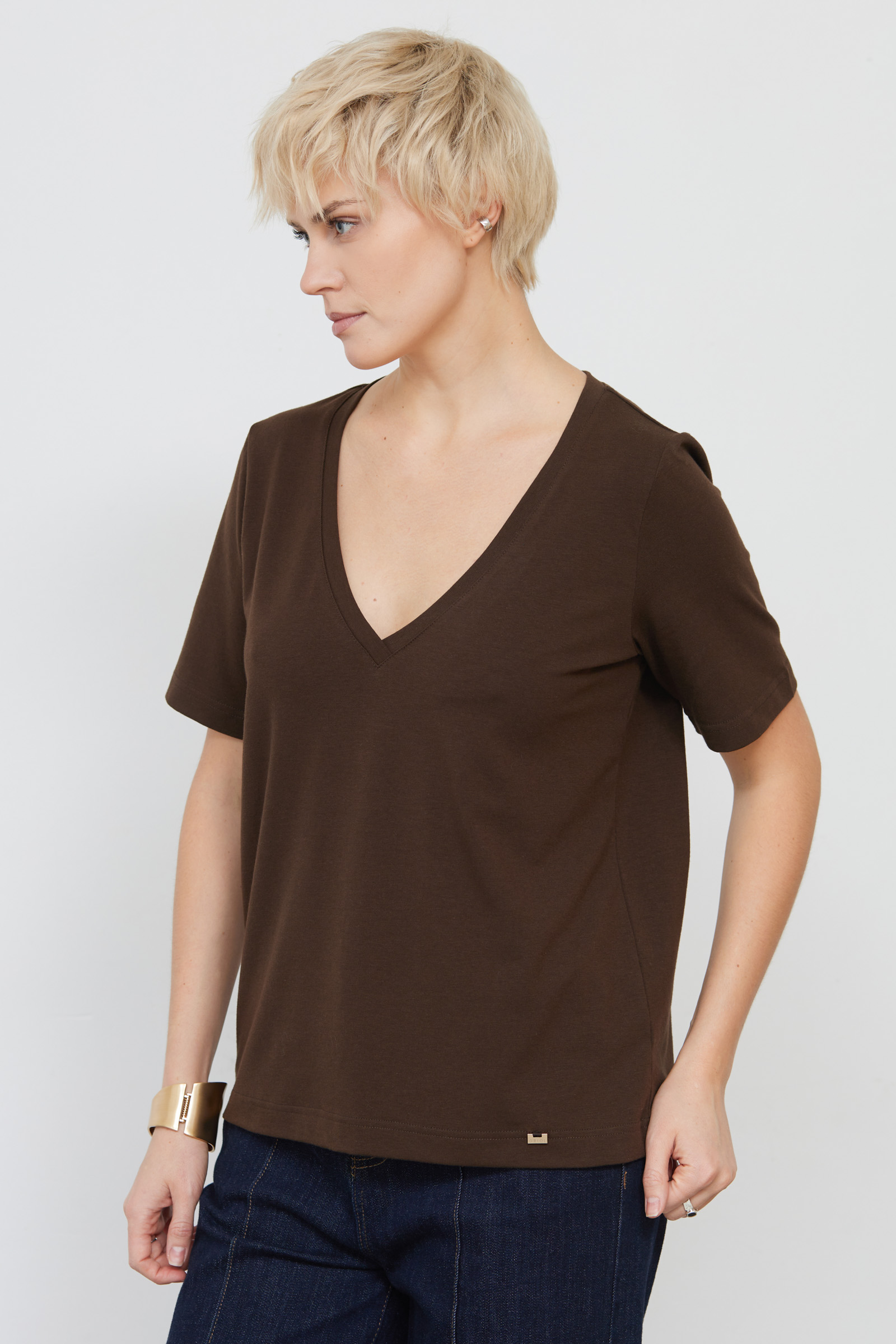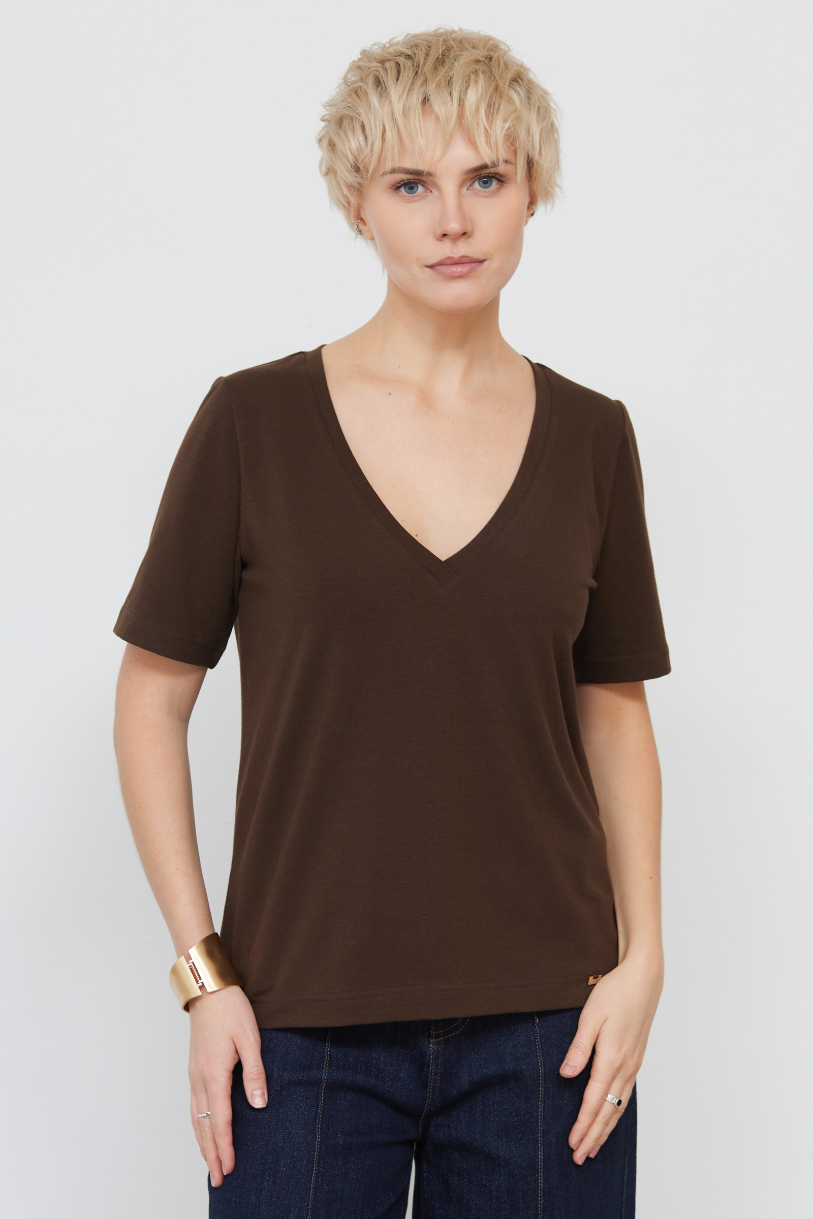 Базовая футболка из мягкого хлопкового трикотажа с V-вырезом.