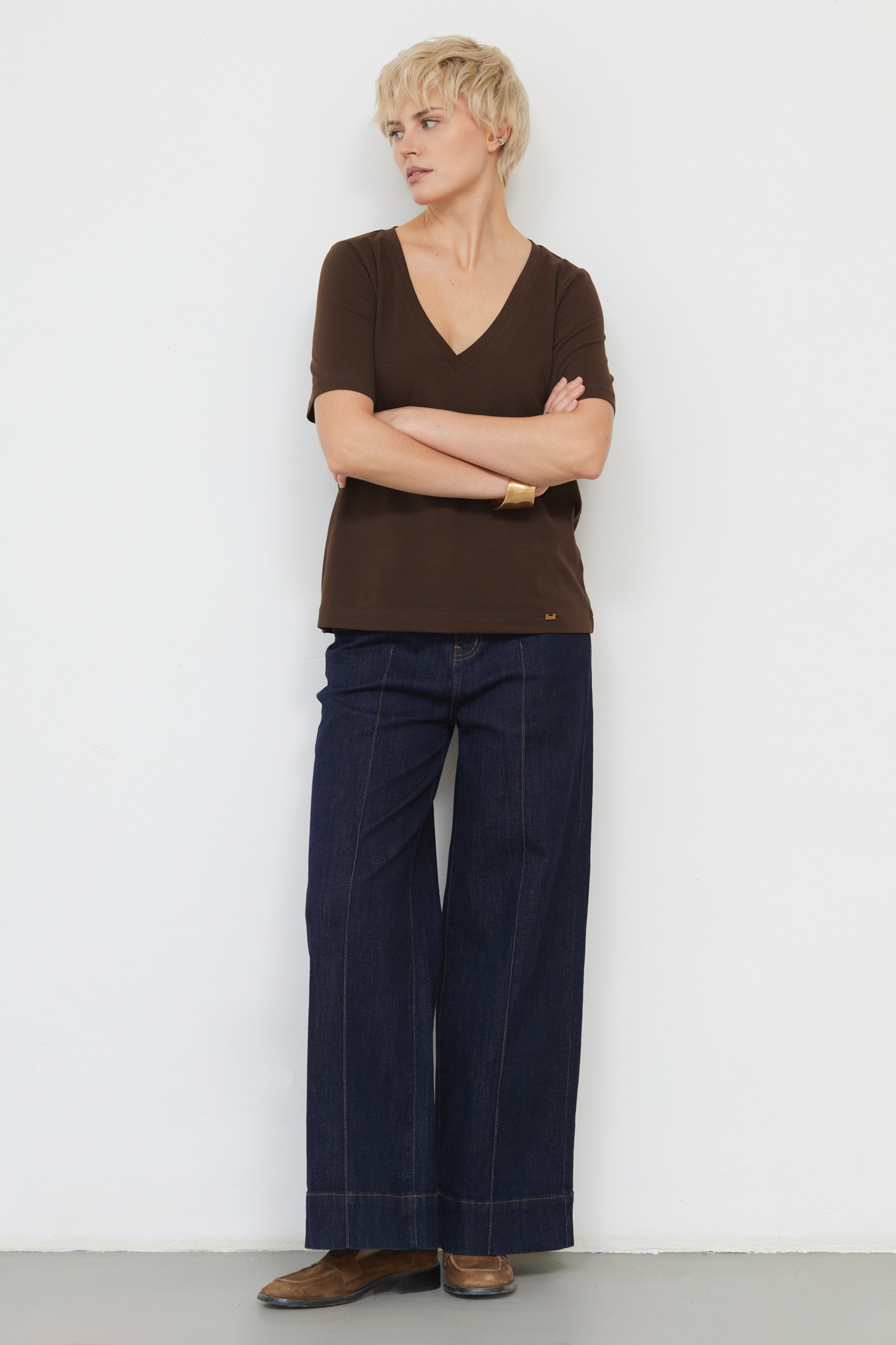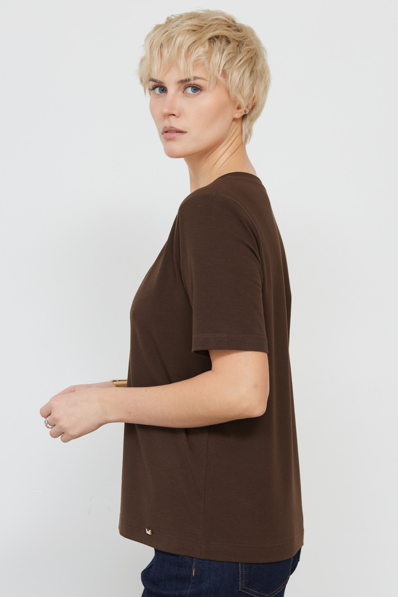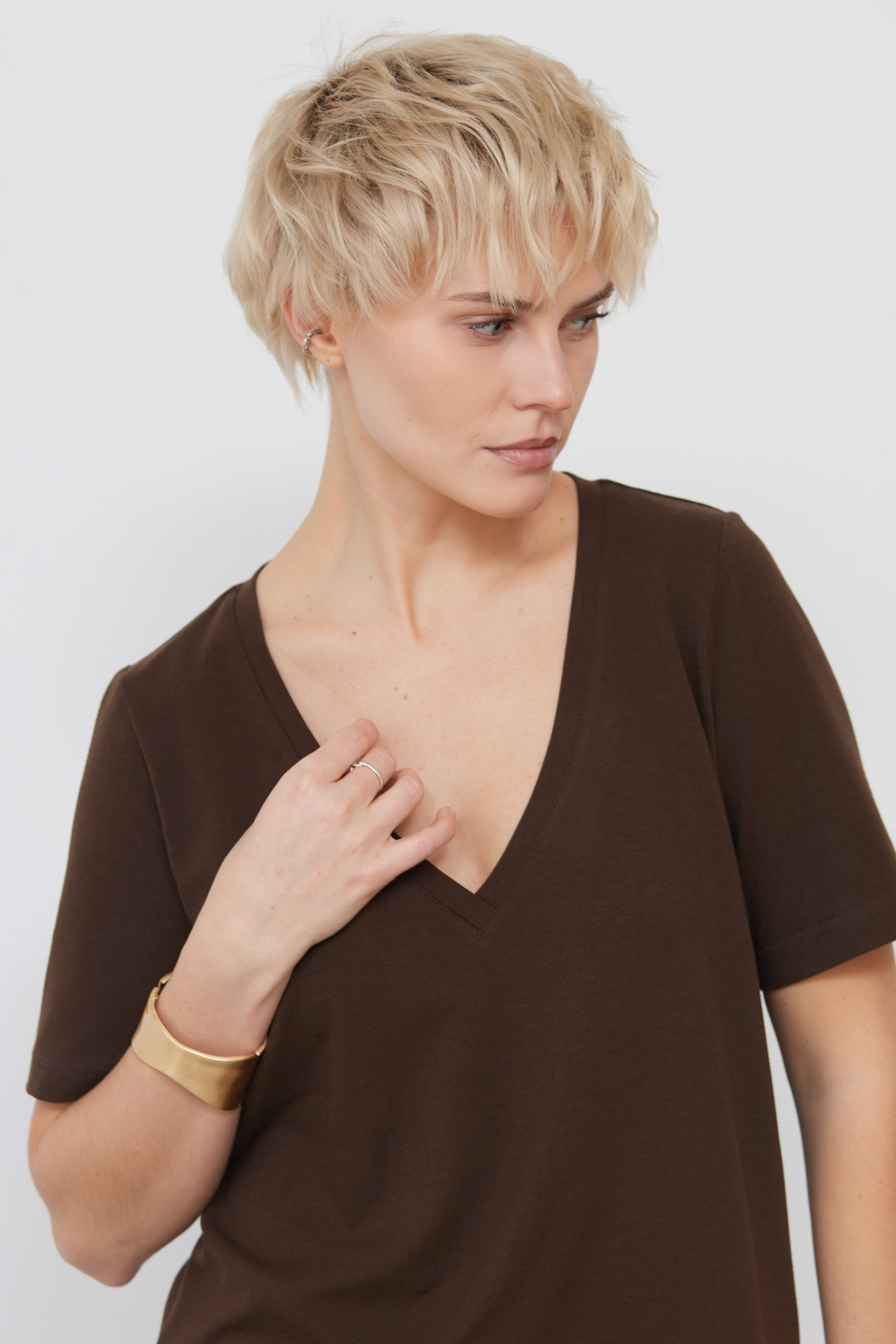 Базовая футболка из мягкого хлопкового трикотажа с V-вырезом.