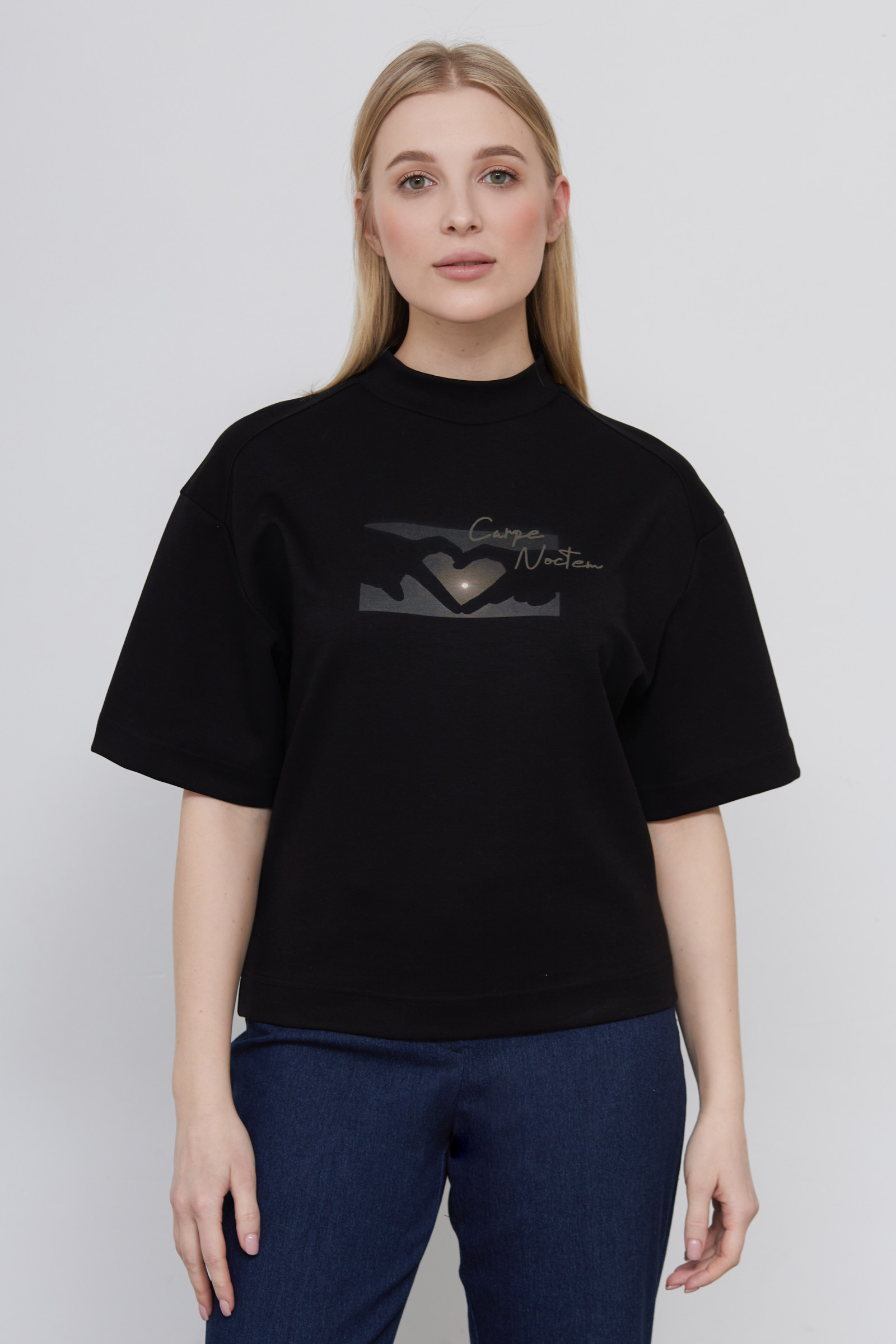 Футболка oversize из плотного хлопкового трикотажа с высоким воротником и печатным принтом.