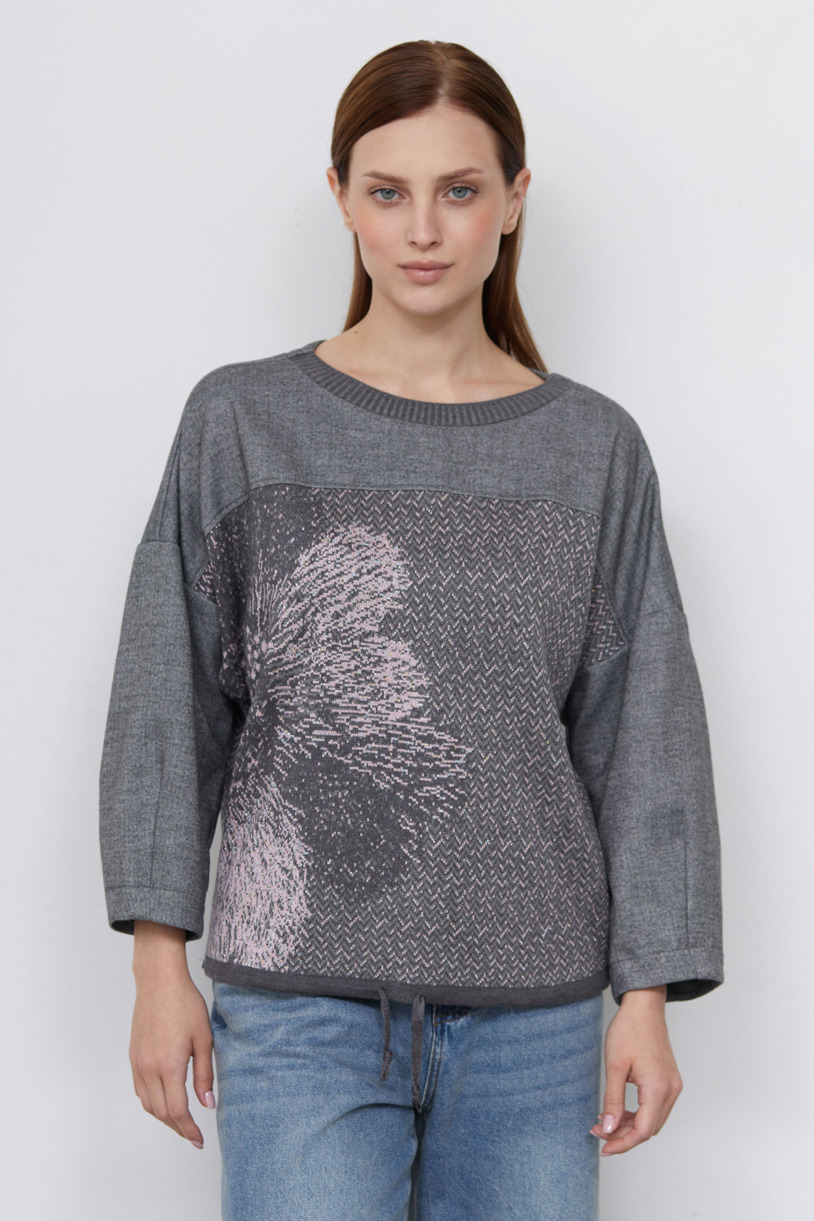 Комбинированный джемпер oversize с полочкой жаккардовой вязки и рукавами из полвискозы с меланжевым эффектом.