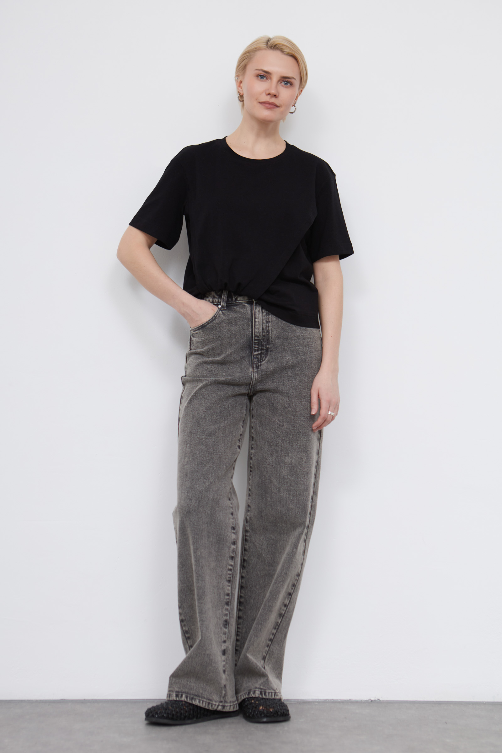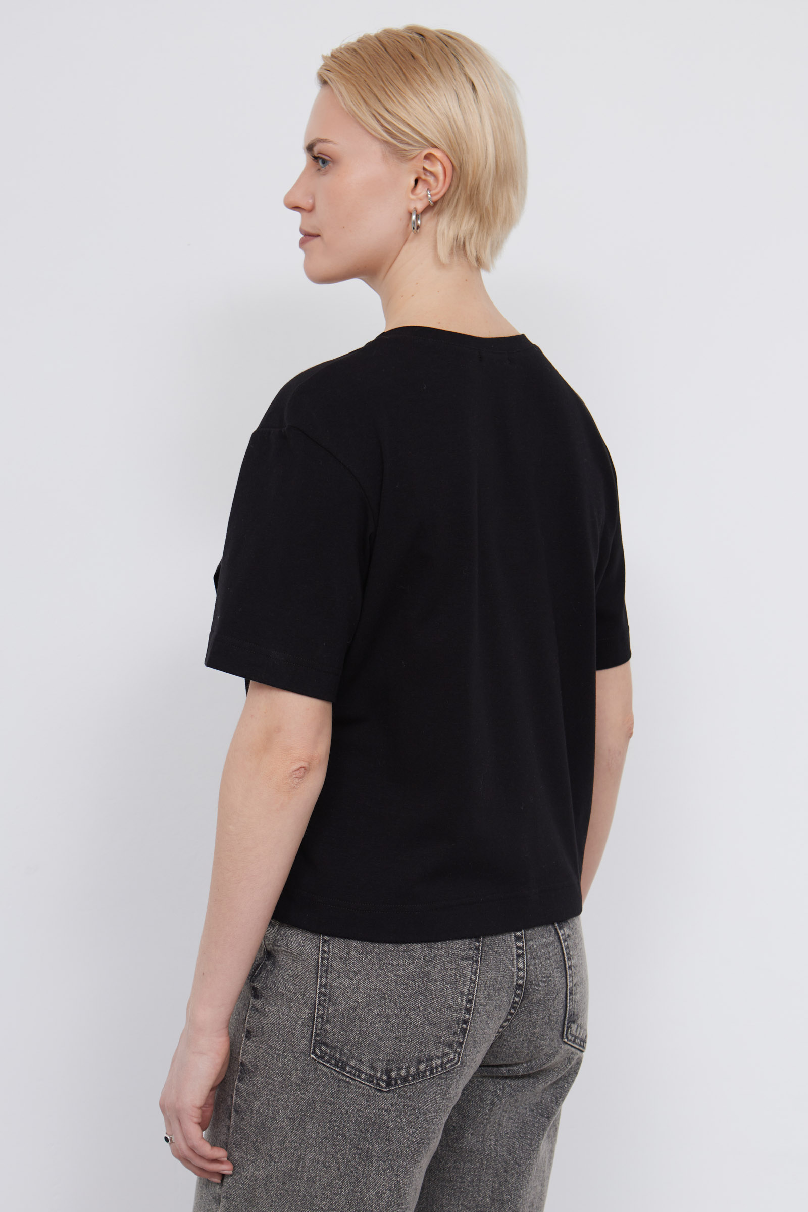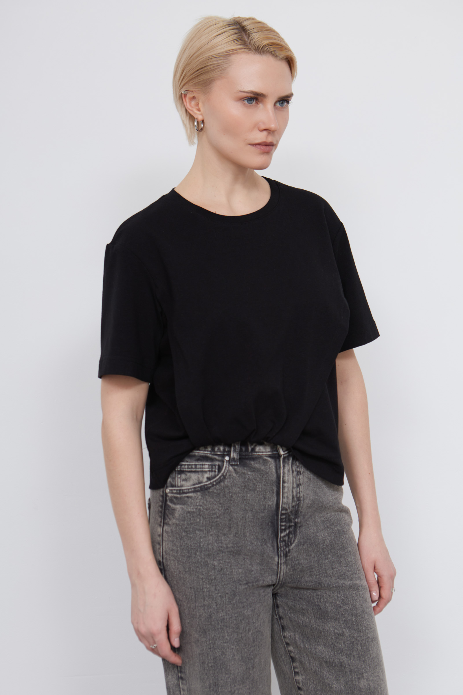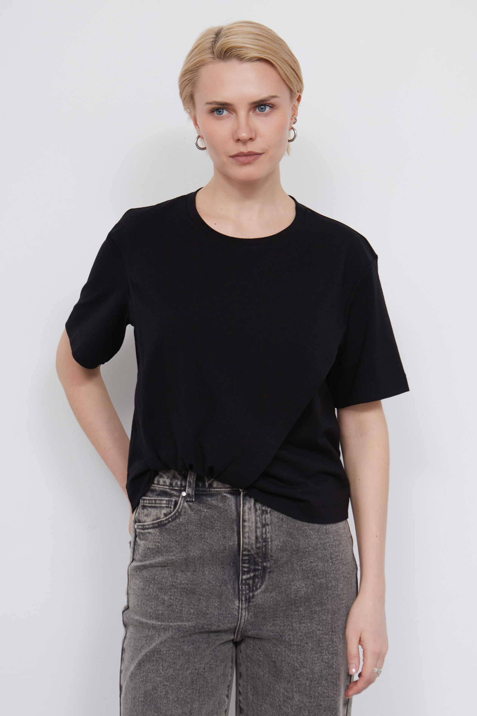 Укороченная футболка из мягкого хлопкового трикотажа с асимметричным низом и сборкой.