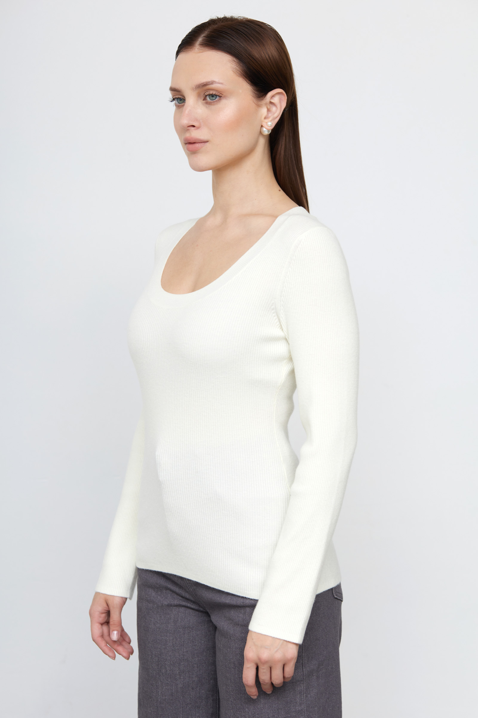 Базовый облегающий джемпер из мягкого вязаного трикотажа в рубчик с добавлением вискозы и шерсти.