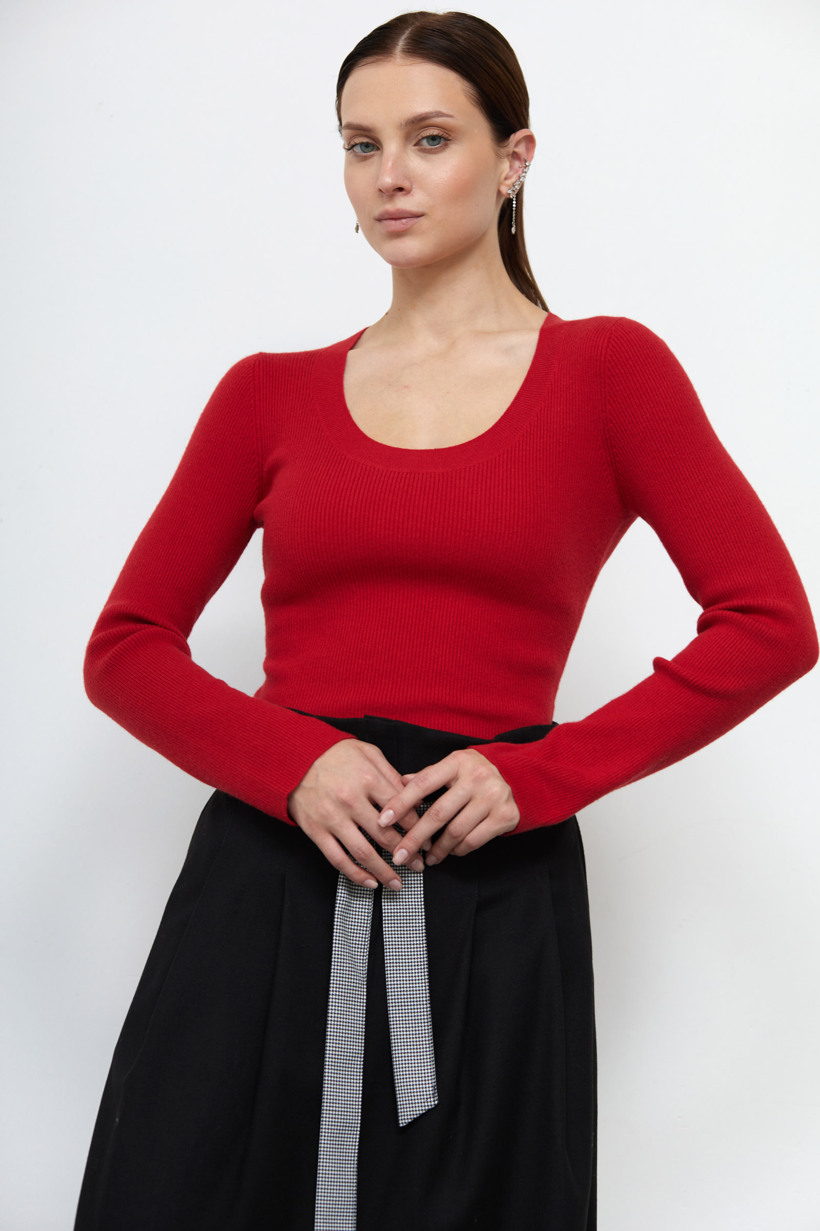 Базовый облегающий джемпер из мягкого вязаного трикотажа в рубчик с добавлением вискозы и шерсти.