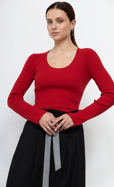 Базовый облегающий джемпер из мягкого вязаного трикотажа в рубчик с добавлением вискозы и шерсти.