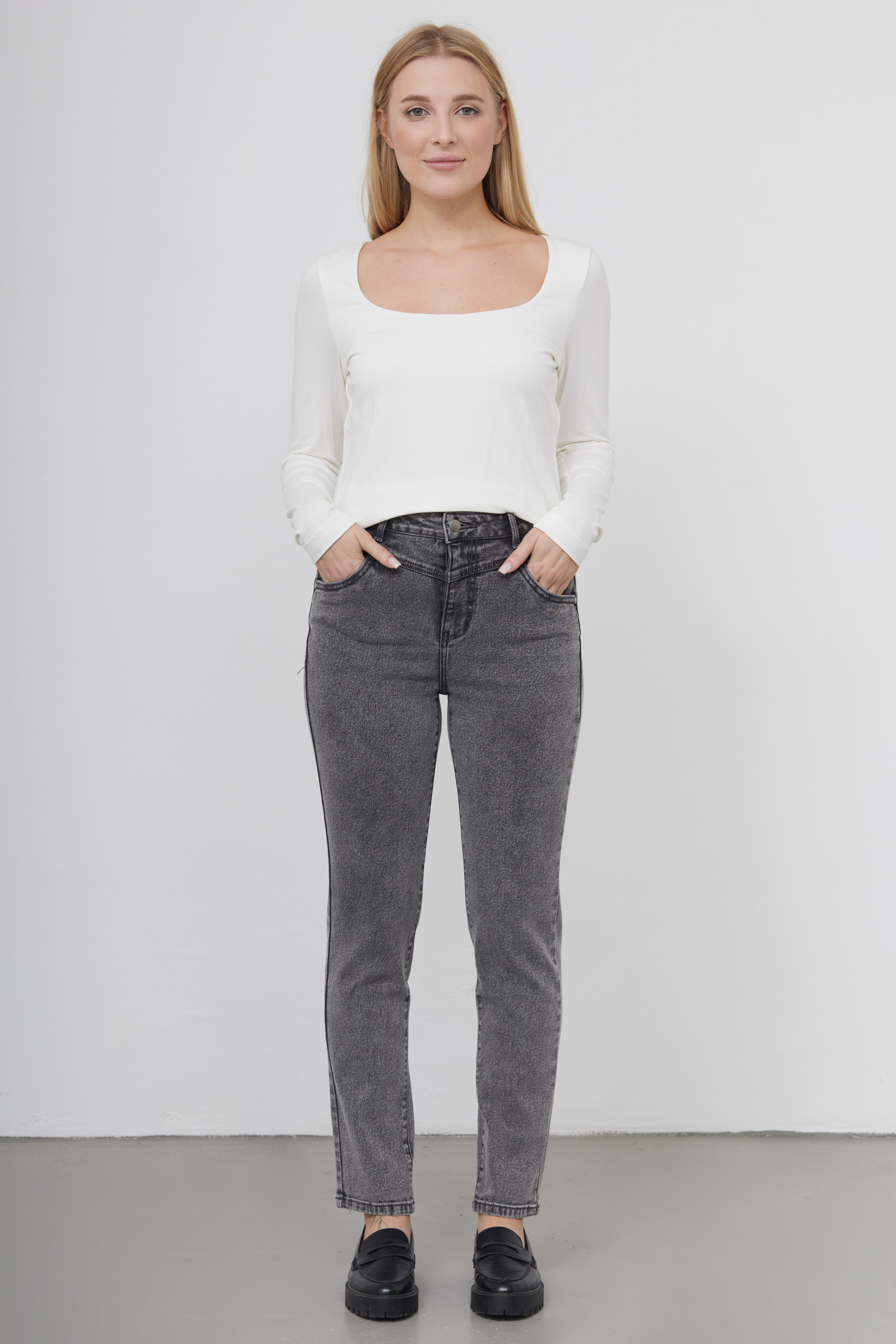 Джинсы зауженные из мягкого эластичного денима с вареным эффектом.