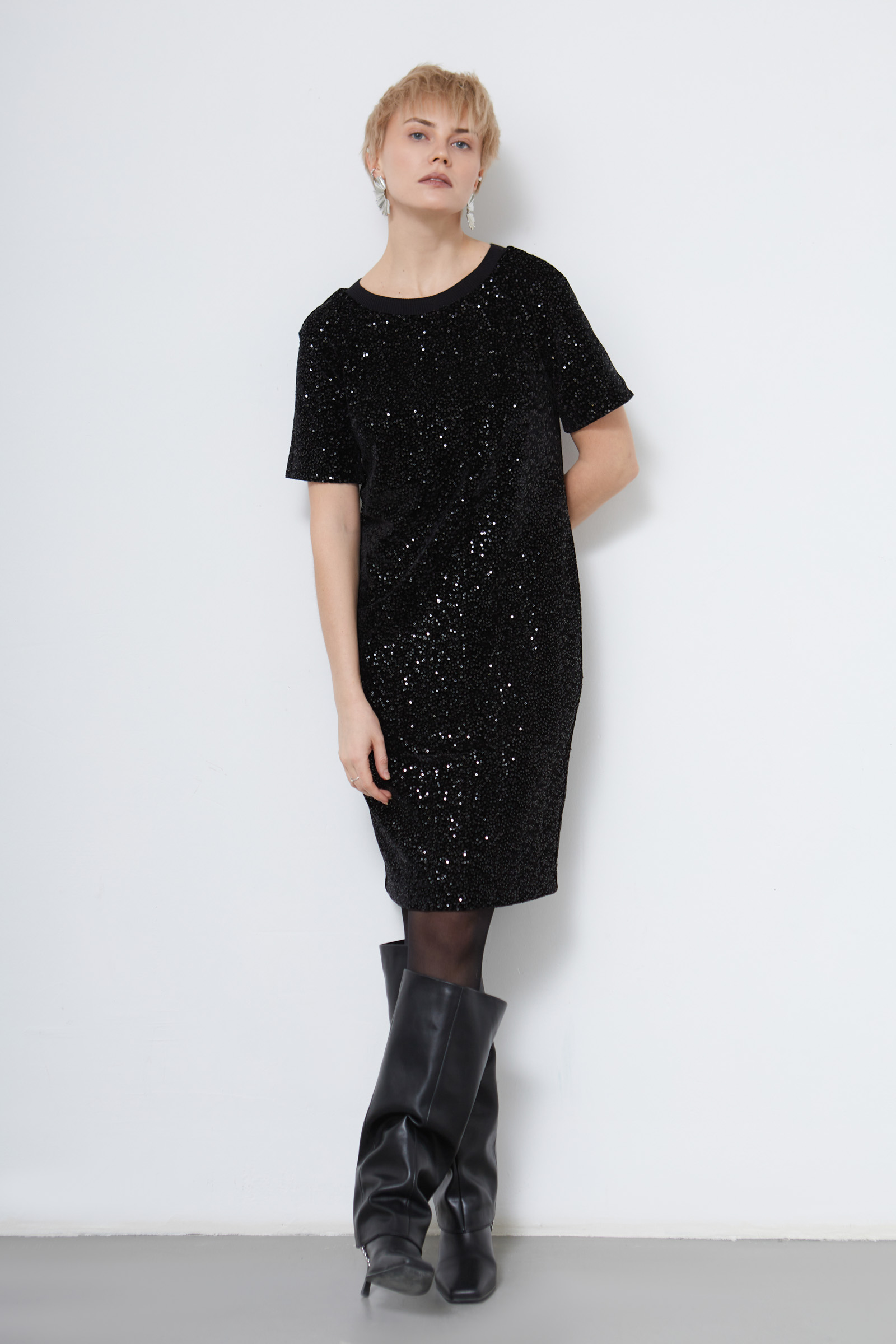Платье из бархата с пайетками, короткими рукавами и трикотажной отделкой.