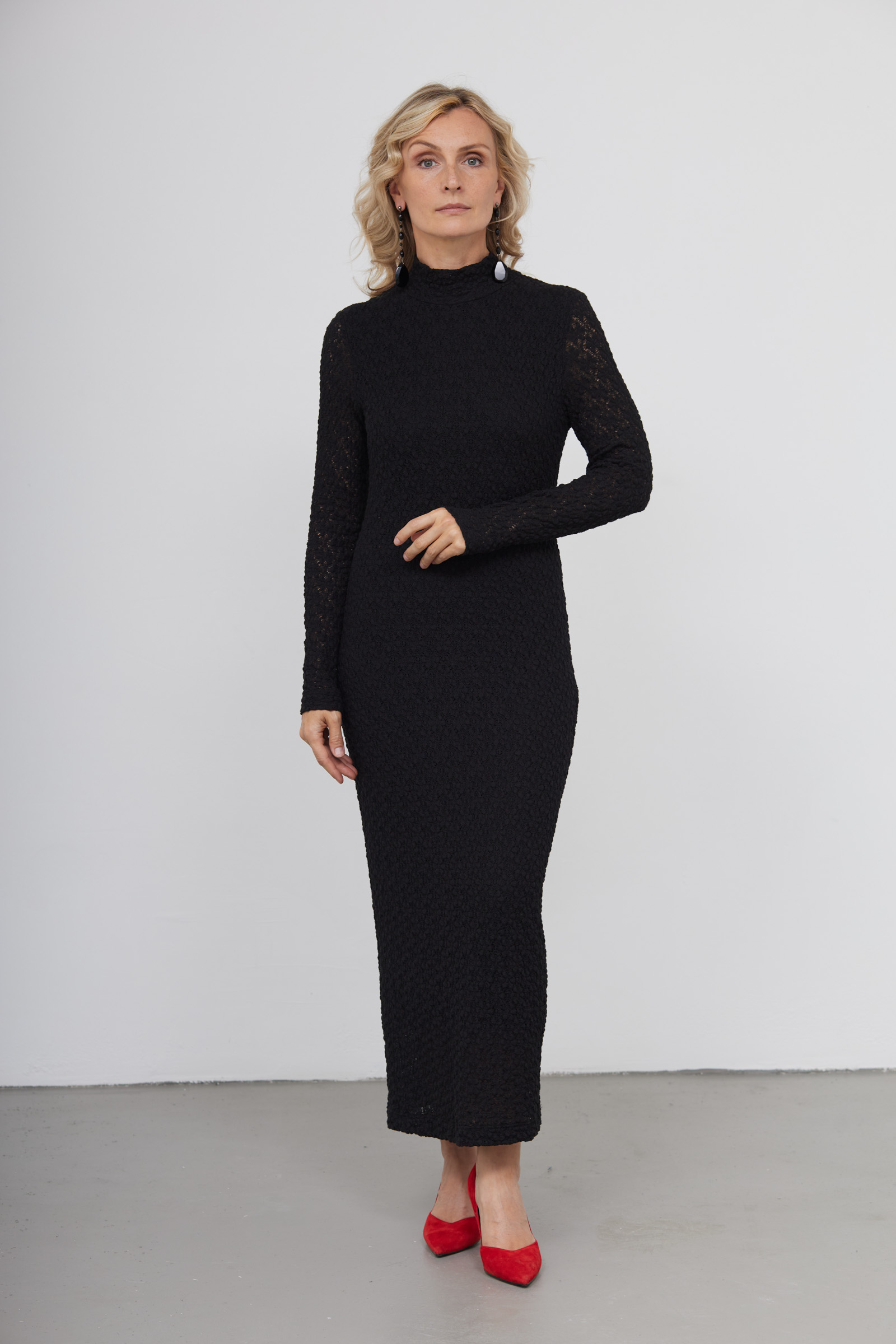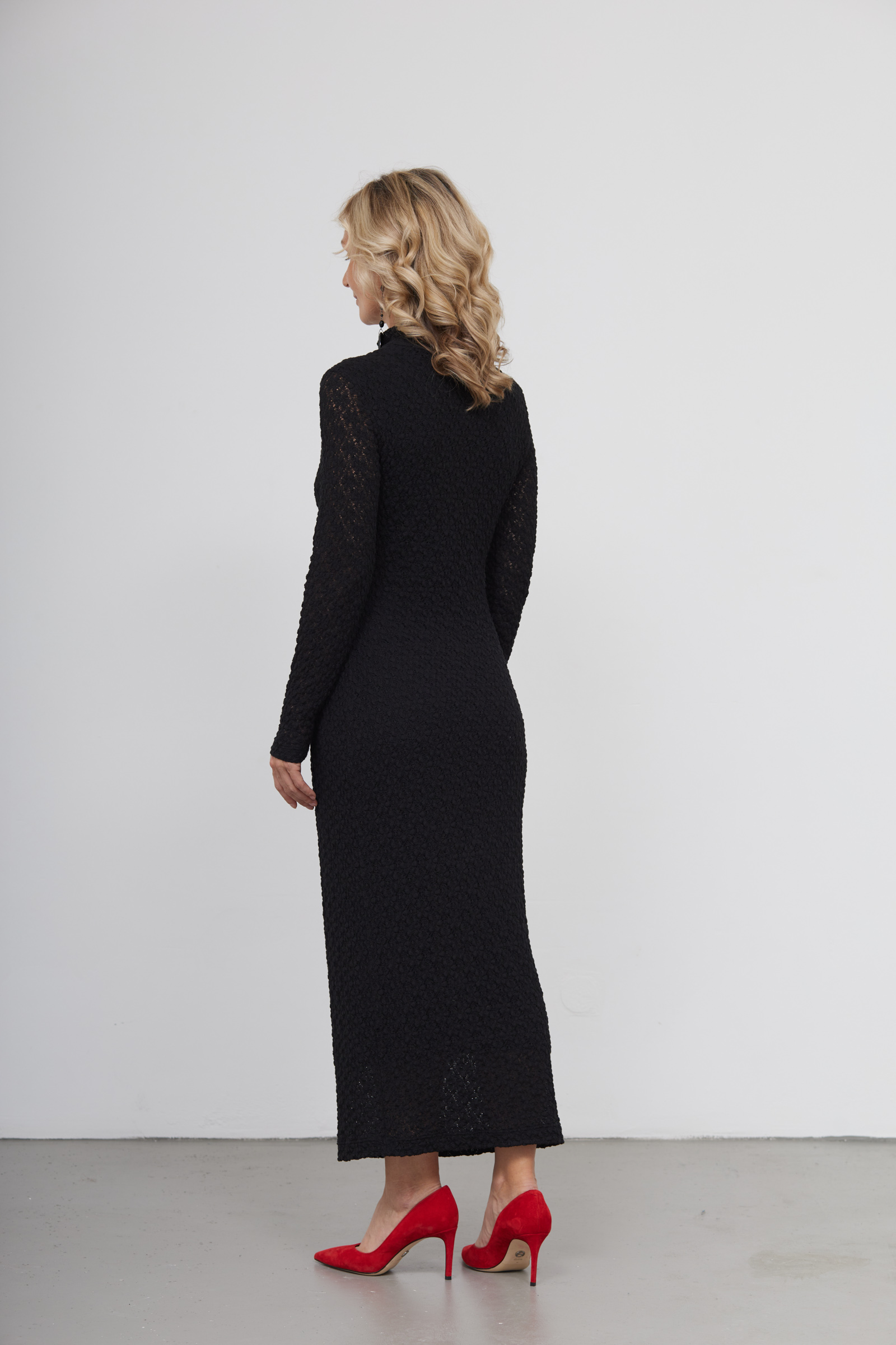 Длинное облегающее платье из эластичной кружевной ткани.