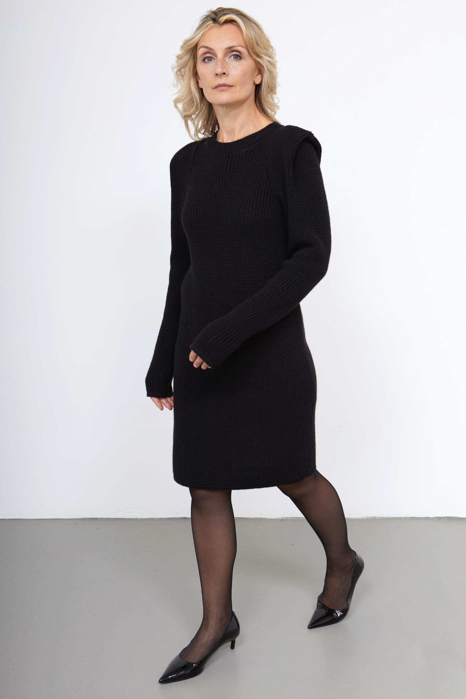 Короткое вязаное платье с шерстью и акцентными плечами.