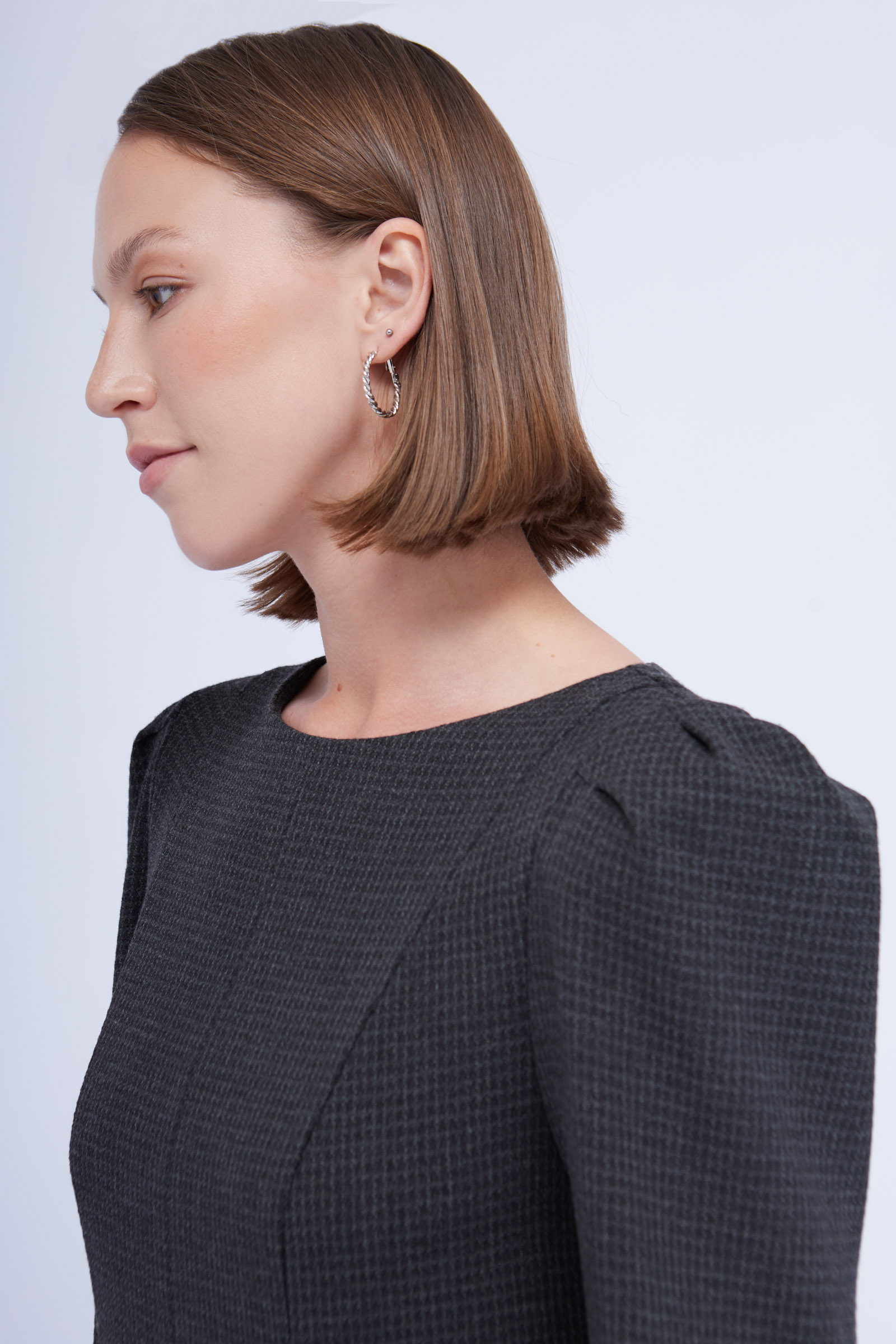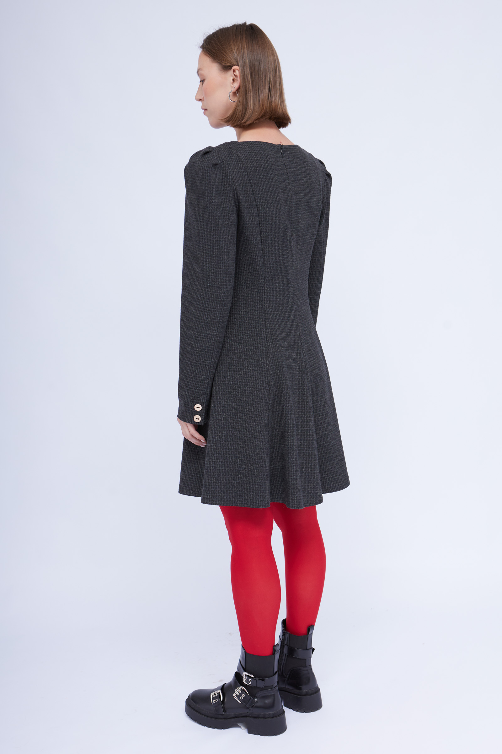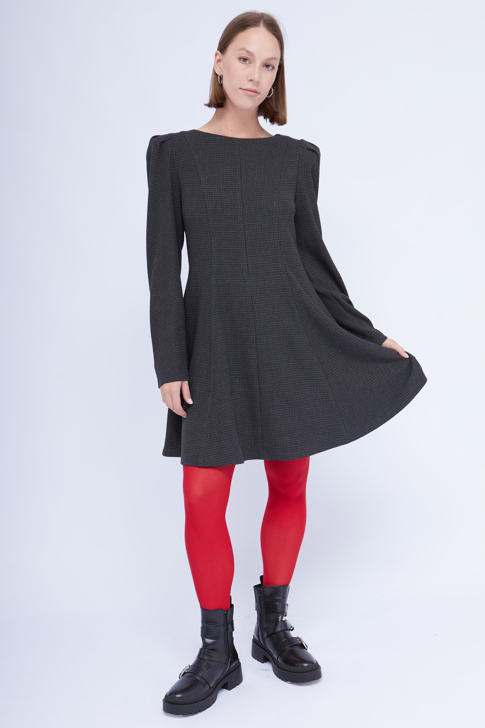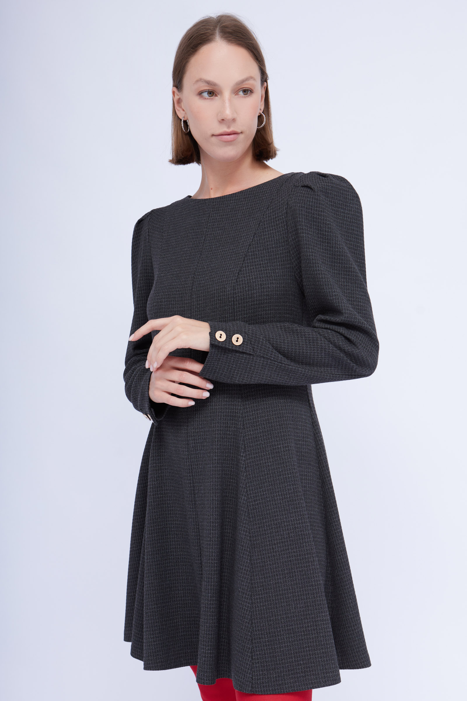 Короткое платье из смесовой вискозы с рельефными швами и акцентными плечами.