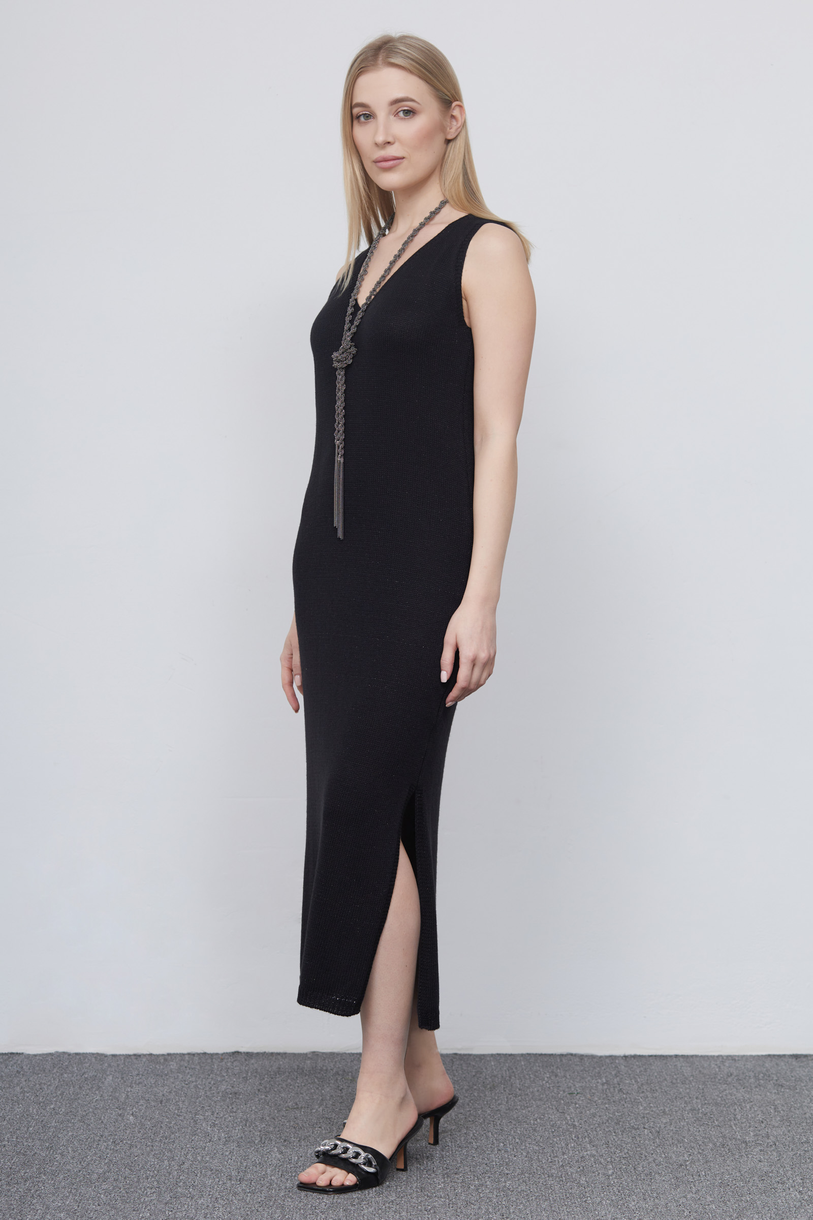 Платье без рукавов из мягкого вязаного трикотажа с люрексом.