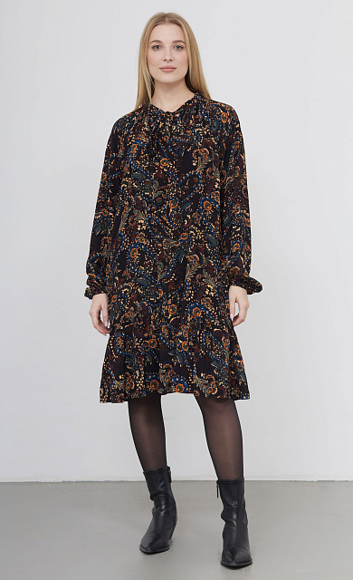 Комбинированное платье с верхей частью из трикотажа жаккардовой вязки и юбкой из смесовой вискозы.